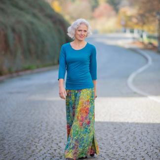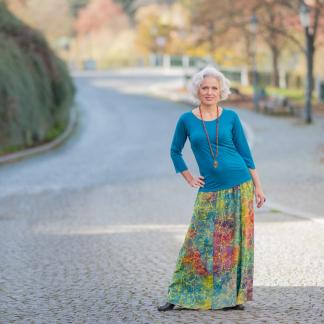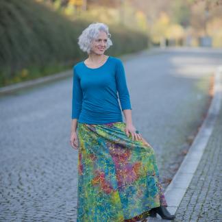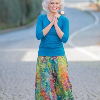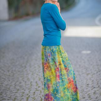 Připravte se na to, že touto úchvatnou, dlouhou sukní přitáhnete pozornost! Sukně je ušitá z lehké viskózové látky a pyšní se nádherným batikovým vzorem.