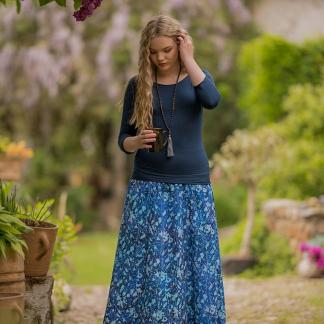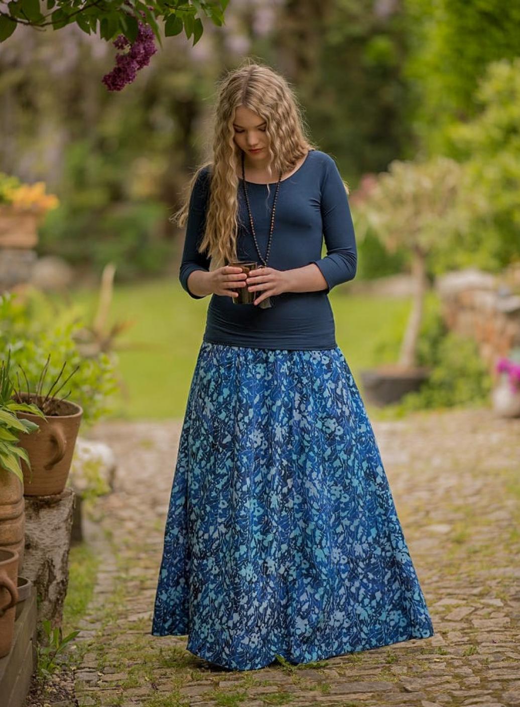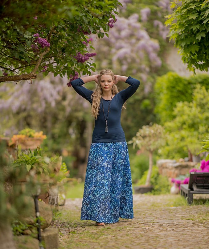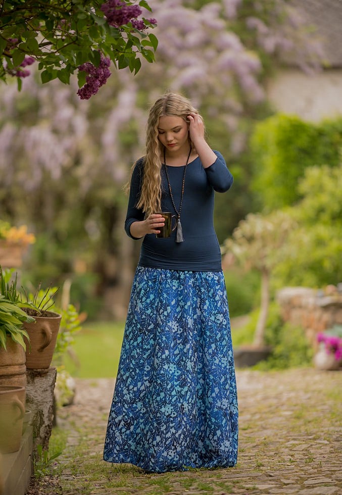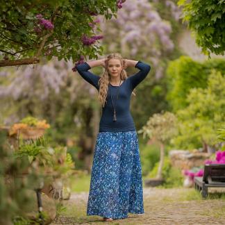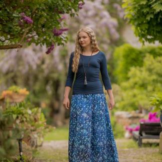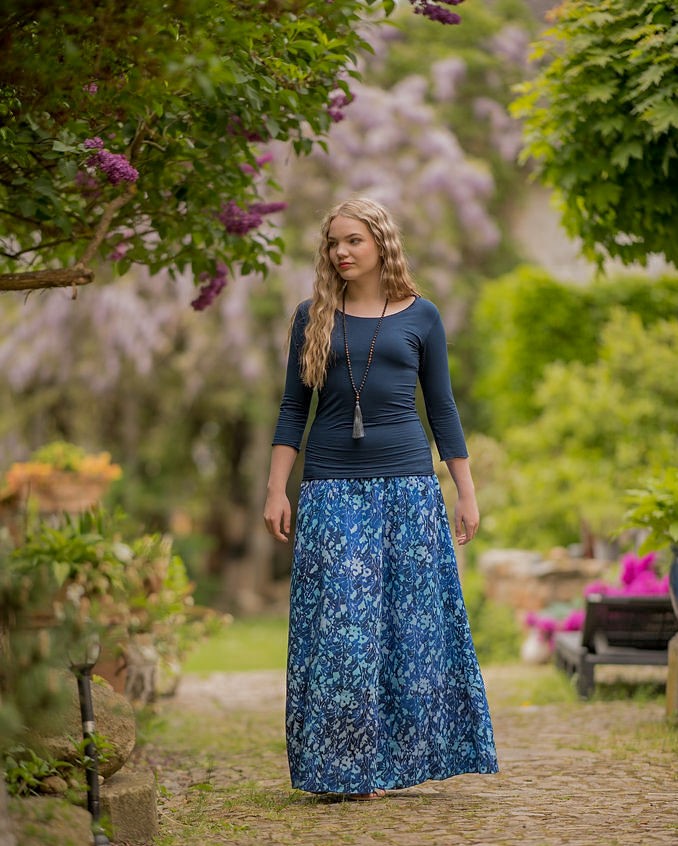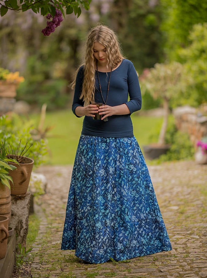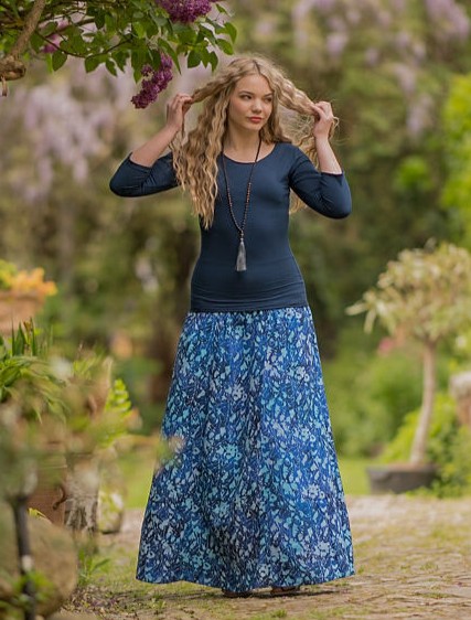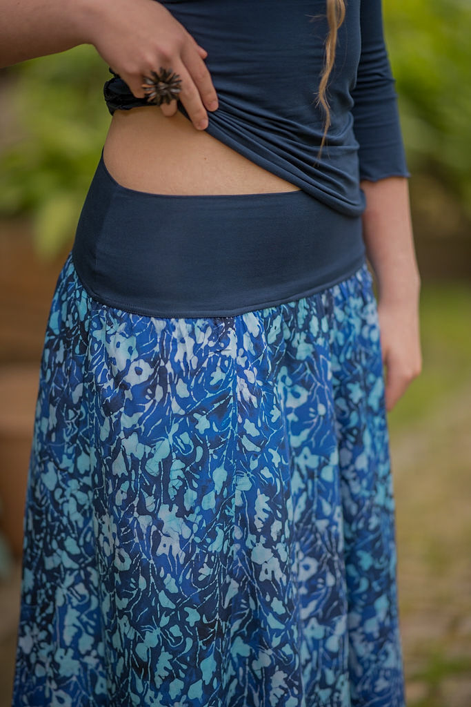Vysoký elastický pas je nesmírně pohodlný na nošení. Sukně je vhodná i pro těhotné, pružný náplet v pase se krásně přizpůsobí bříšku a obejme ho po celém jeho obvodu. Ikonická Pacha sukně s délkou až na zem se krásně vlní při chůzi a vytváří ženskou siluetu.