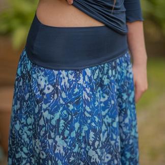 Barva sukně: tmavě modrá se vzorem ve světlem modrých odstínech.