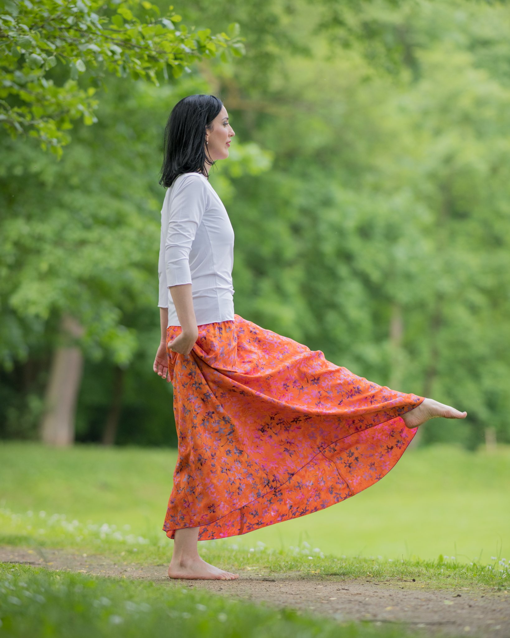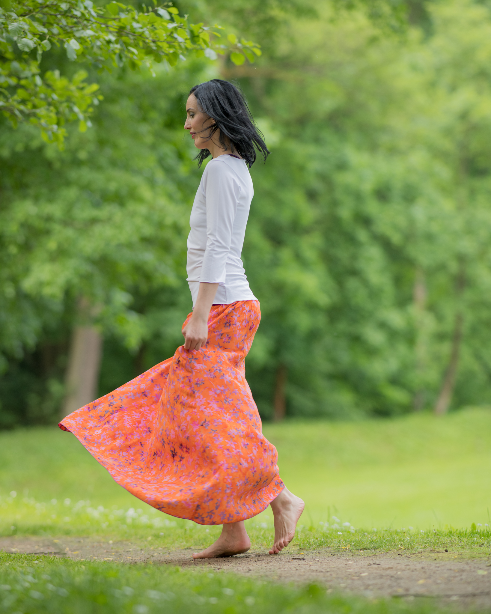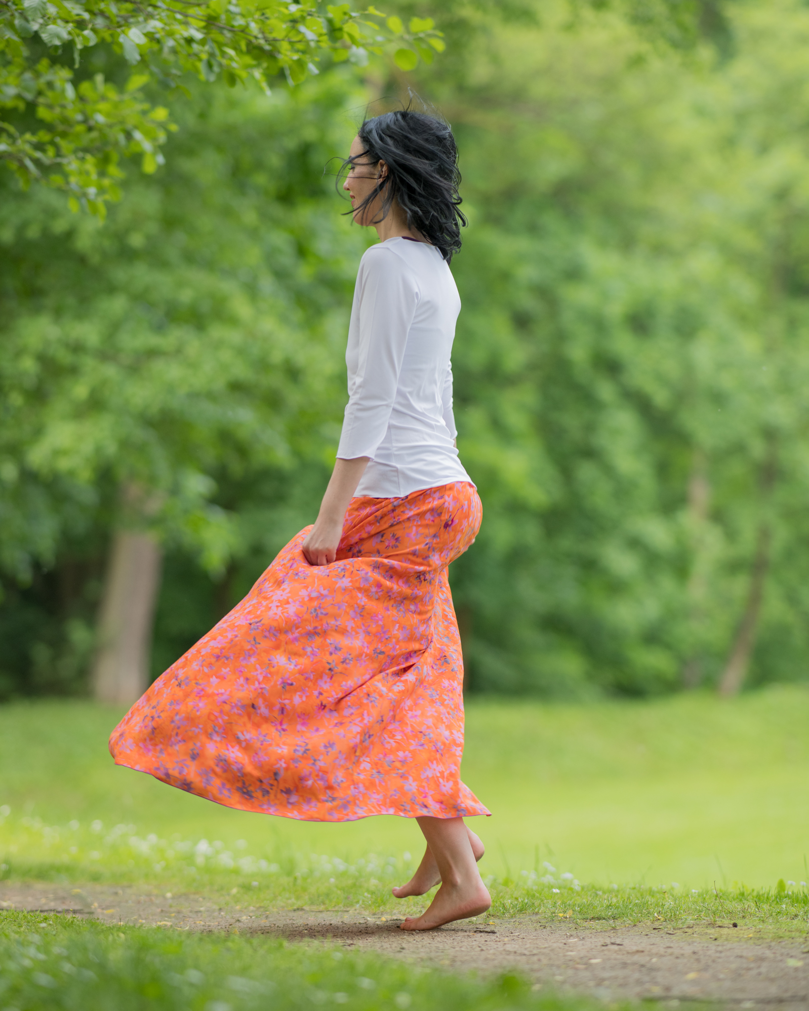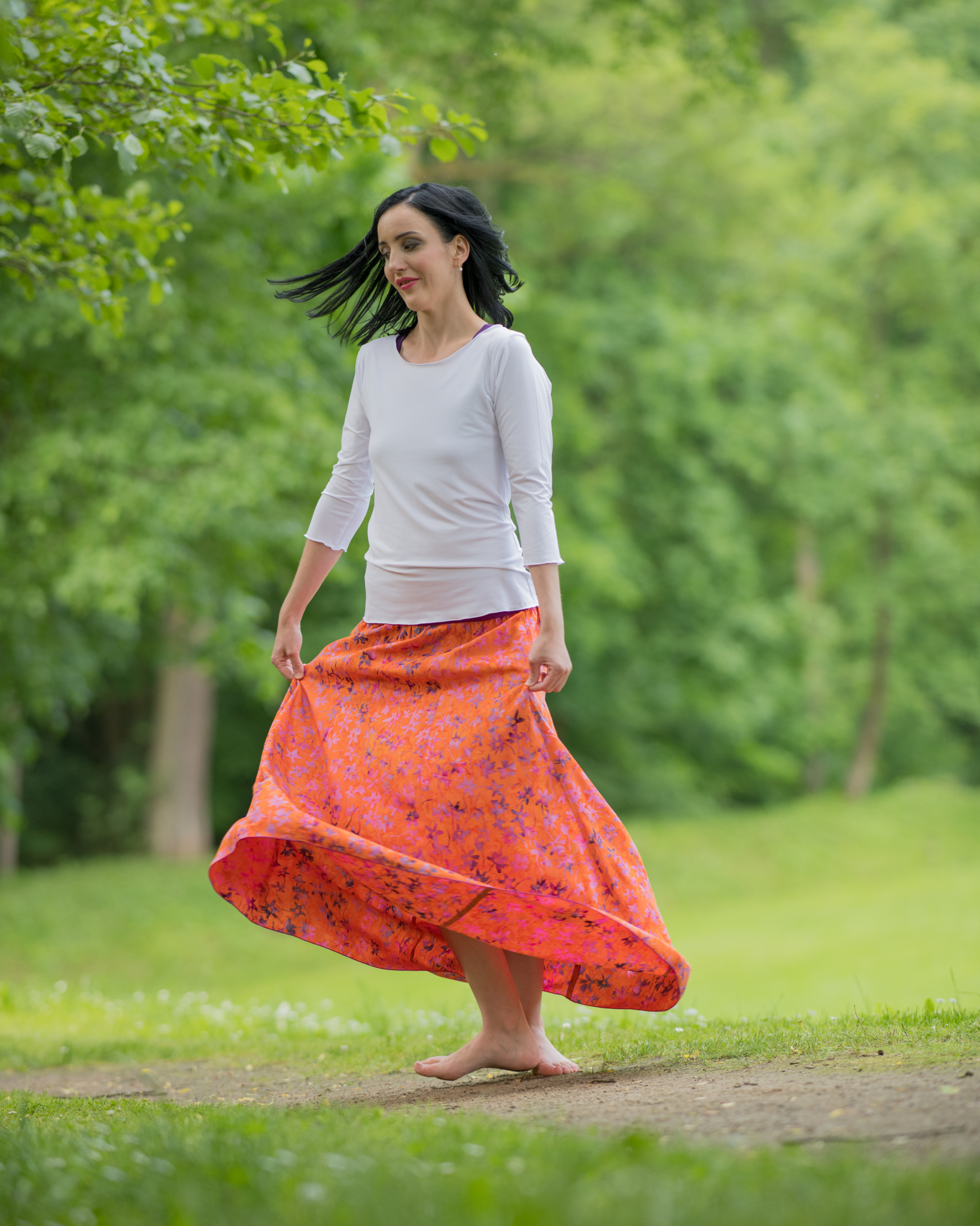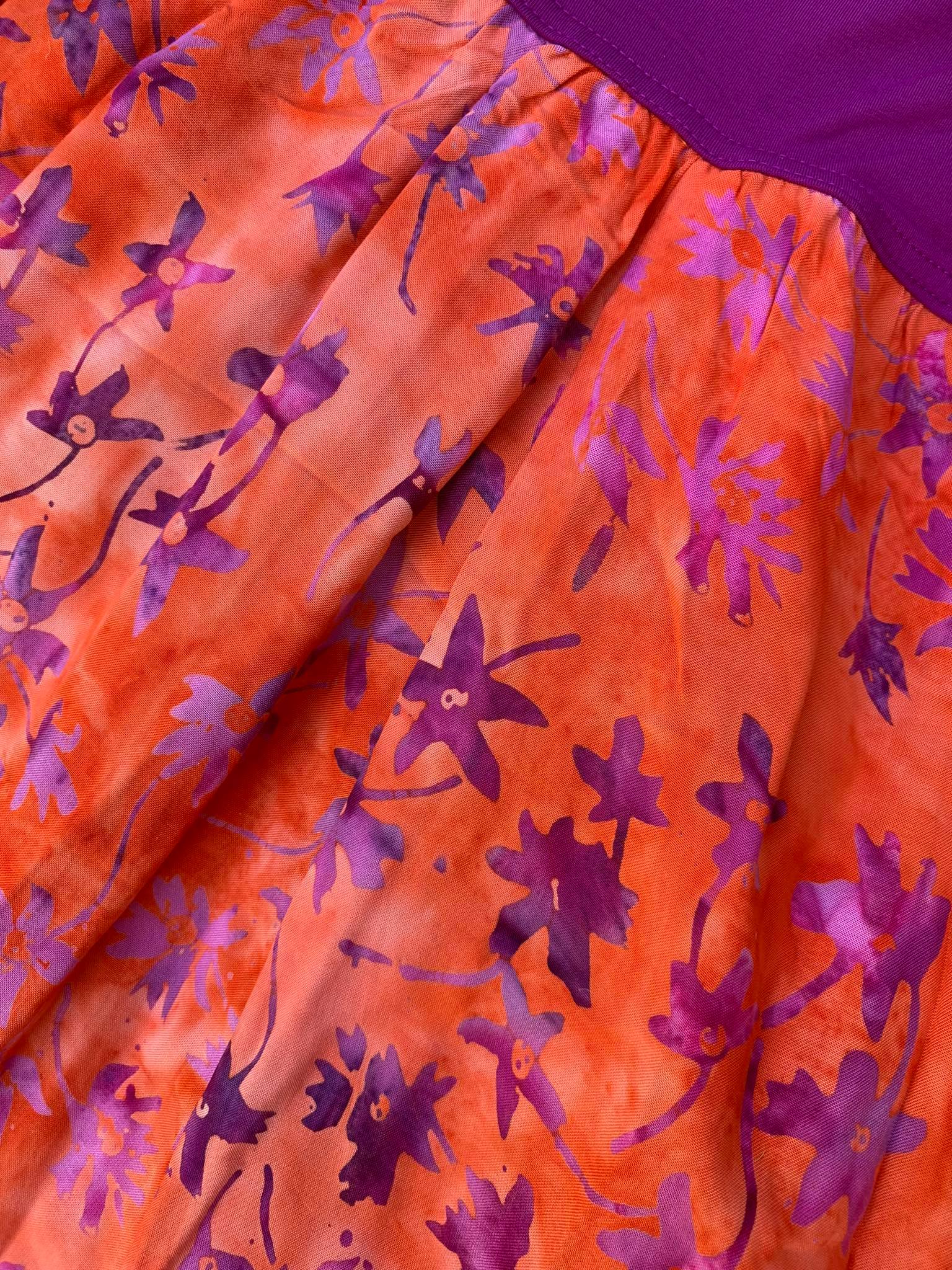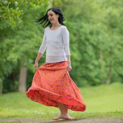 Barva sukně: oranžová s růžovofialovými květy.