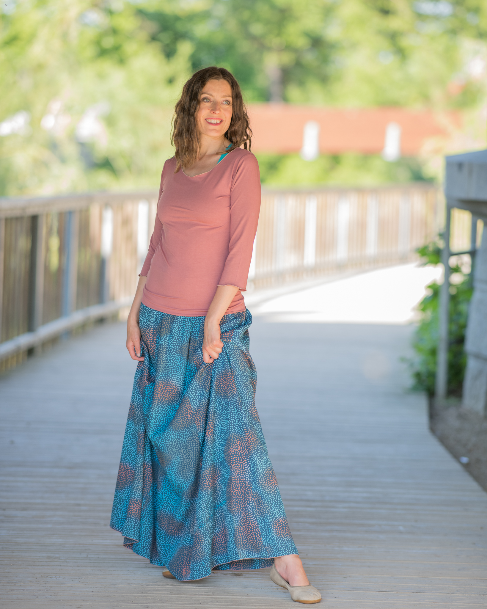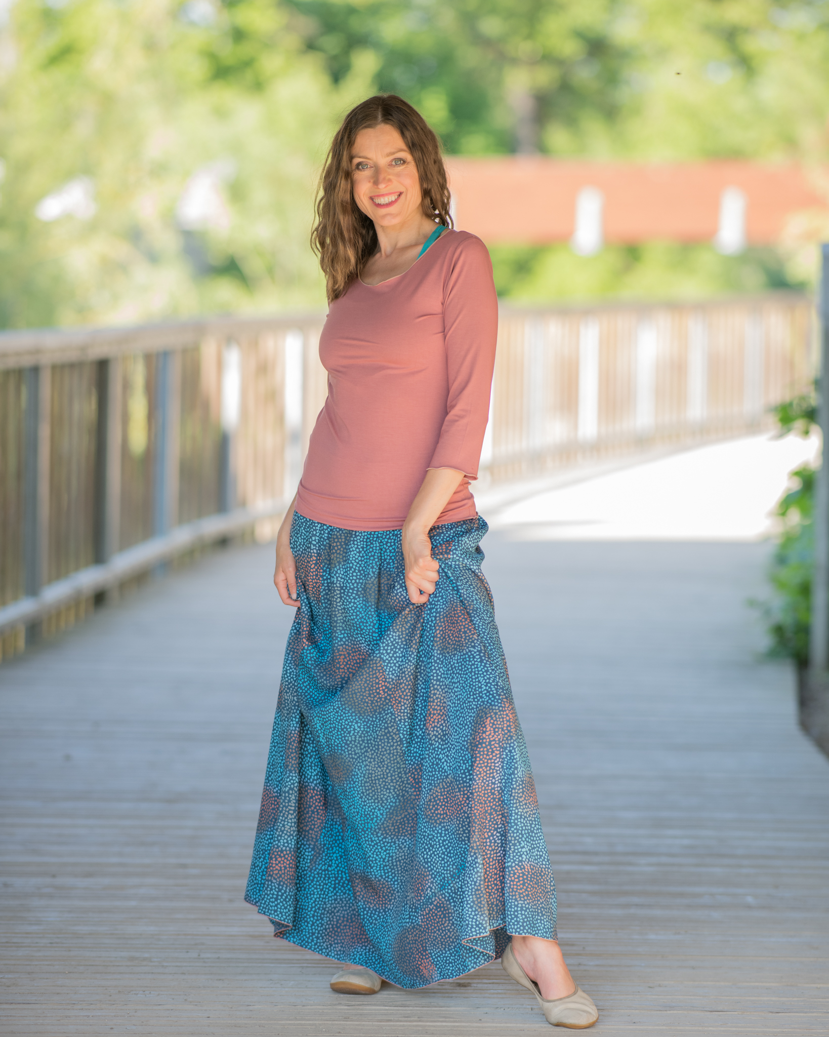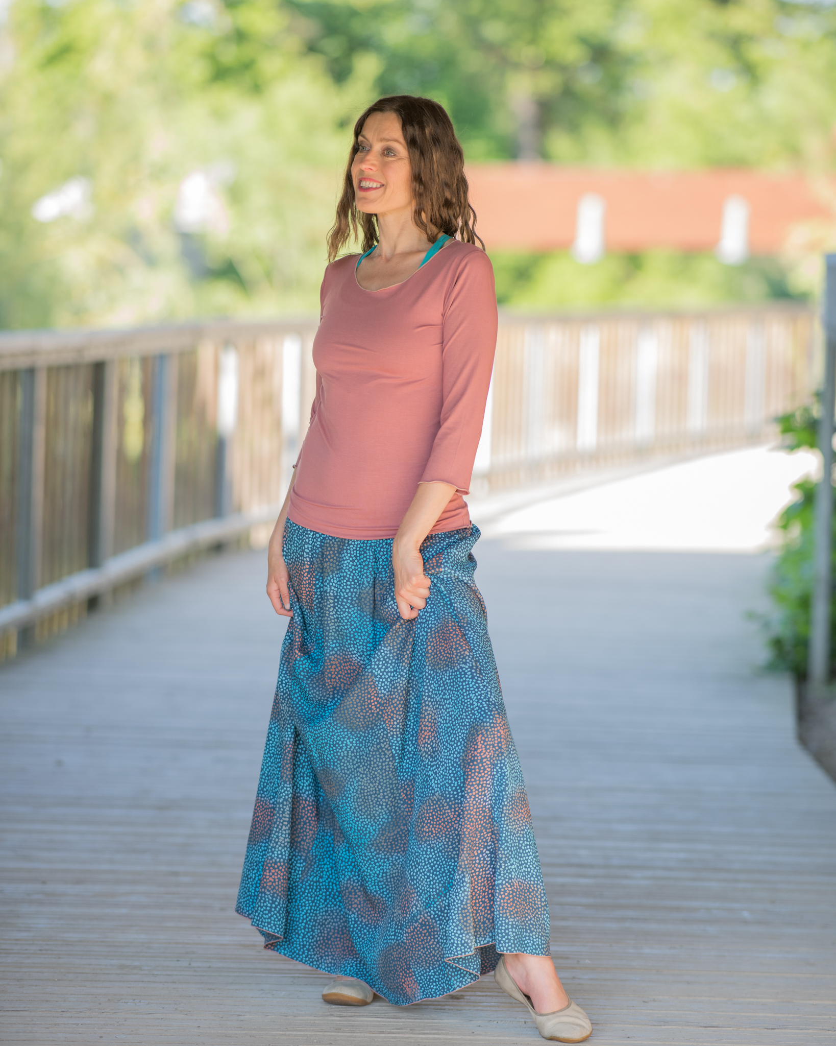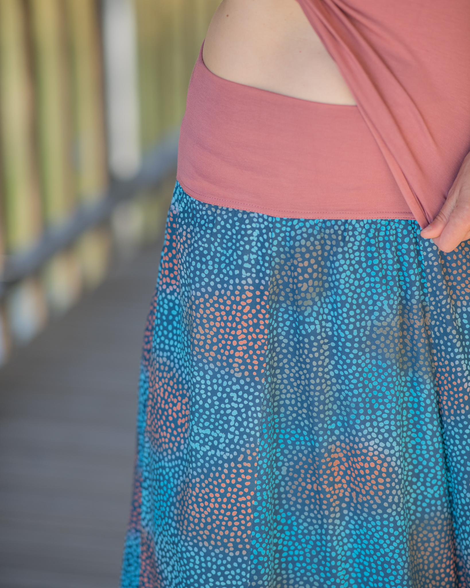 Vysoký elastický pas je nesmírně pohodlný na nošení. Sukně je vhodná i pro těhotné, pružný náplet v pase se krásně přizpůsobí bříšku a obejme ho po celém jeho obvodu. Ikonická Pacha sukně s délkou až na zem se krásně vlní při chůzi a vytváří ženskou siluetu.
