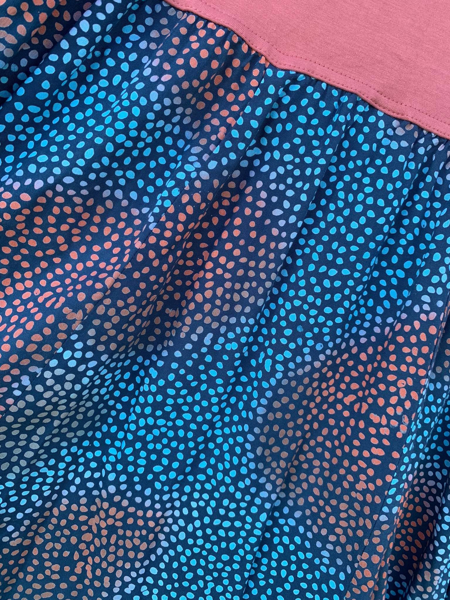 Barva sukně: odstíny modré a lososové.