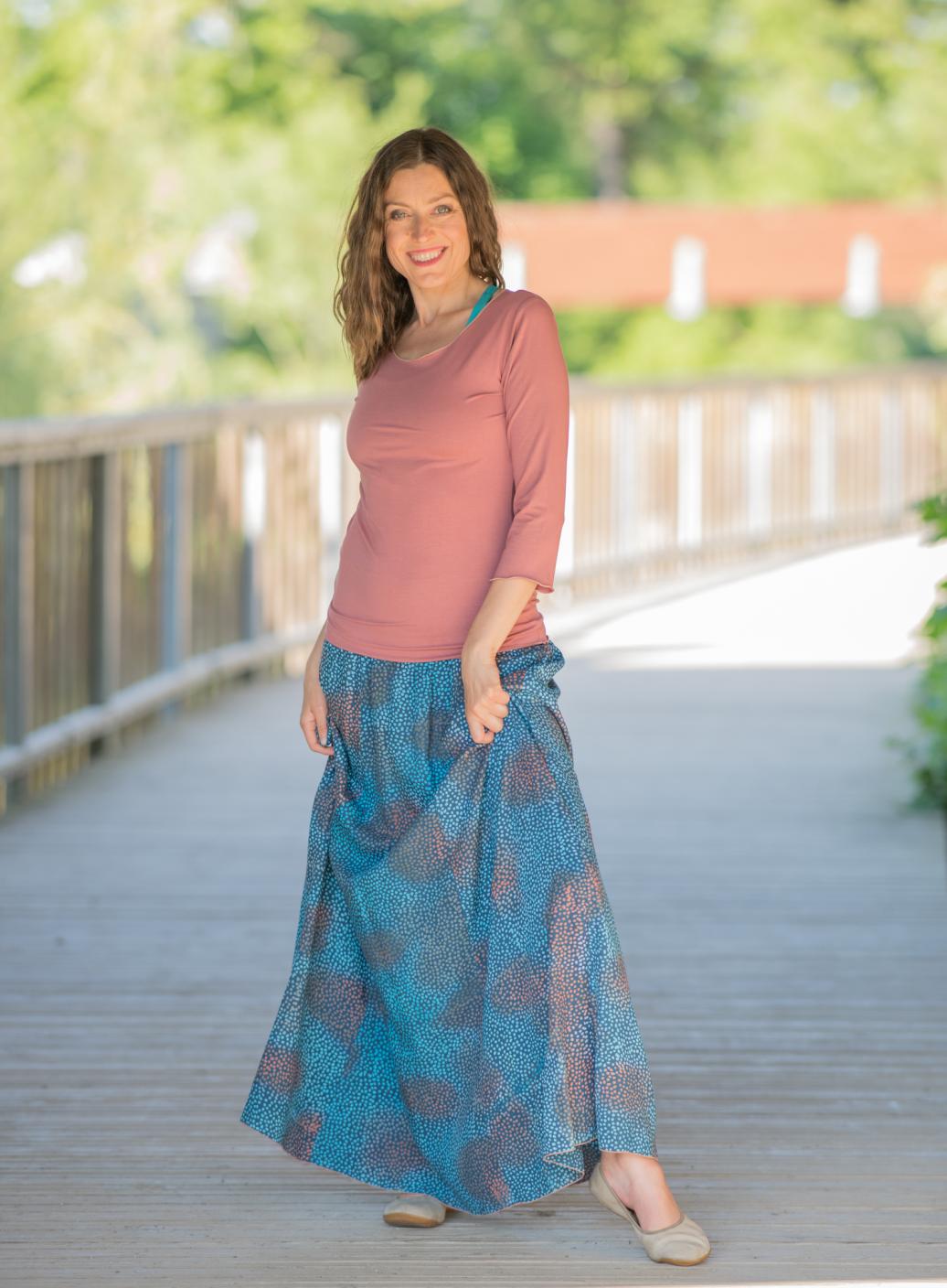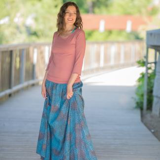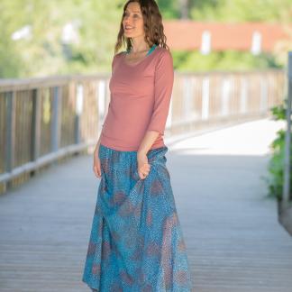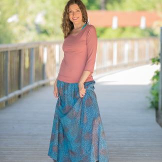 Vysoký elastický pas je nesmírně pohodlný na nošení. Sukně je vhodná i pro těhotné, pružný náplet v pase se krásně přizpůsobí bříšku a obejme ho po celém jeho obvodu. Ikonická Pacha sukně s délkou až na zem se krásně vlní při chůzi a vytváří ženskou siluetu.