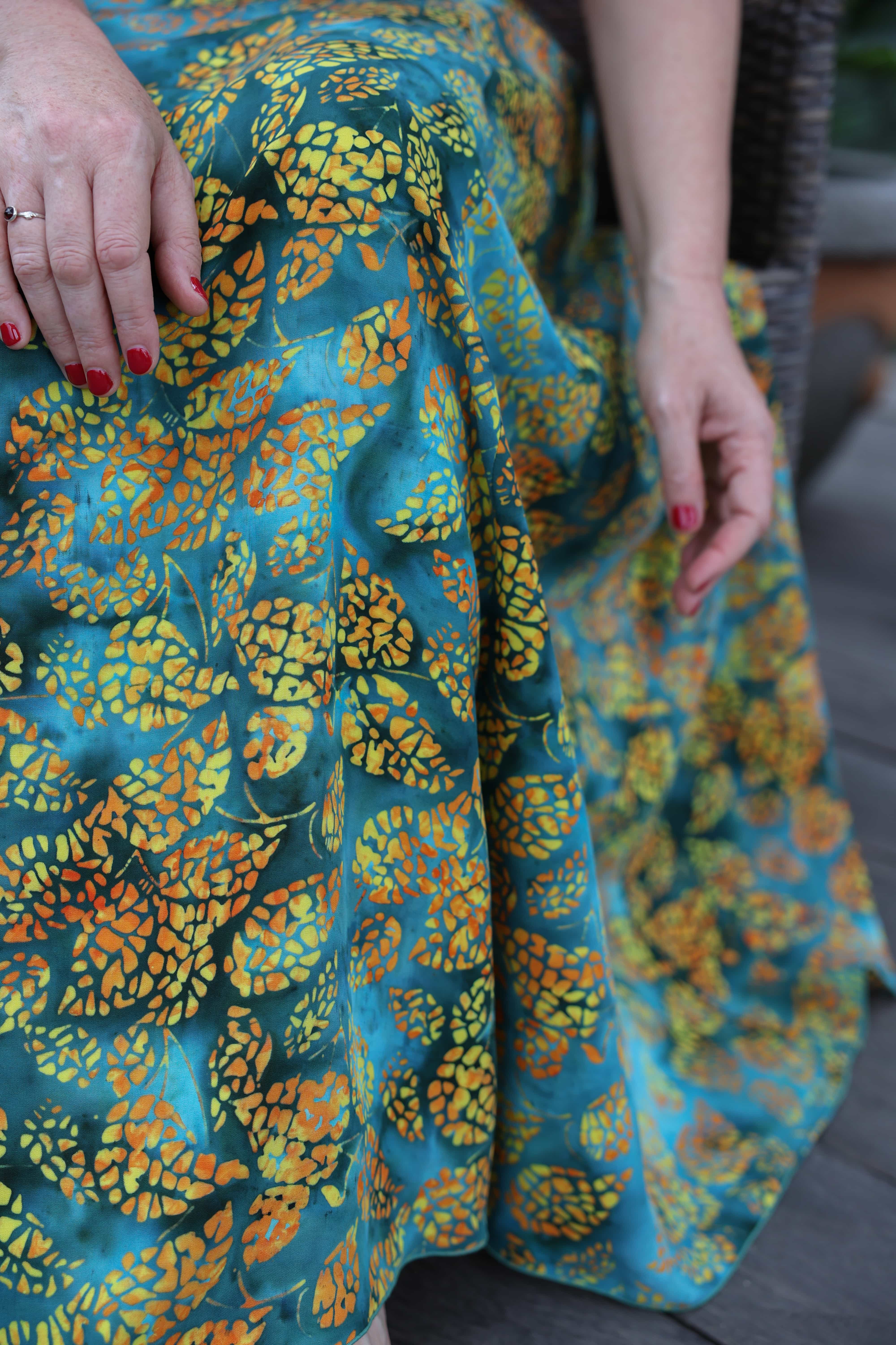 Materiál: 100 % viskóza, vosková batika. Lem: 90 % viskóza + 10% spandex.