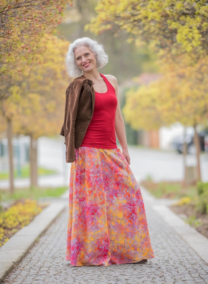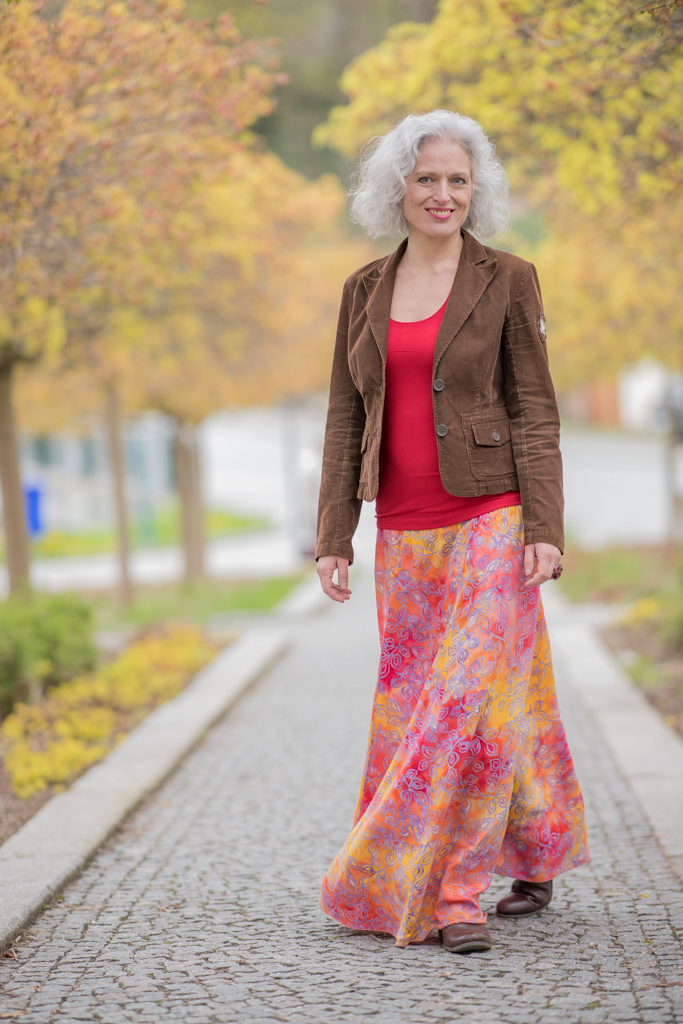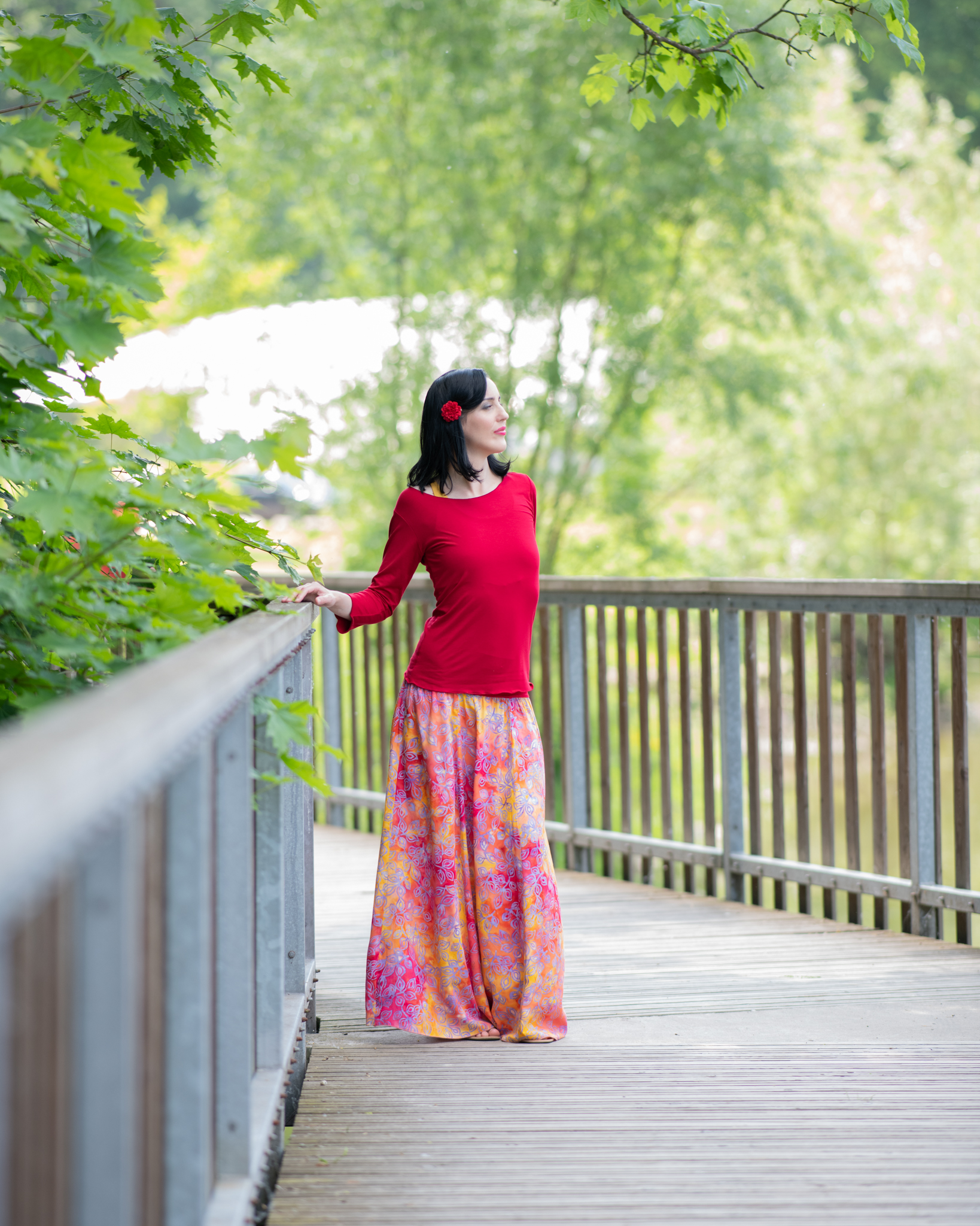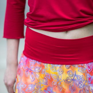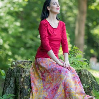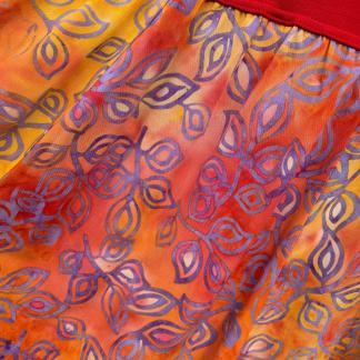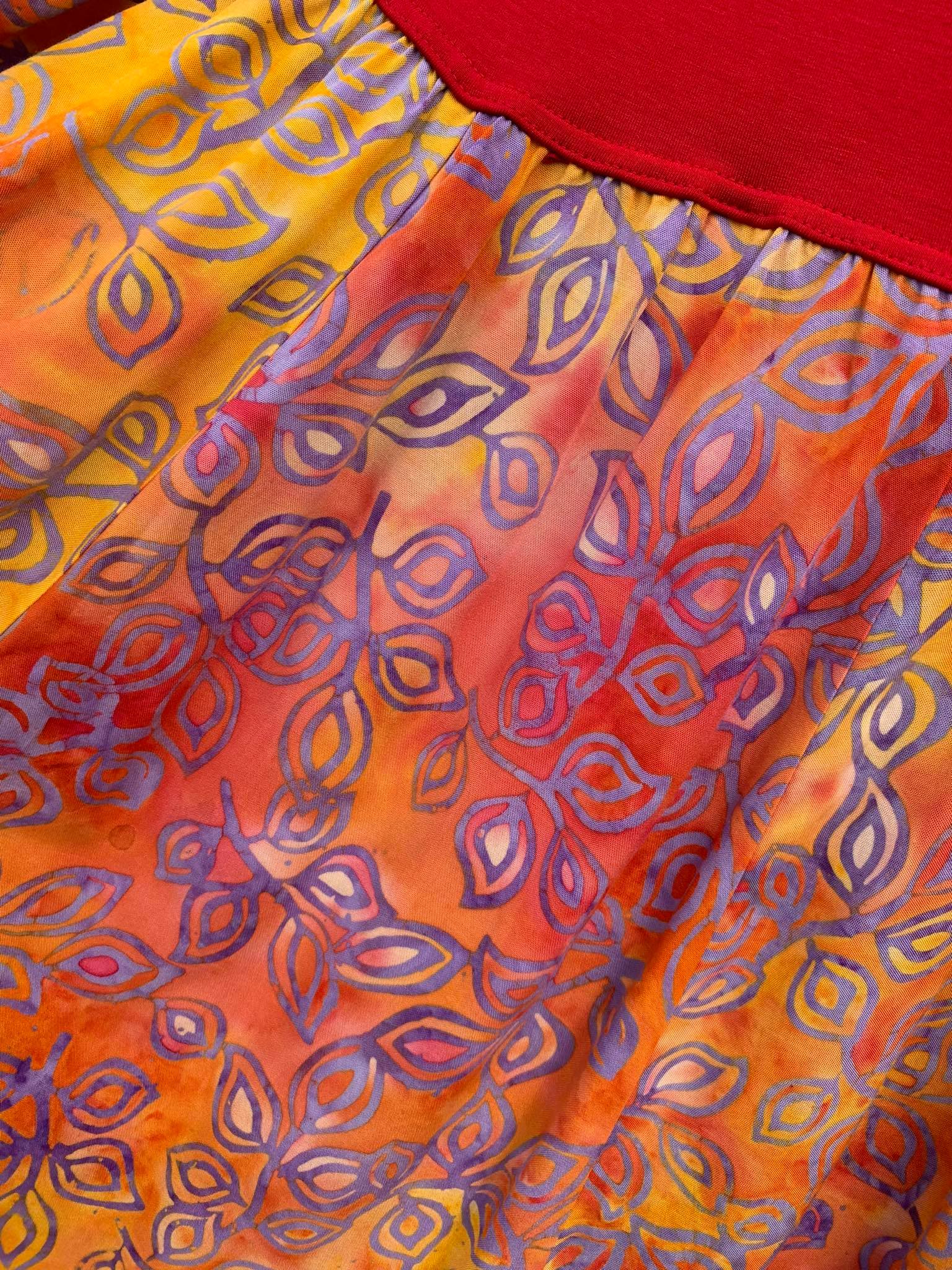 Barva sukně: oranžovo červená se vzorem listů ve světle fialové barvě.