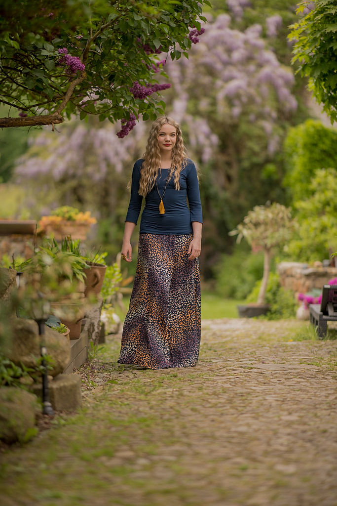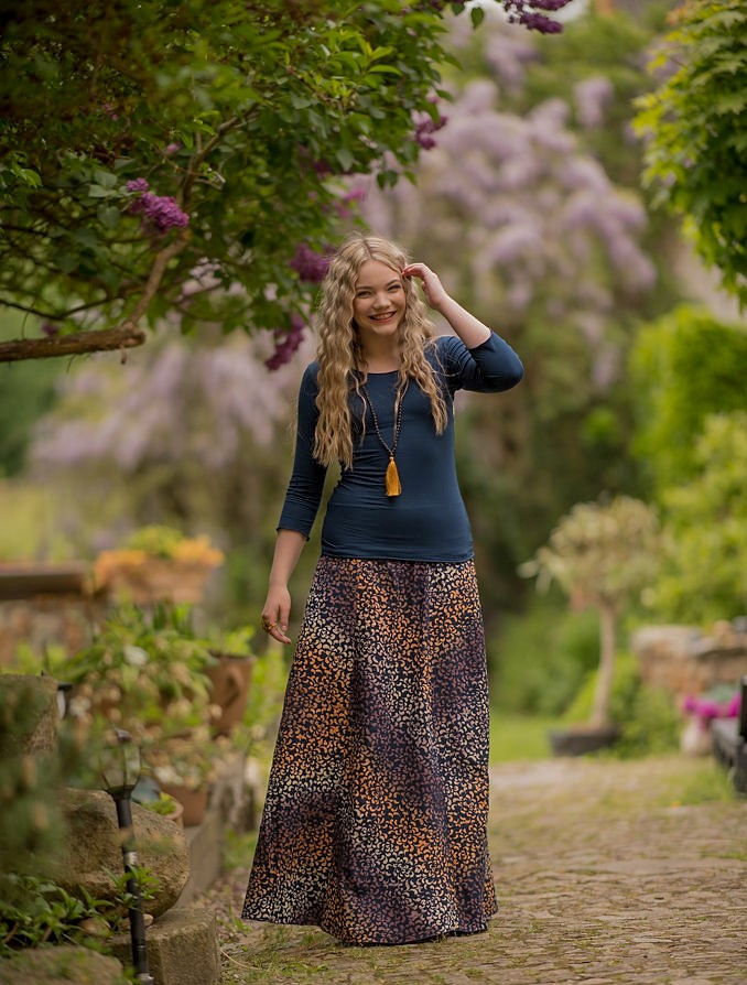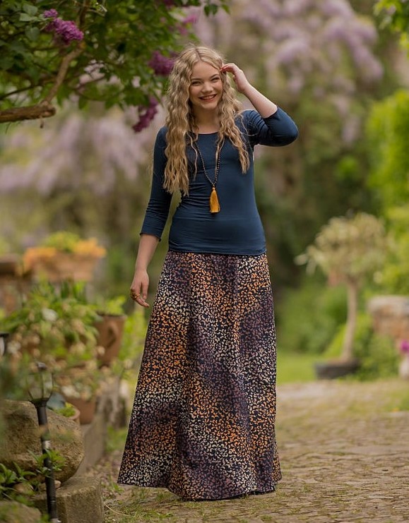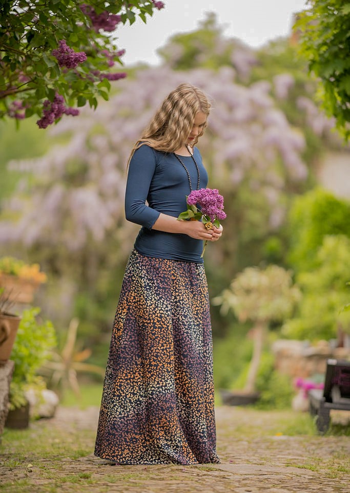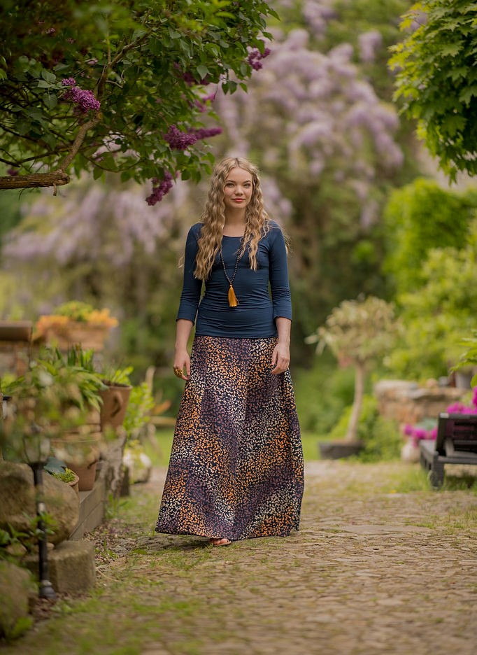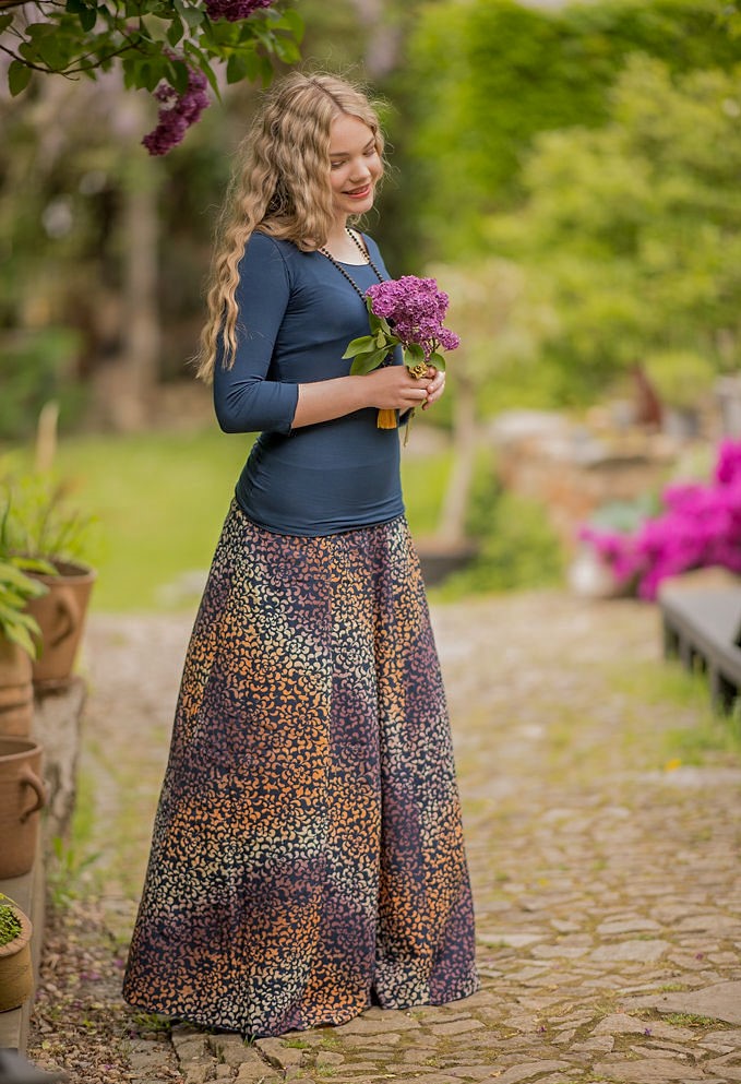 Vysoký elastický pas je nesmírně pohodlný na nošení. Sukně je vhodná i pro těhotné, pružný náplet v pase se krásně přizpůsobí bříšku a obejme ho po celém jeho obvodu. Ikonická Pacha sukně s délkou až na zem se krásně vlní při chůzi a vytváří ženskou siluetu.
