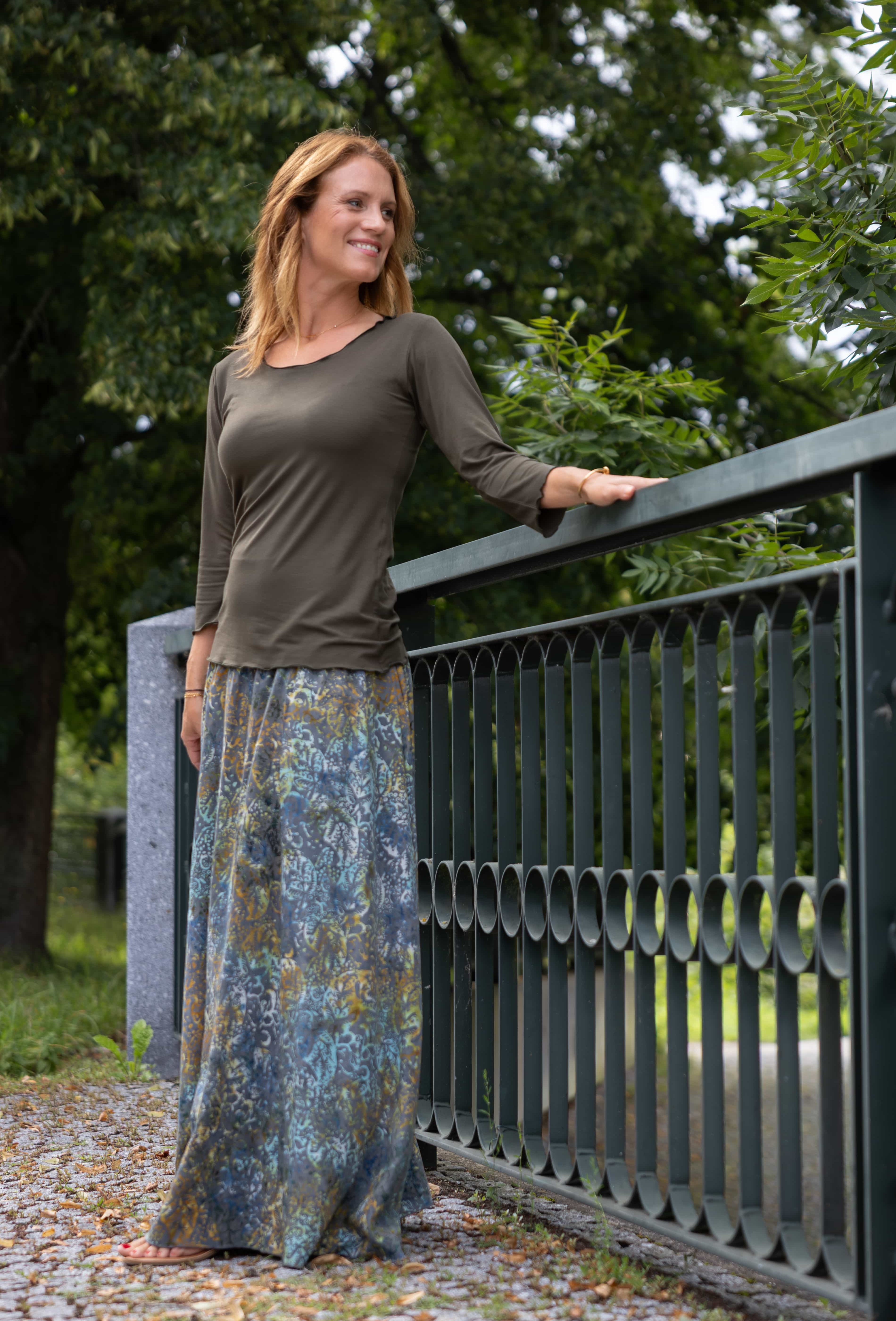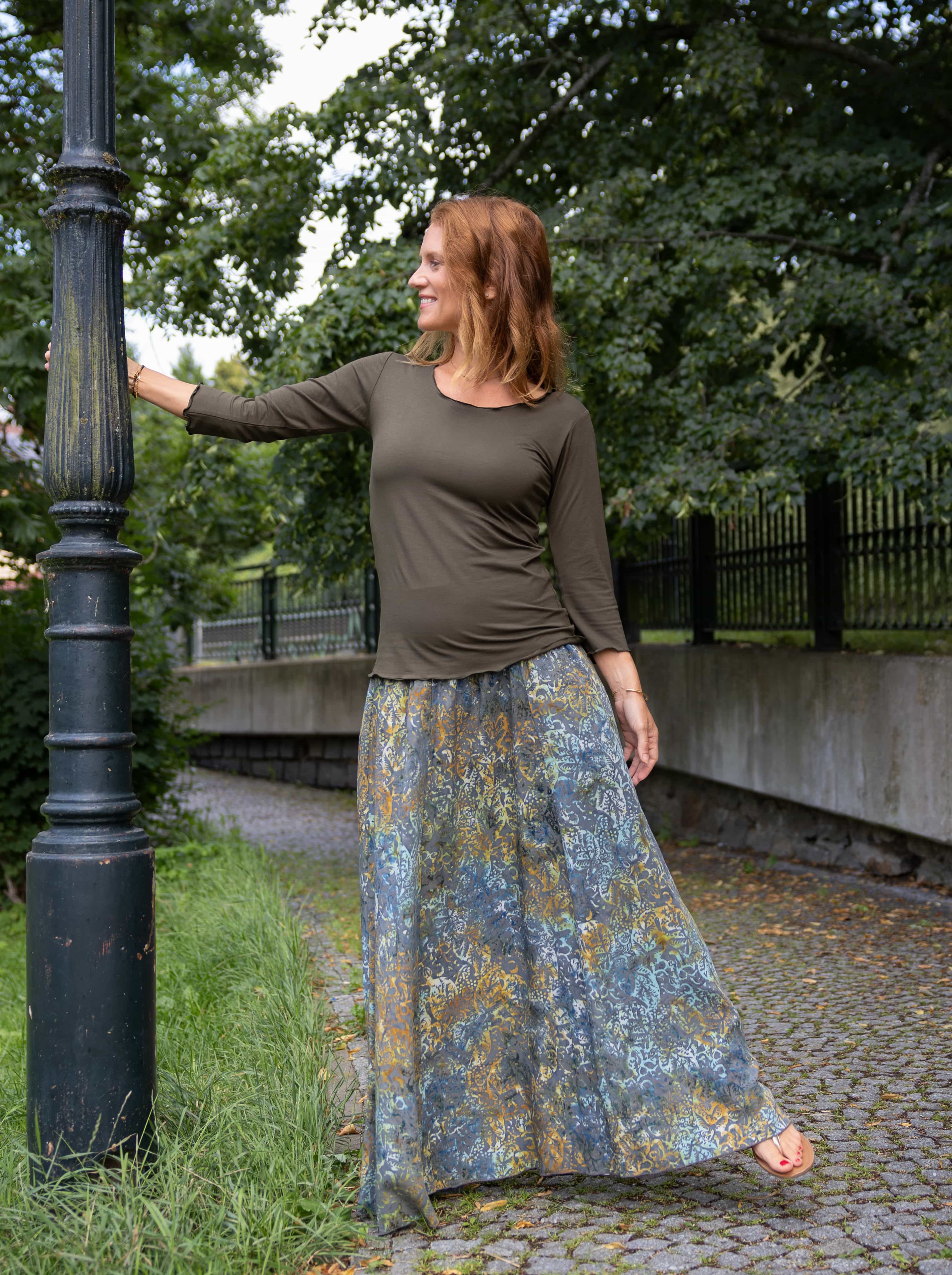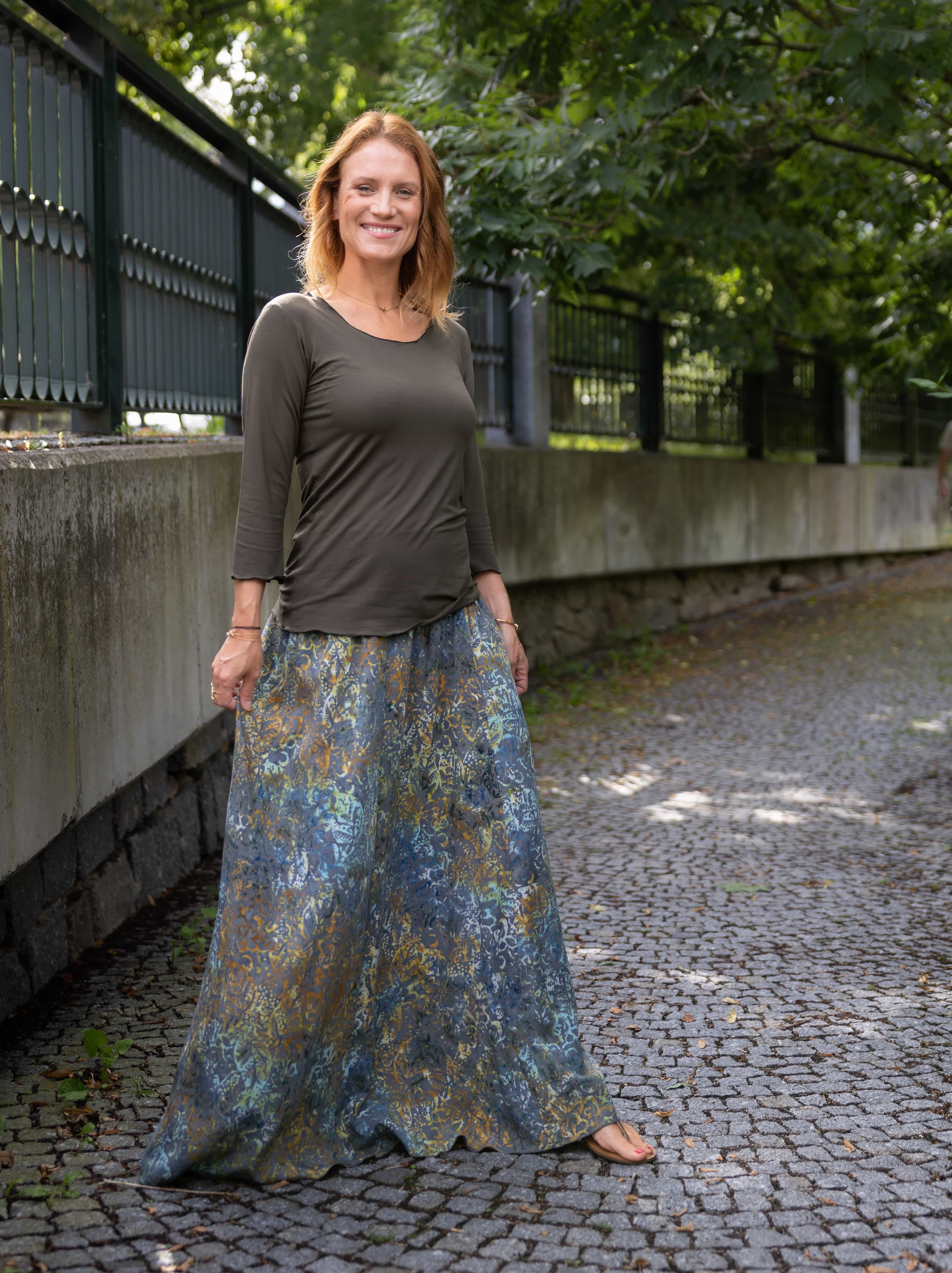 Vysoký elastický pas je nesmírně pohodlný na nošení. Sukně je vhodná i pro těhotné, pružný náplet v pase se krásně přizpůsobí bříšku a obejme ho po celém jeho obvodu. Ikonická Pacha sukně s délkou až na zem se krásně vlní při chůzi a vytváří ženskou siluetu.