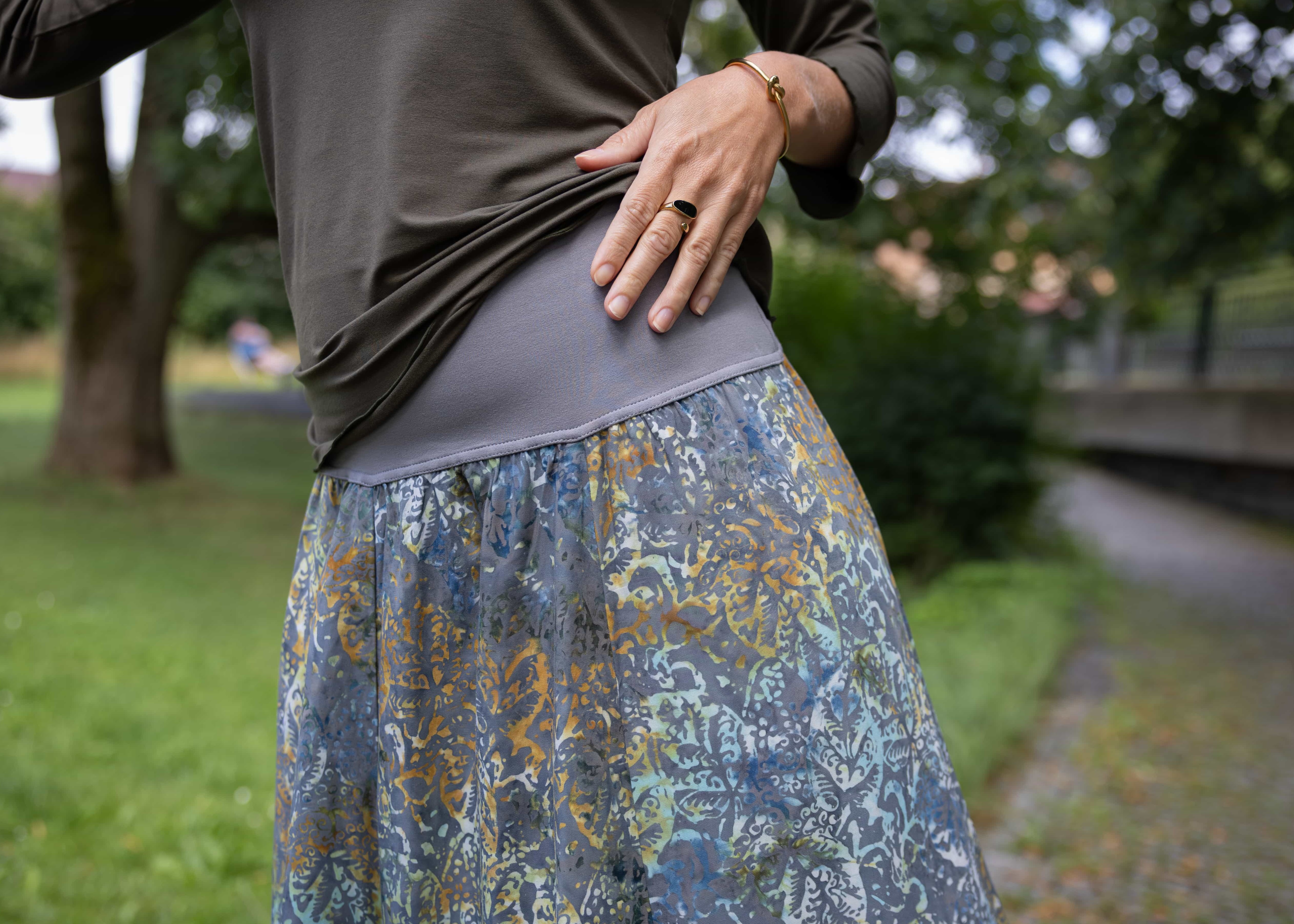 Barva sukně: šedá, modrá se vzorem listů ve zlatých a svělých odstínech