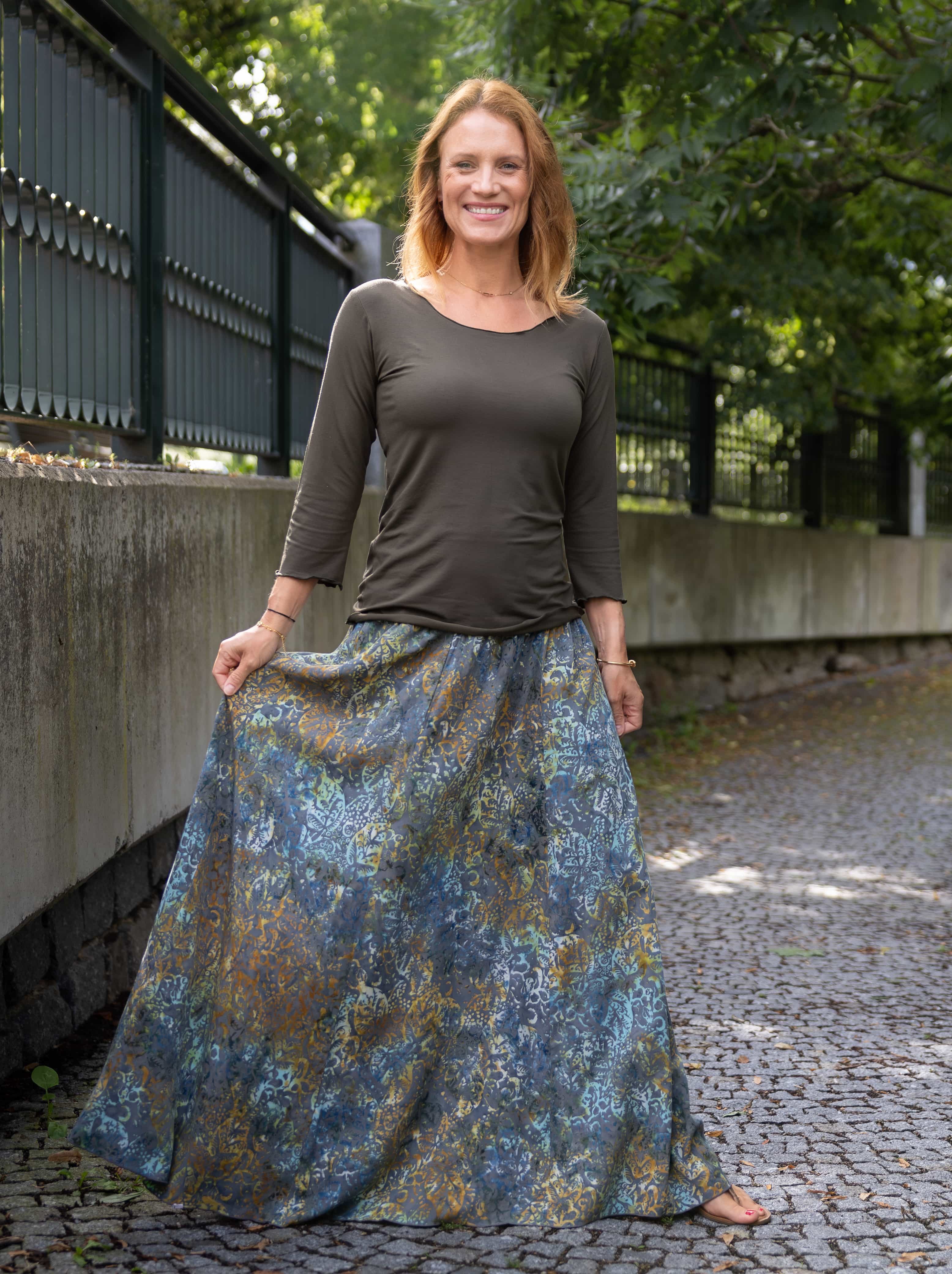 Připravte se na to, že touto úchvatnou, dlouhou sukní přitáhnete pozornost! Sukně je ušitá z lehké viskózové látky a pyšní se nádherným batikovým vzorem.