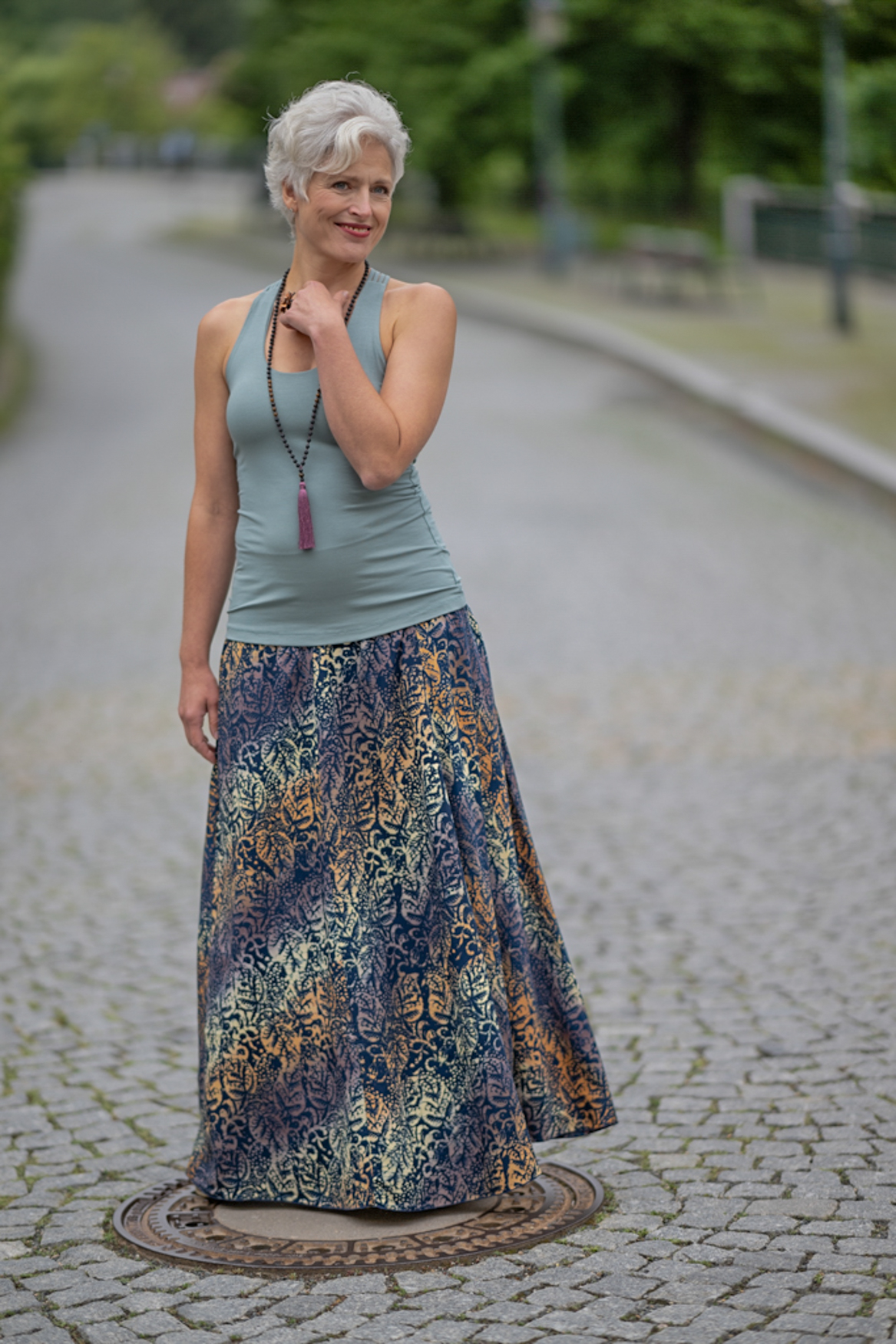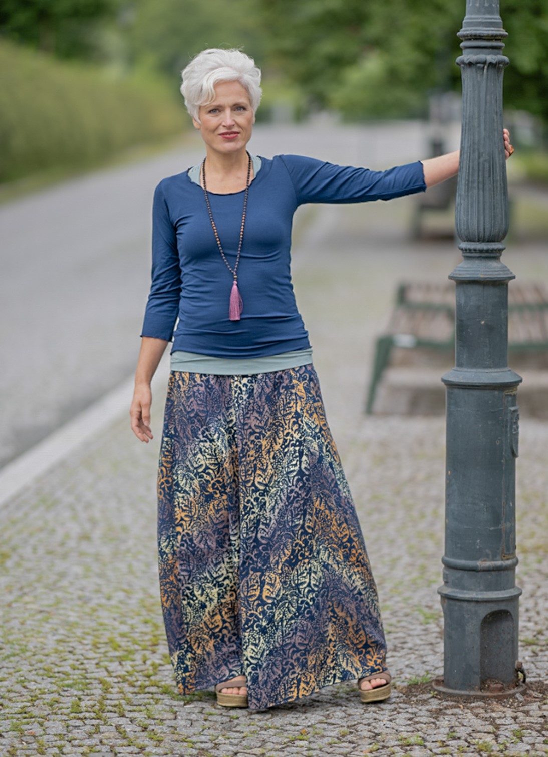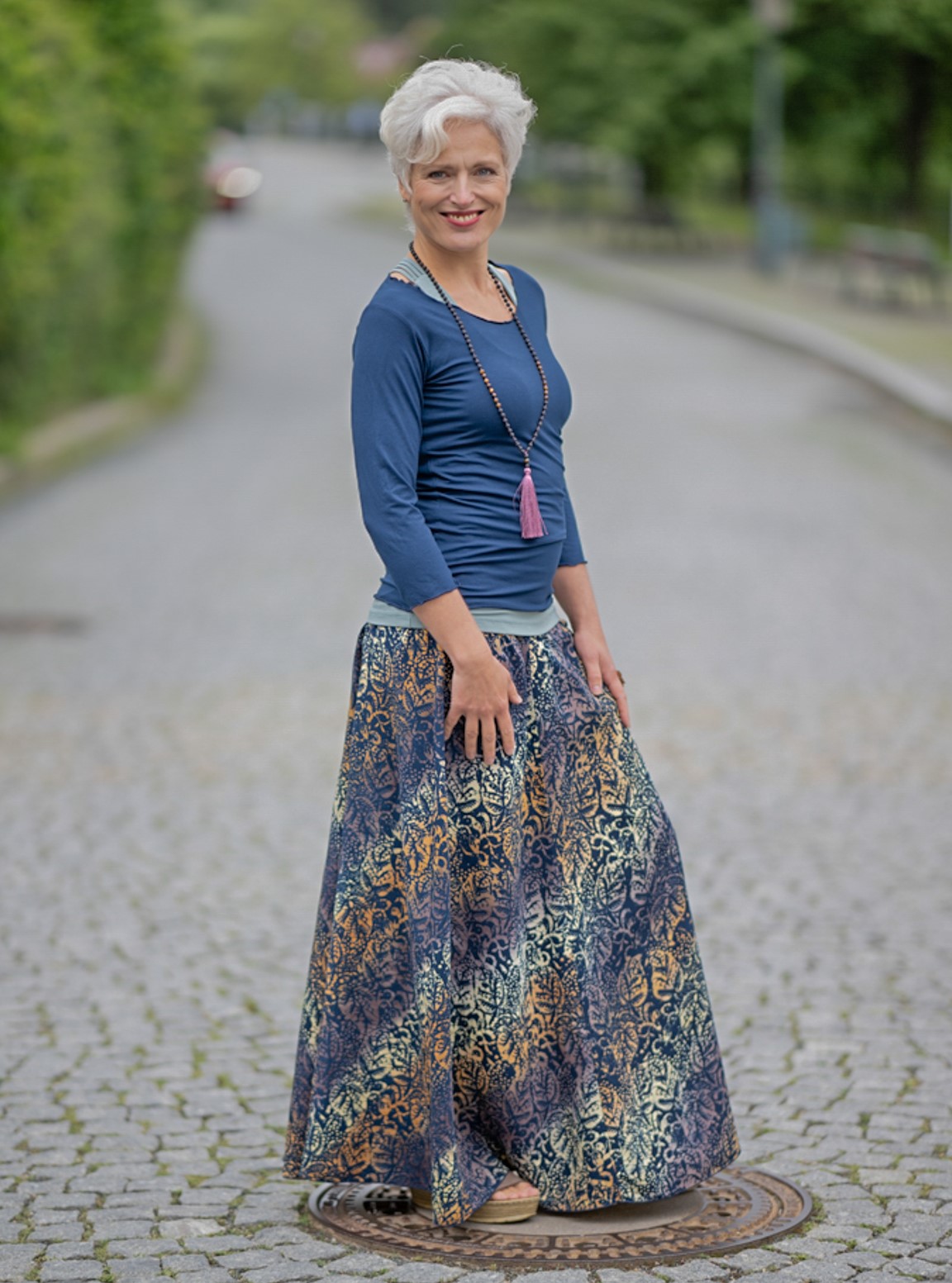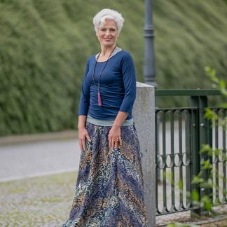 Vysoký elastický pas je nesmírně pohodlný na nošení. Sukně je vhodná i pro těhotné, pružný náplet v pase se krásně přizpůsobí bříšku a obejme ho po celém jeho obvodu. Ikonická Pacha sukně s délkou až na zem se krásně vlní při chůzi a vytváří ženskou siluetu.