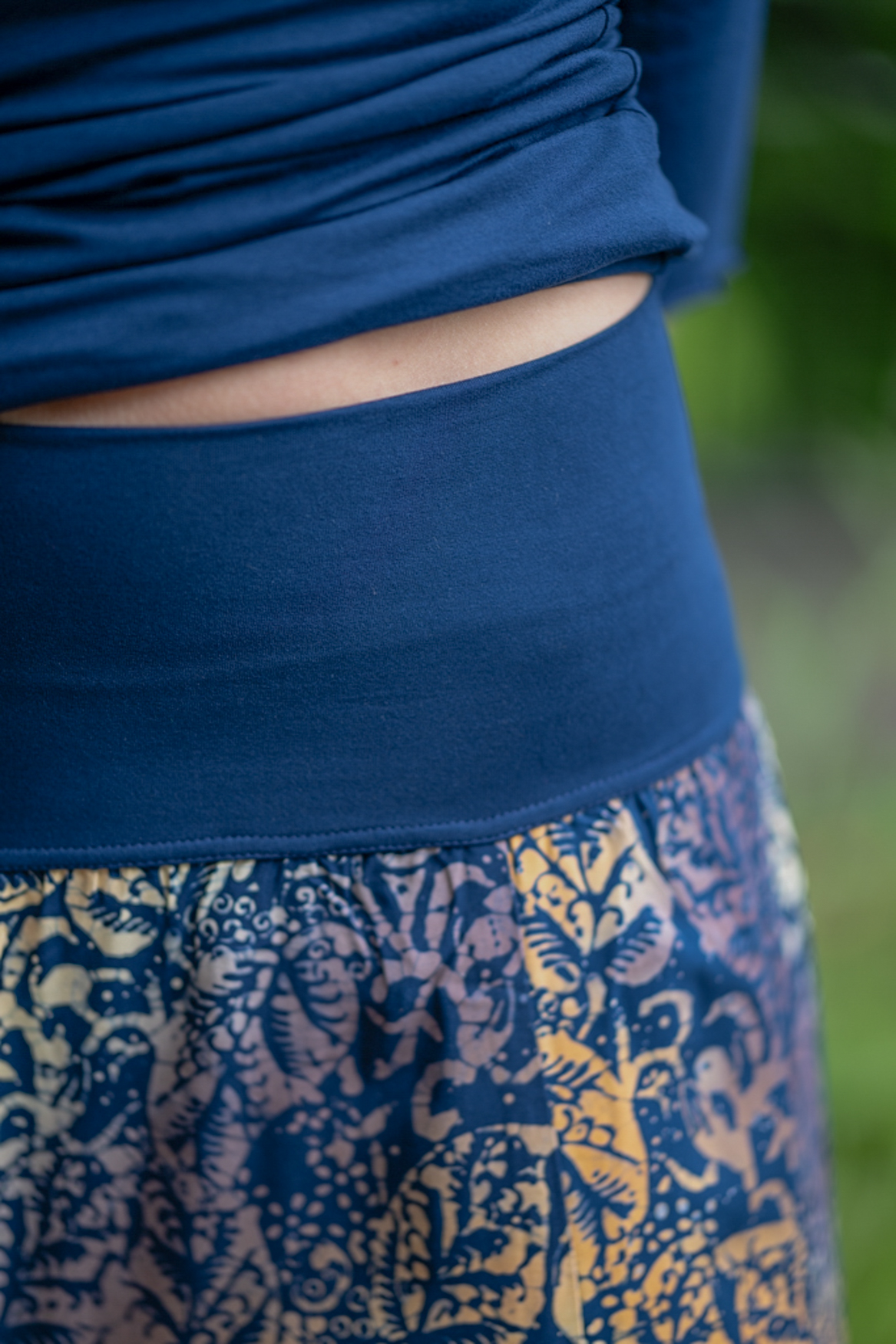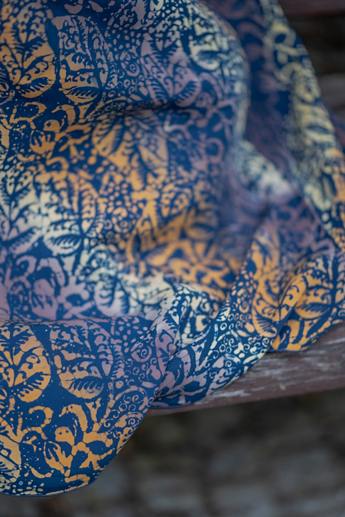 Materiál: 100 % viskóza, vosková batika. Lem: 90 % viskóza + 10% spandex.