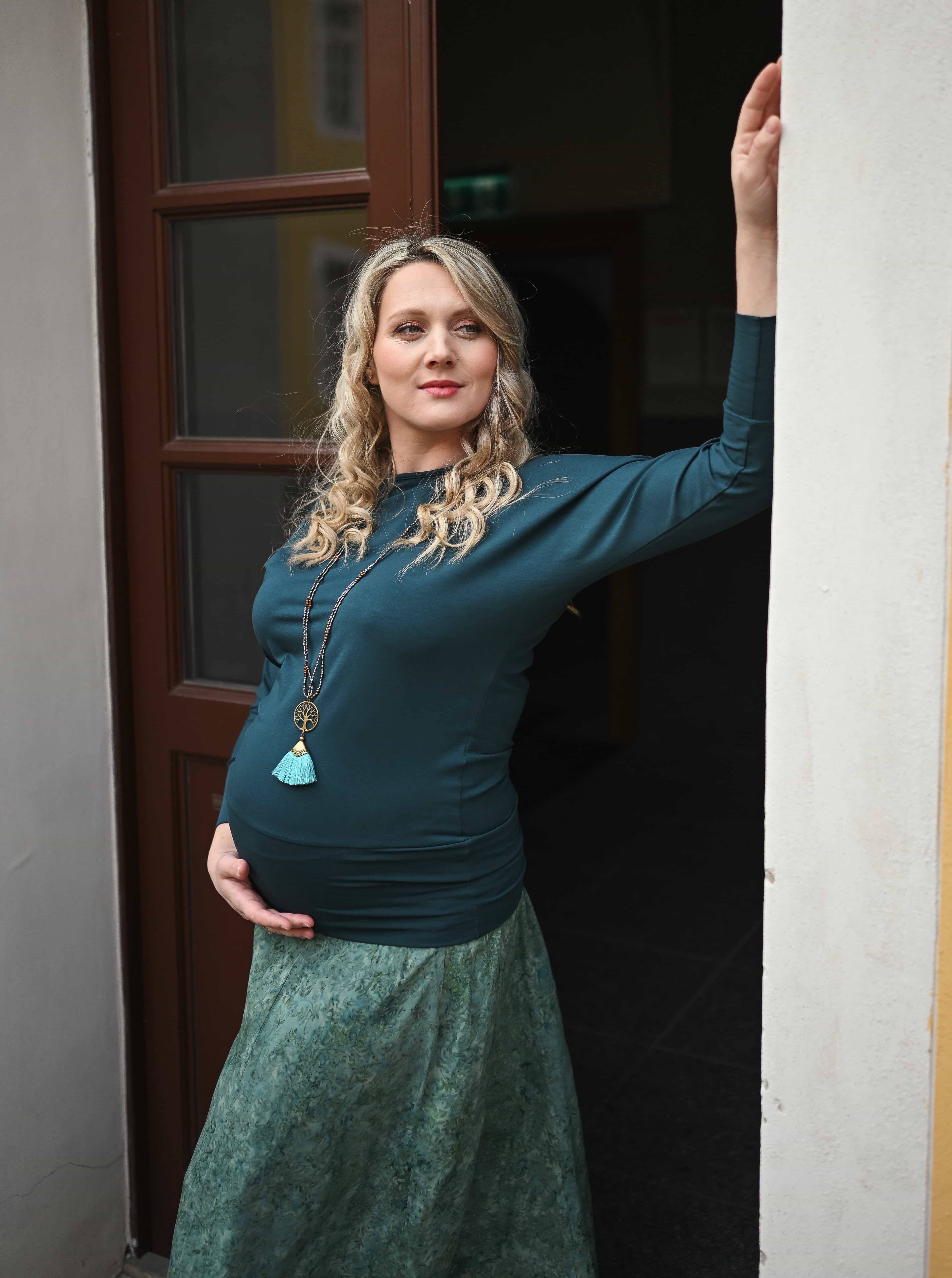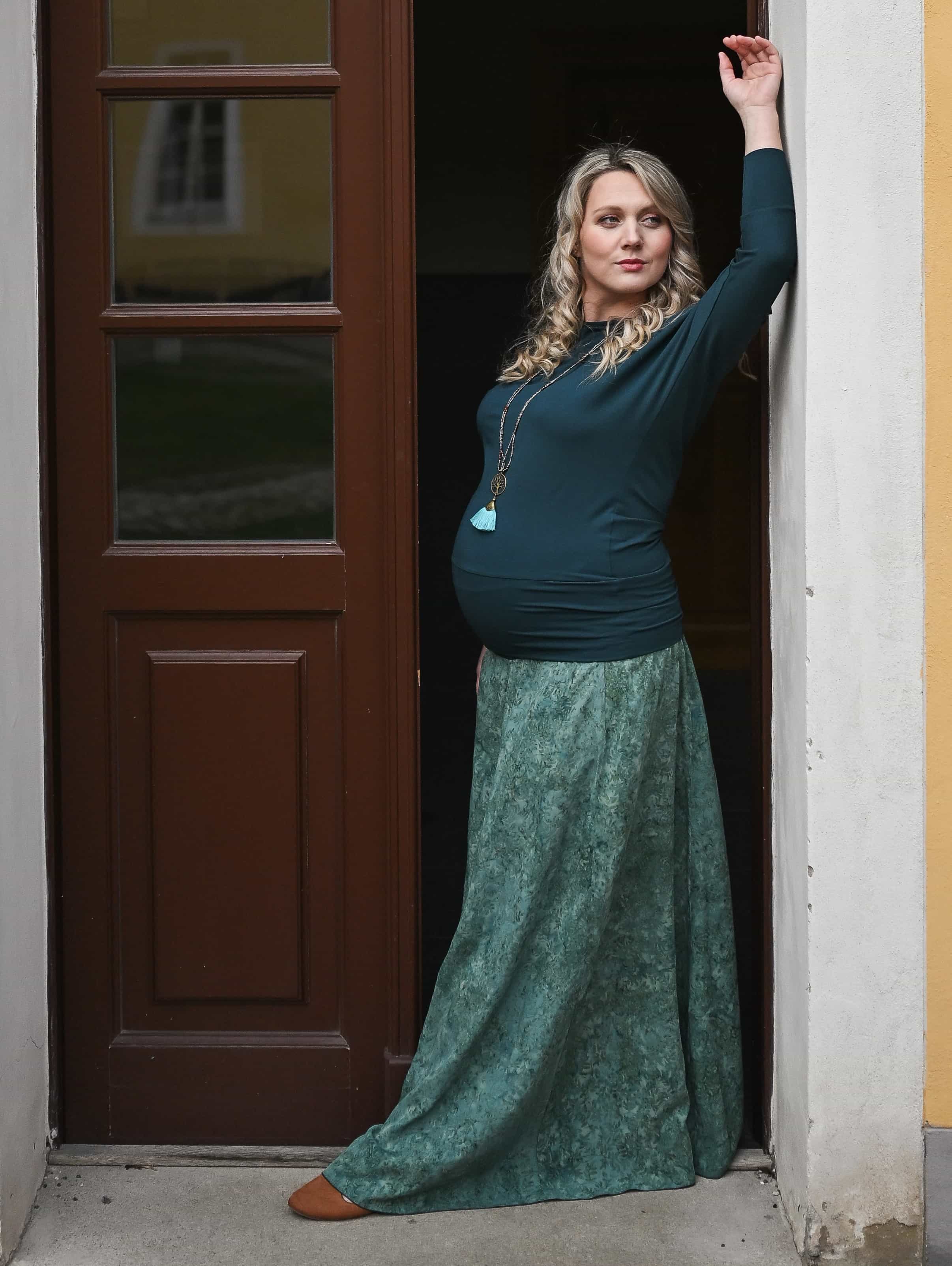 Vysoký elastický pas je nesmírně pohodlný na nošení. Sukně je vhodná i pro těhotné, pružný náplet v pase se krásně přizpůsobí bříšku a obejme ho po celém jeho obvodu. Ikonická Pacha sukně s délkou až na zem se krásně vlní při chůzi a vytváří ženskou siluetu.