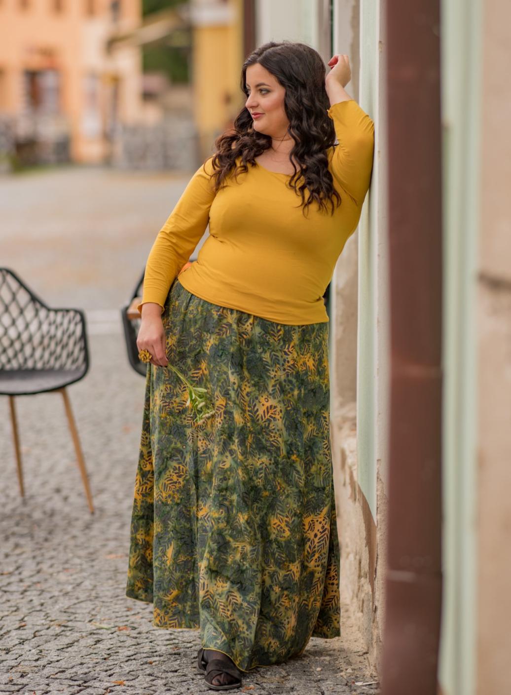 Připravte se na to, že touto úchvatnou, dlouhou sukní přitáhnete pozornost! Sukně je ušitá z lehké viskózové látky a pyšní se nádherným batikovým vzorem.