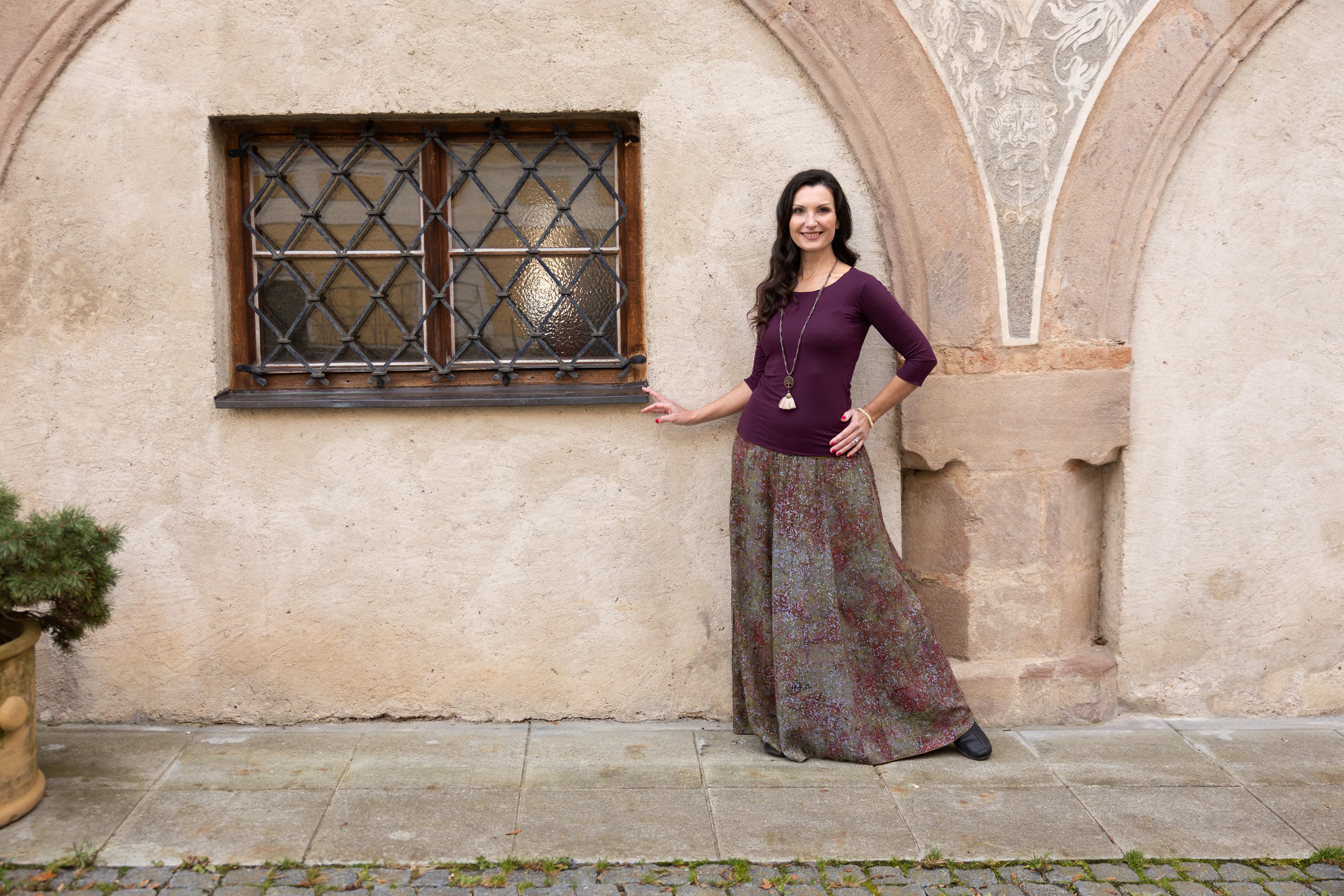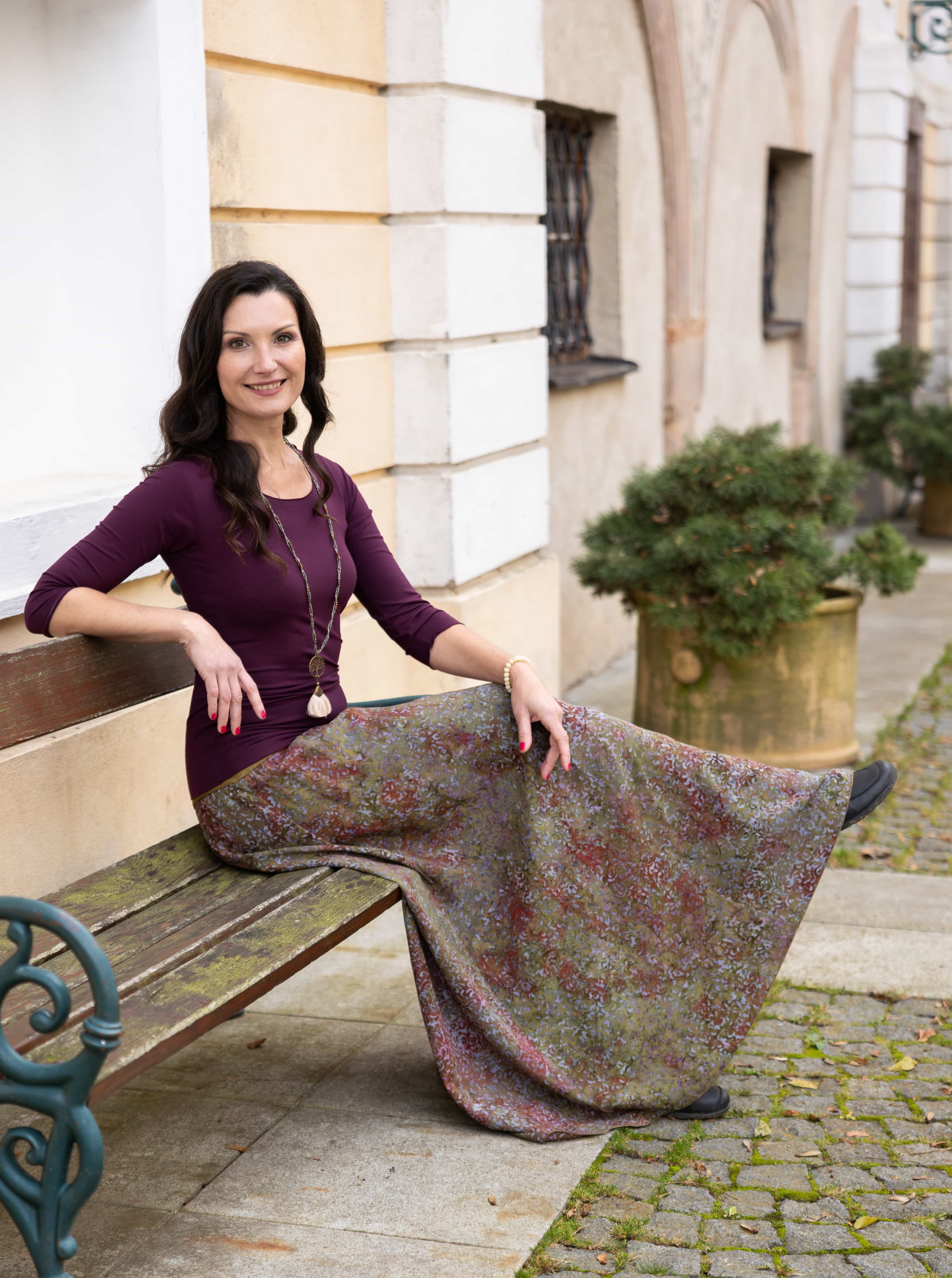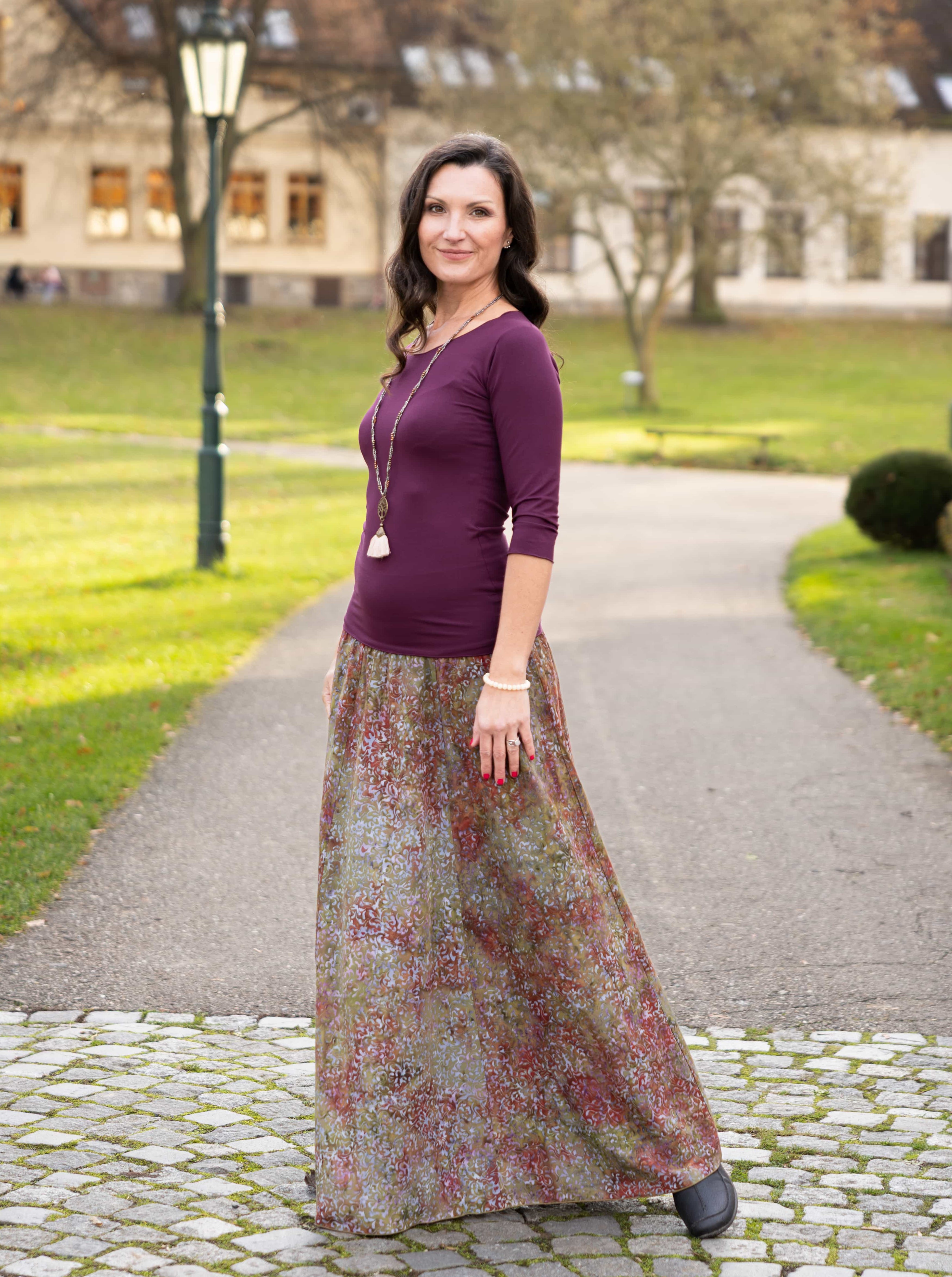 Vysoký elastický pas je nesmírně pohodlný na nošení. Sukně je vhodná i pro těhotné, pružný náplet v pase se krásně přizpůsobí bříšku a obejme ho po celém jeho obvodu. Ikonická Pacha sukně s délkou až na zem se krásně vlní při chůzi a vytváří ženskou siluetu.