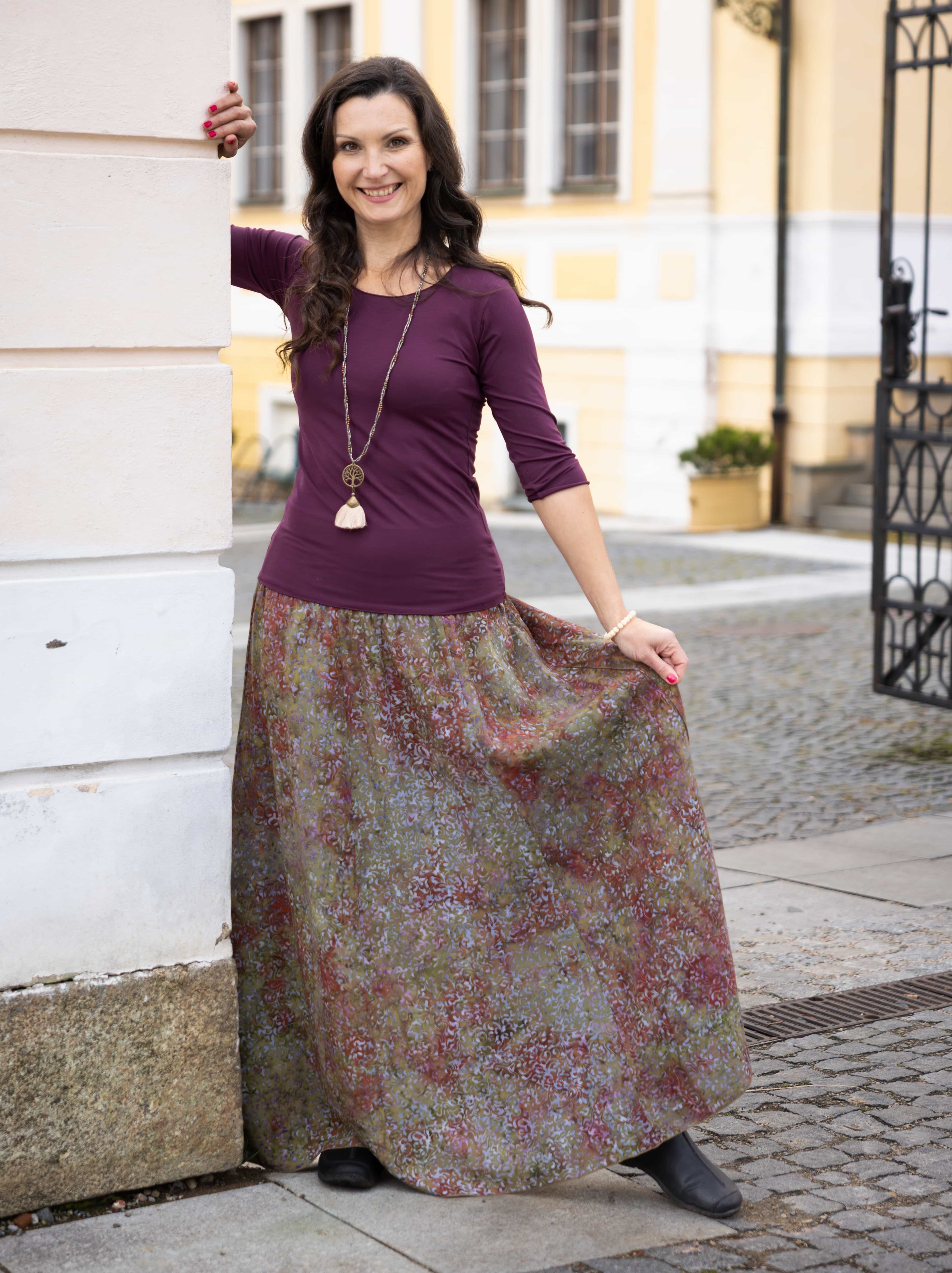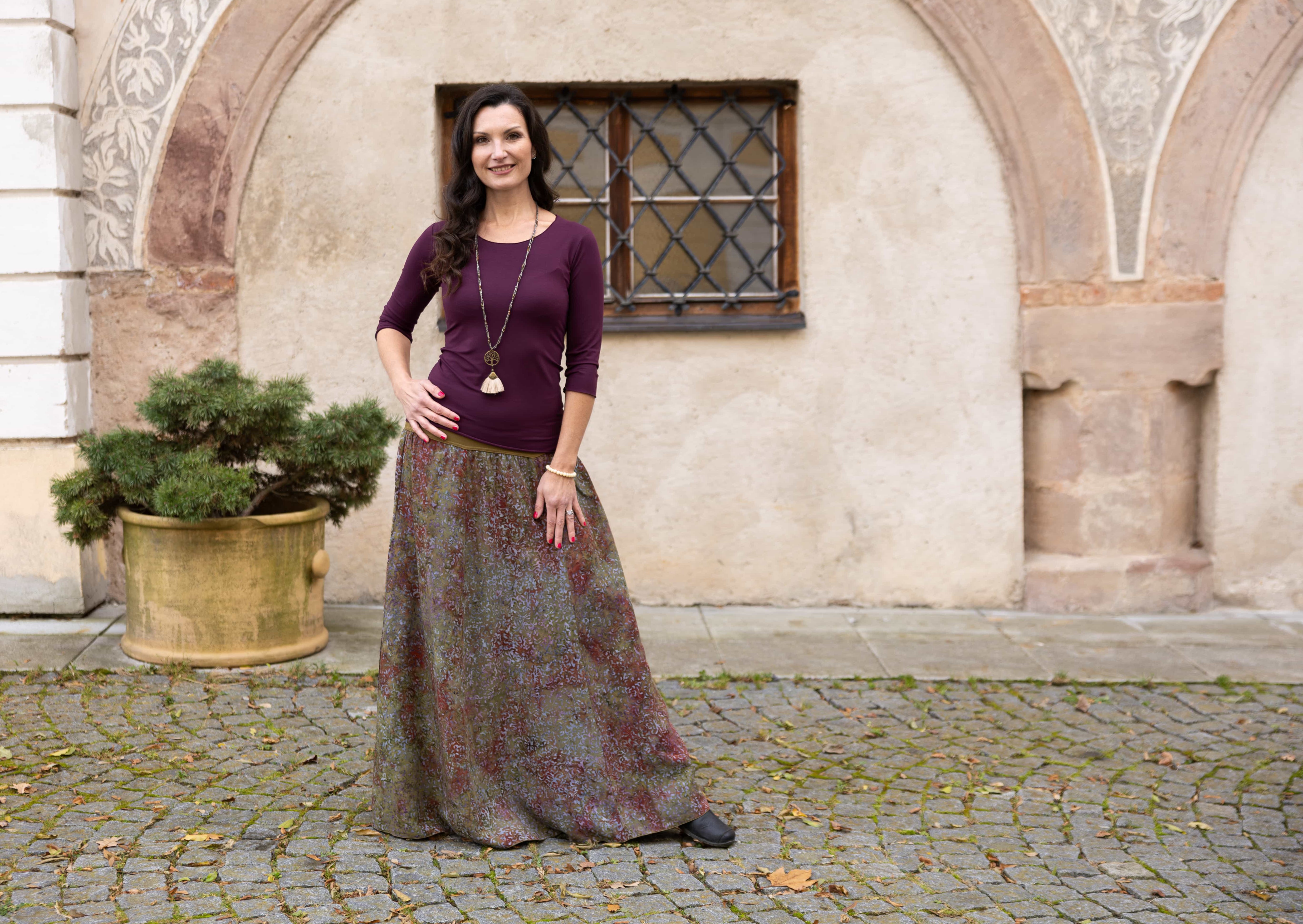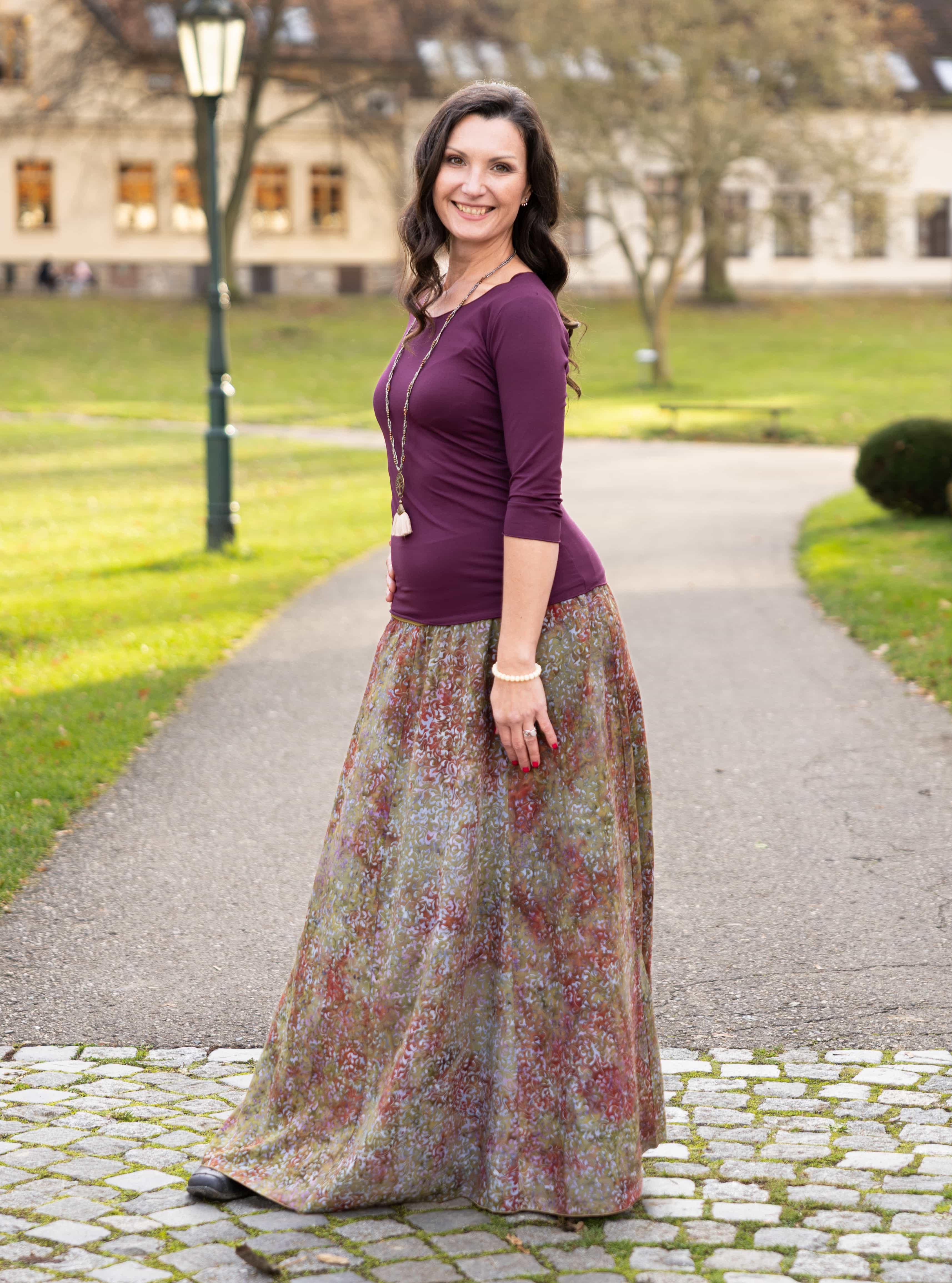 Vysoký elastický pas je nesmírně pohodlný na nošení. Sukně je vhodná i pro těhotné, pružný náplet v pase se krásně přizpůsobí bříšku a obejme ho po celém jeho obvodu. Ikonická Pacha sukně s délkou až na zem se krásně vlní při chůzi a vytváří ženskou siluetu.