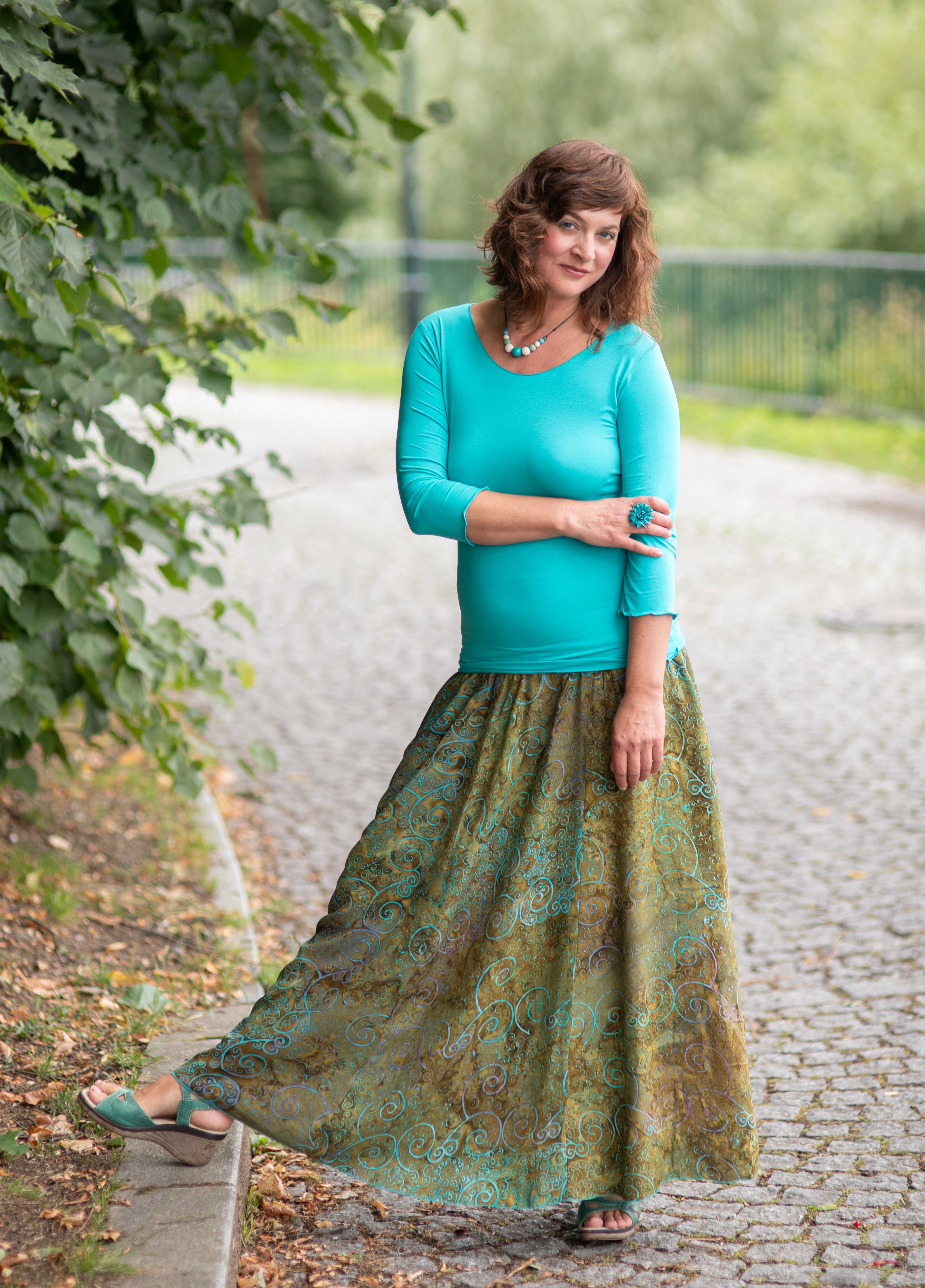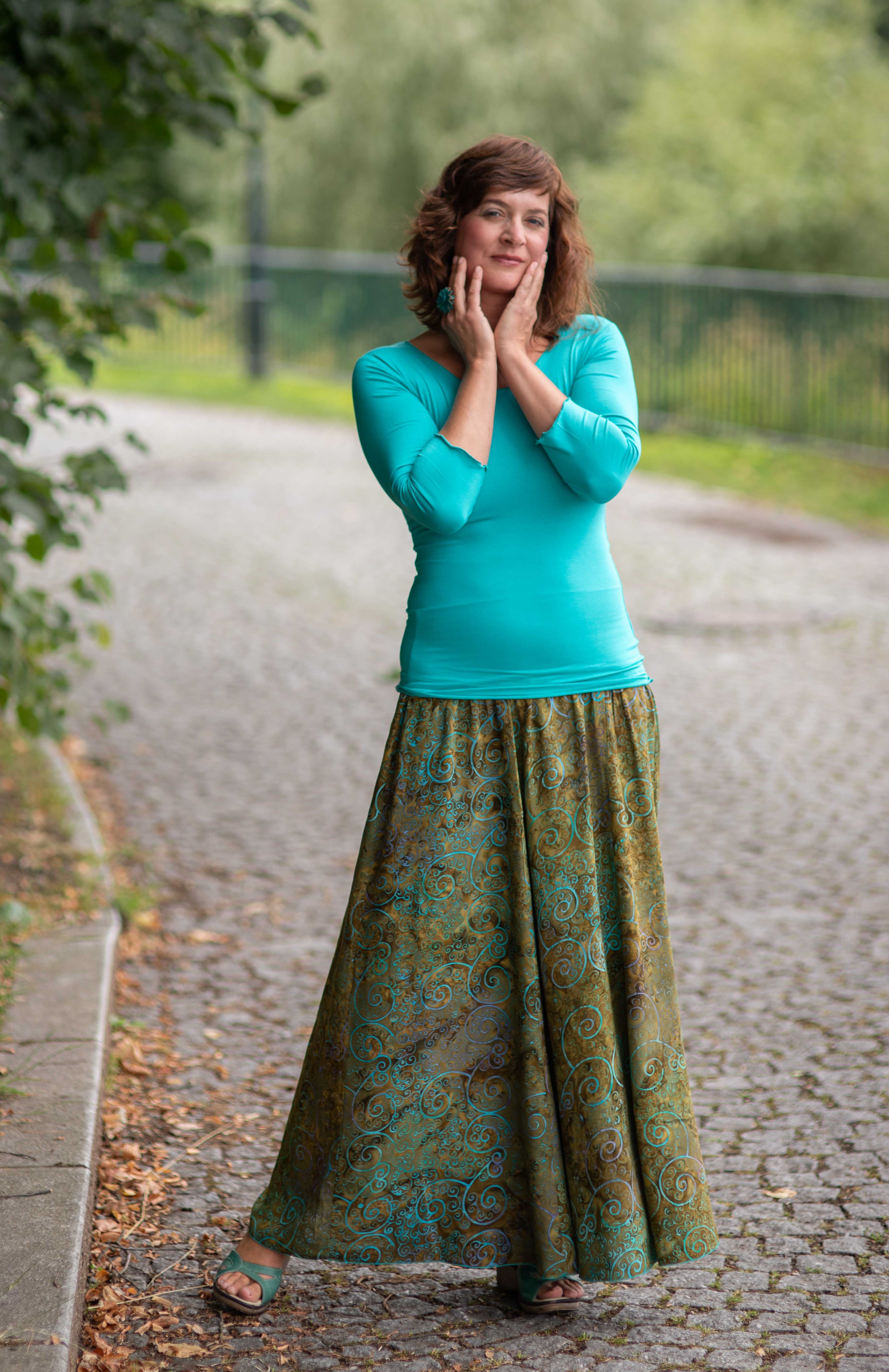 Připravte se na to, že touto úchvatnou, dlouhou sukní přitáhnete pozornost! Sukně je ušitá z lehké viskózové látky a pyšní se nádherným batikovým vzorem.