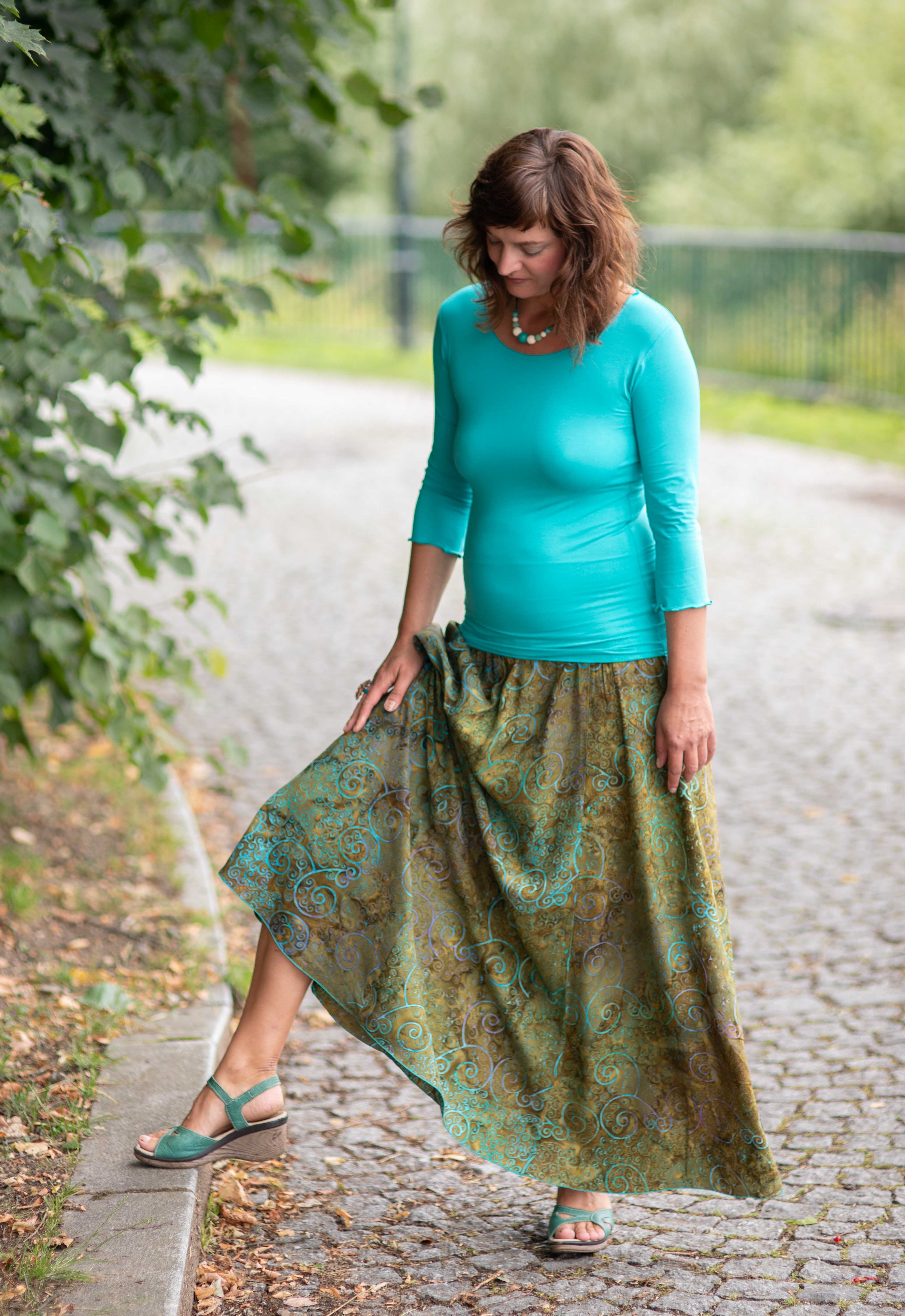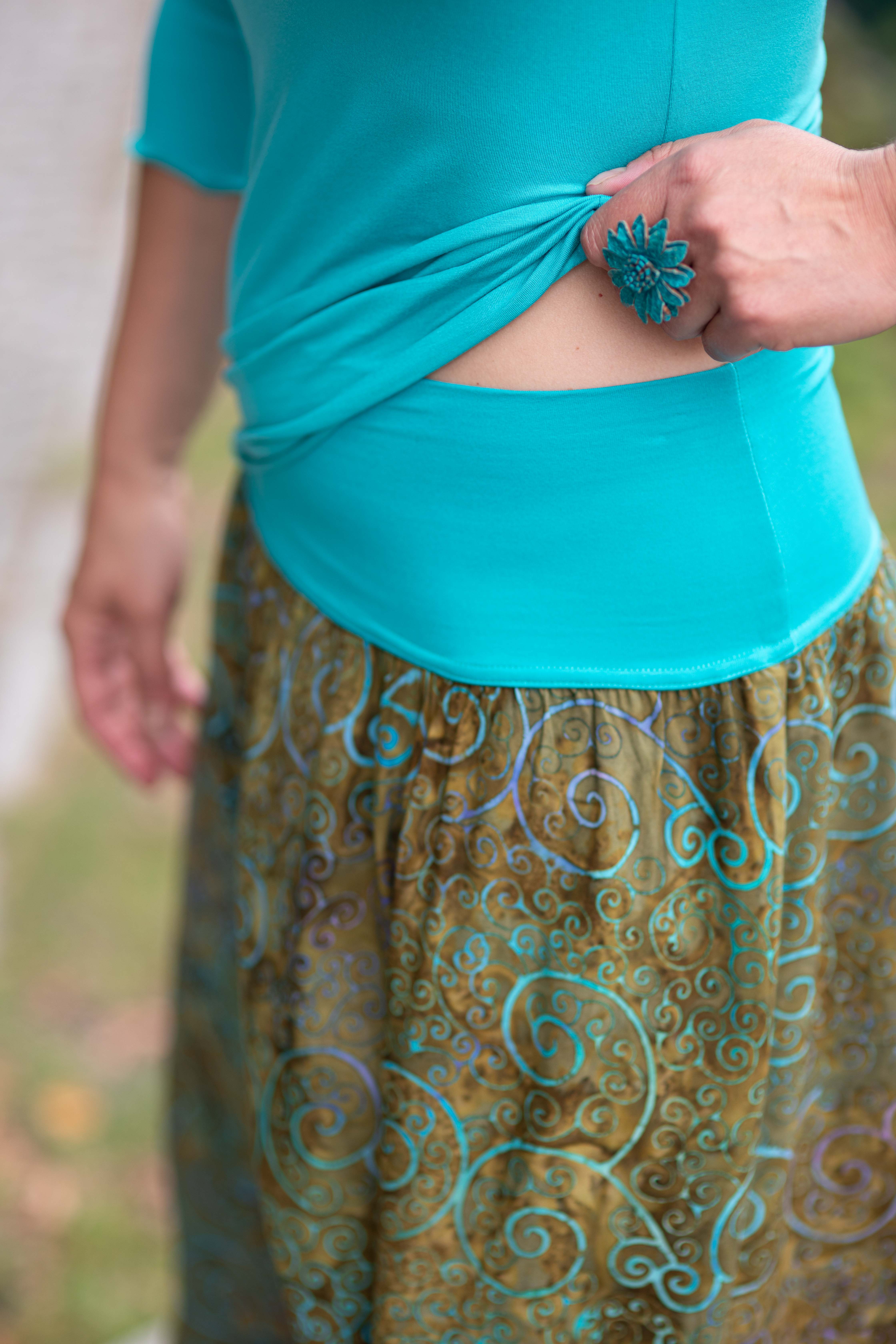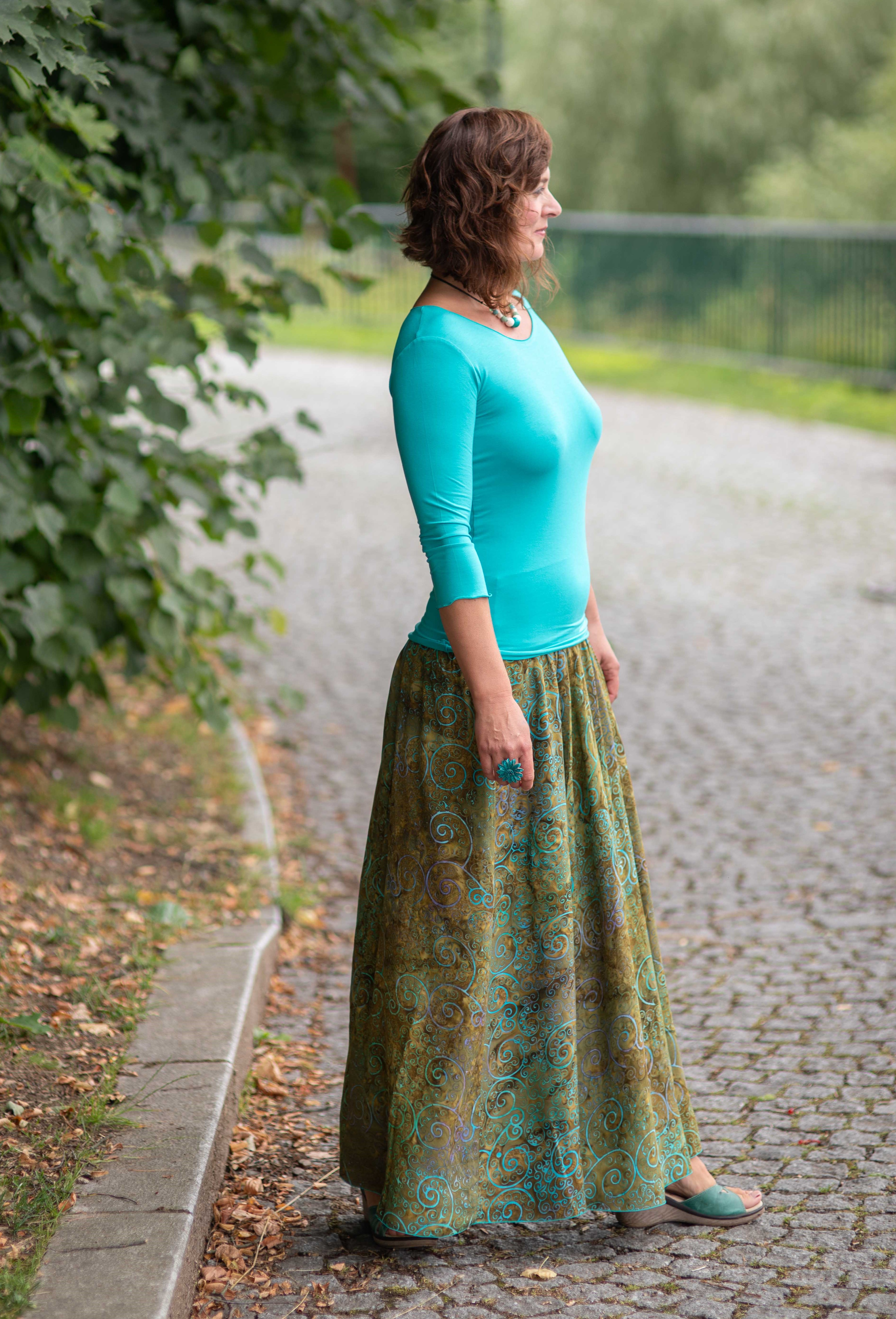Vysoký elastický pas je nesmírně pohodlný na nošení. Sukně je vhodná i pro těhotné, pružný náplet v pase se krásně přizpůsobí bříšku a obejme ho po celém jeho obvodu. Ikonická Pacha sukně s délkou až na zem se krásně vlní při chůzi a vytváří ženskou siluetu.