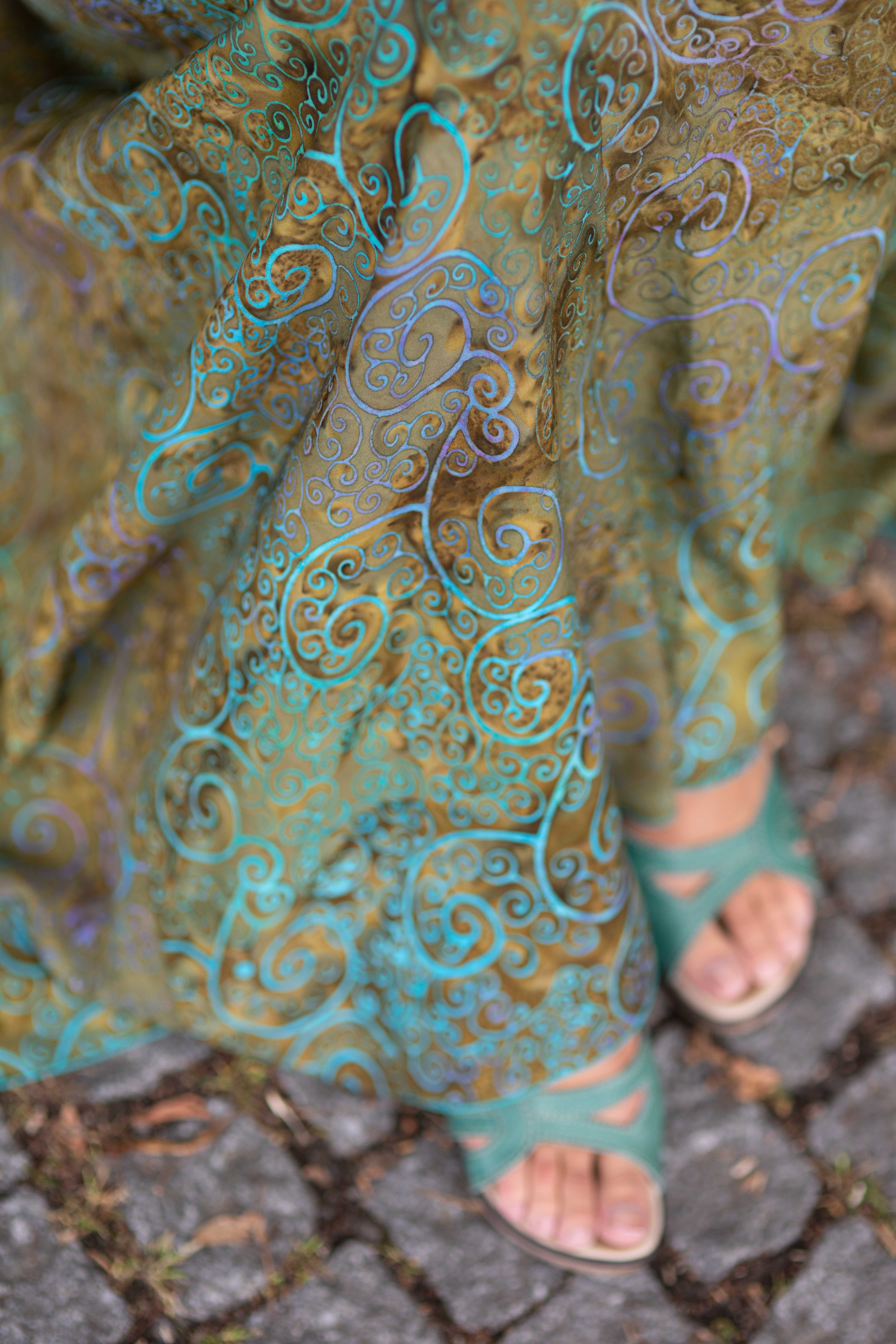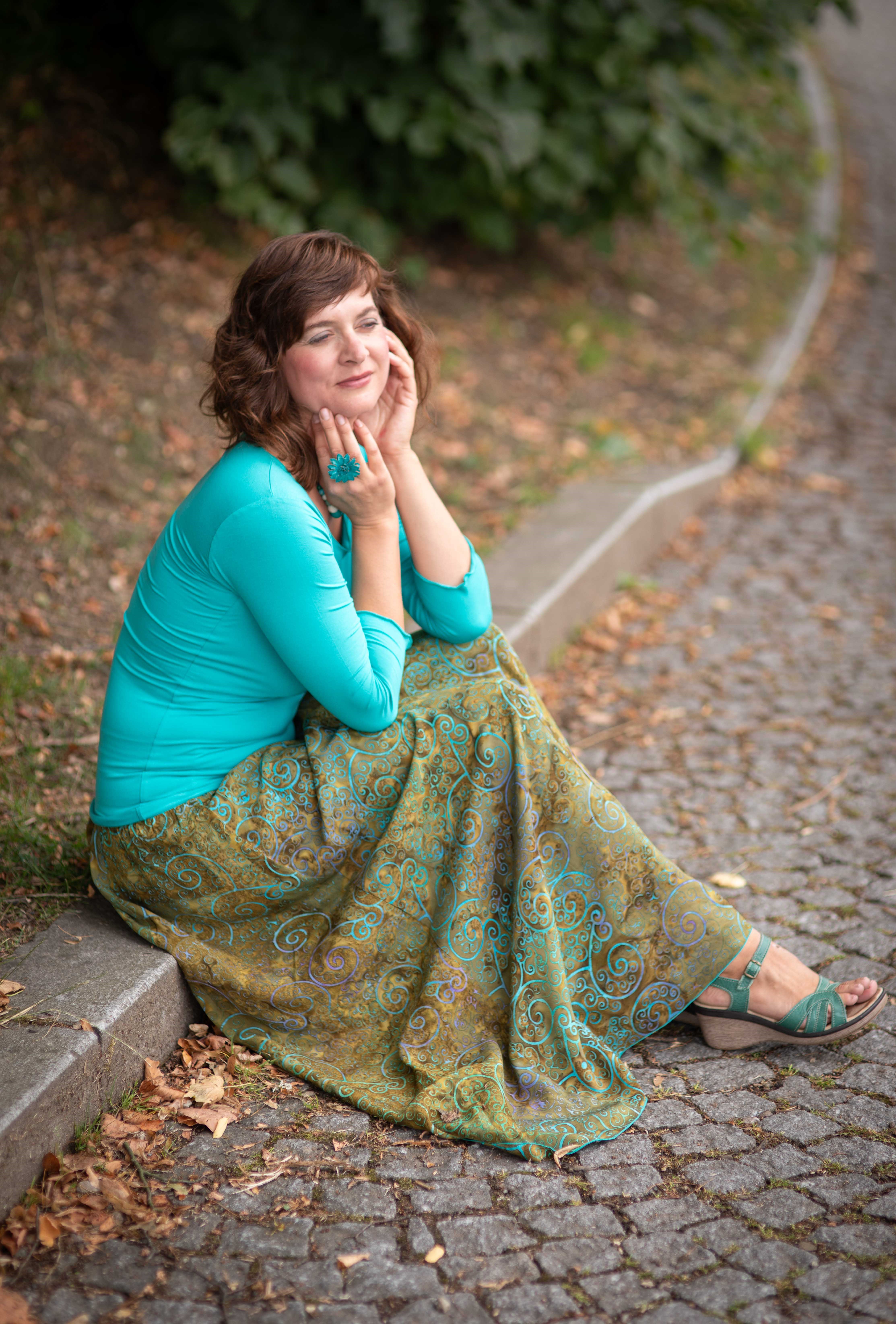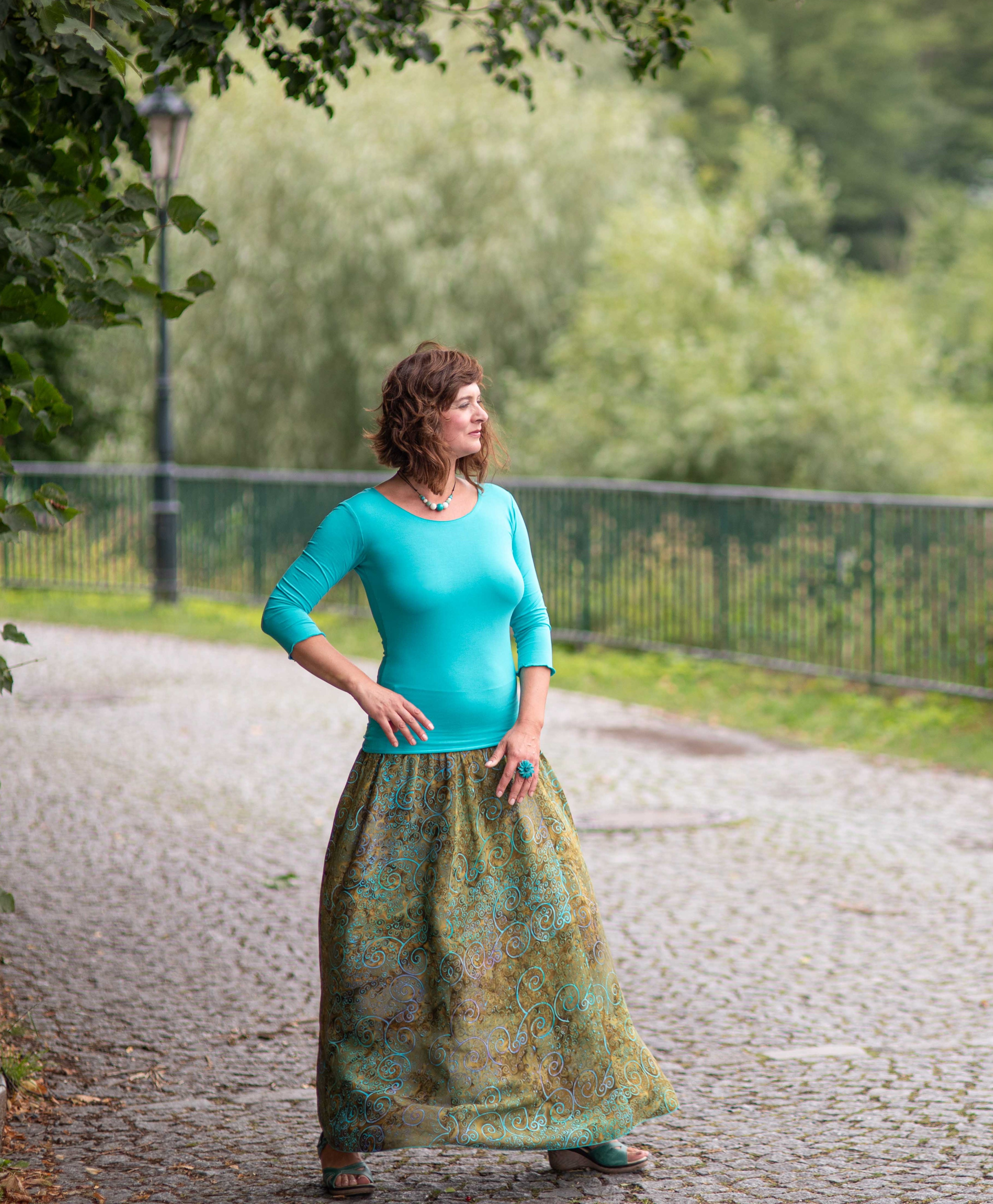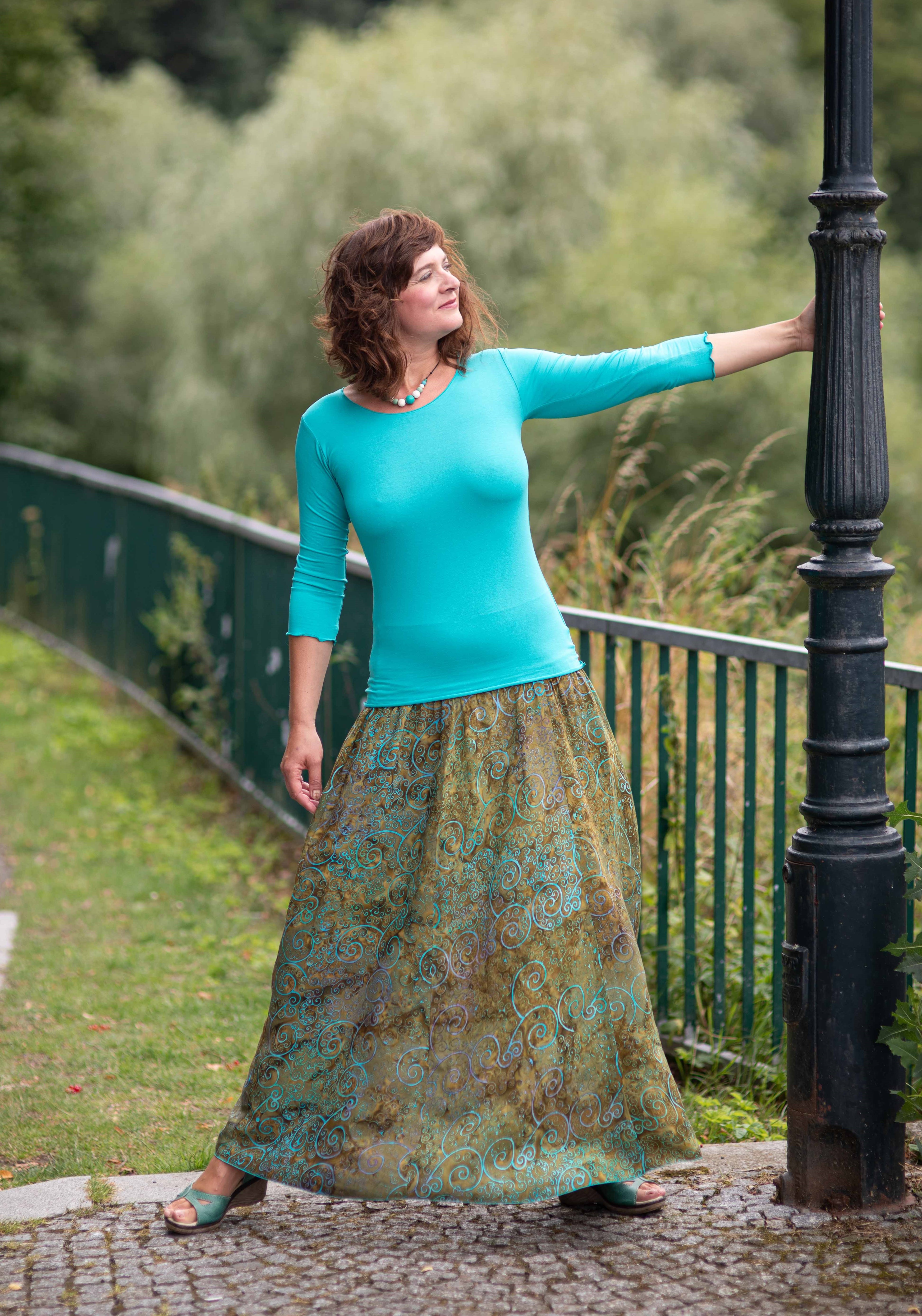Vysoký elastický pas je nesmírně pohodlný na nošení. Sukně je vhodná i pro těhotné, pružný náplet v pase se krásně přizpůsobí bříšku a obejme ho po celém jeho obvodu. Ikonická Pacha sukně s délkou až na zem se krásně vlní při chůzi a vytváří ženskou siluetu.