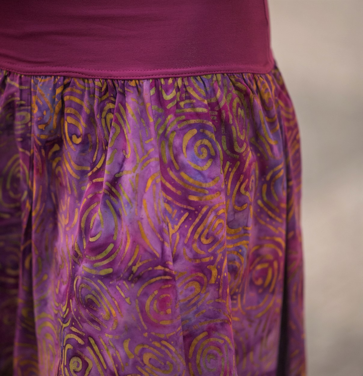 Barvy a vzory na látce vznikly v batikové dílně mistra Aldima. Sukni pro Vás ušila paní Agung v Indonésii. Tady si můžete přečíst rozhovor s Agung. Povídaly jsme si s ní o životě, o její práci i o muži jejích snů :)