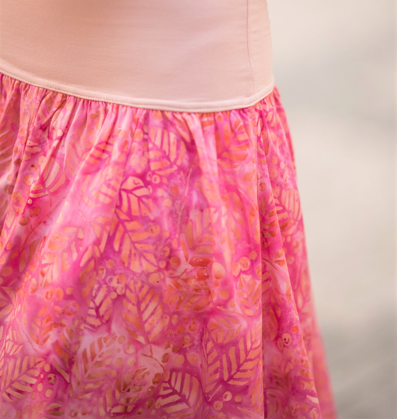 Materiál sukně: 100 % viskóza, vosková batika. Lem: 90 % viskóza + 10% spandex.