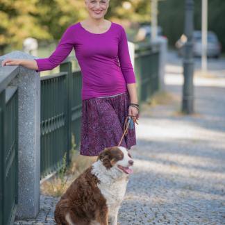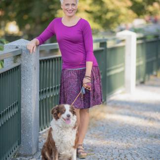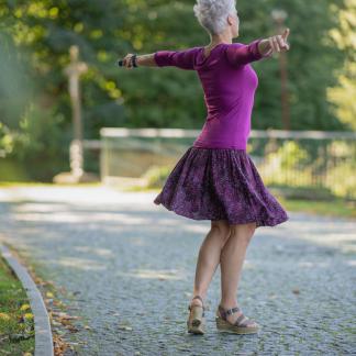 Barva sukně: lilková barva s jemný šedým vzorkem