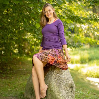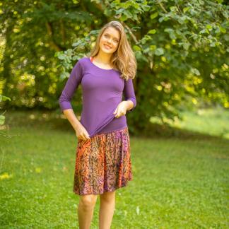 Krátká sukně s ručním potiskem voskové batiky. Pohodlný, pružný lem v pase si oblíbí především Vaše bříško, i to s miminkem uvnitř.