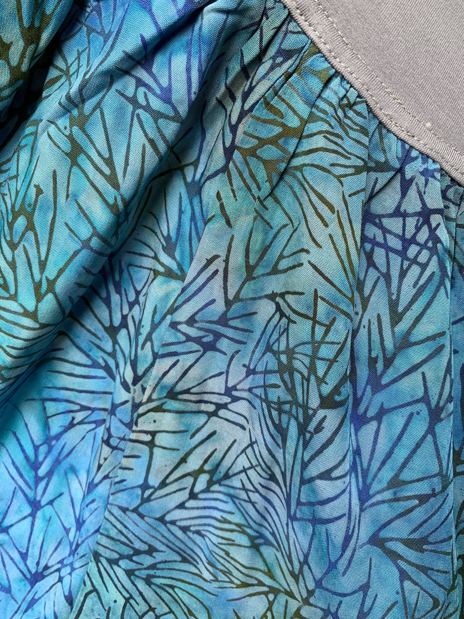 Krátká sukně s ručním potiskem voskové batiky. Pohodlný, pružný lem v pase si oblíbí především Vaše bříško, i to s miminkem uvnitř.