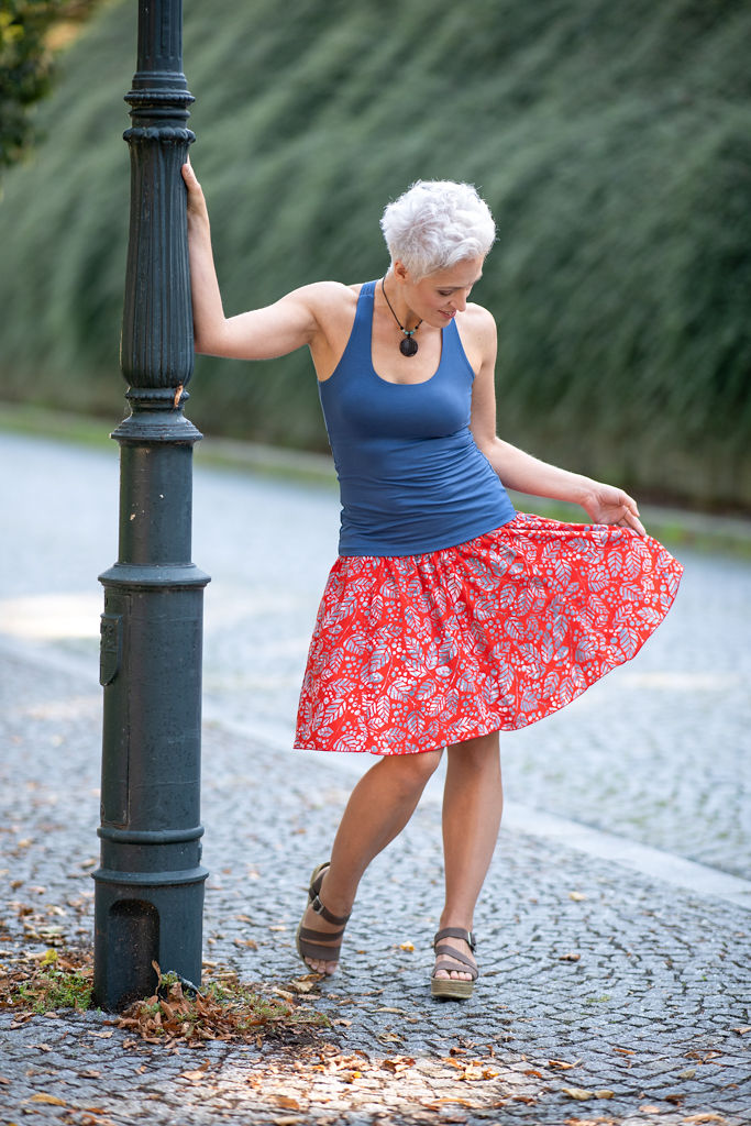 Barva sukně: barva červeného pomeranče, oranžová se vzorem šedivých listů