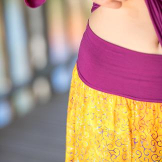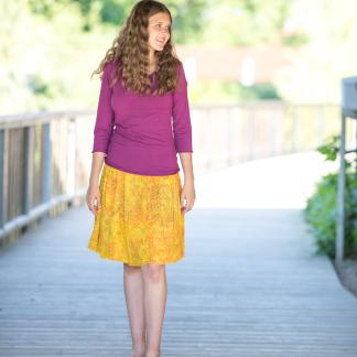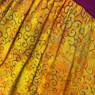 Krátká sukně s ručním potiskem voskové batiky. Pohodlný, pružný lem v pase si oblíbí především Vaše bříško, i to s miminkem uvnitř.