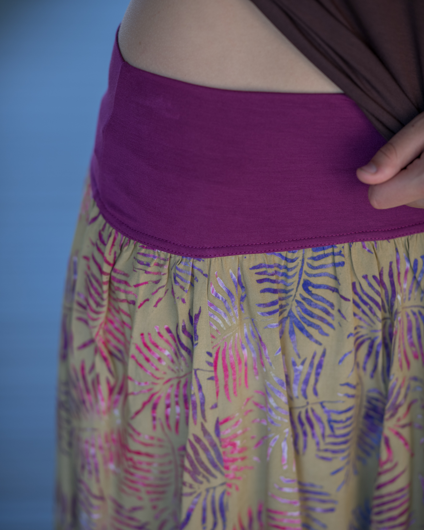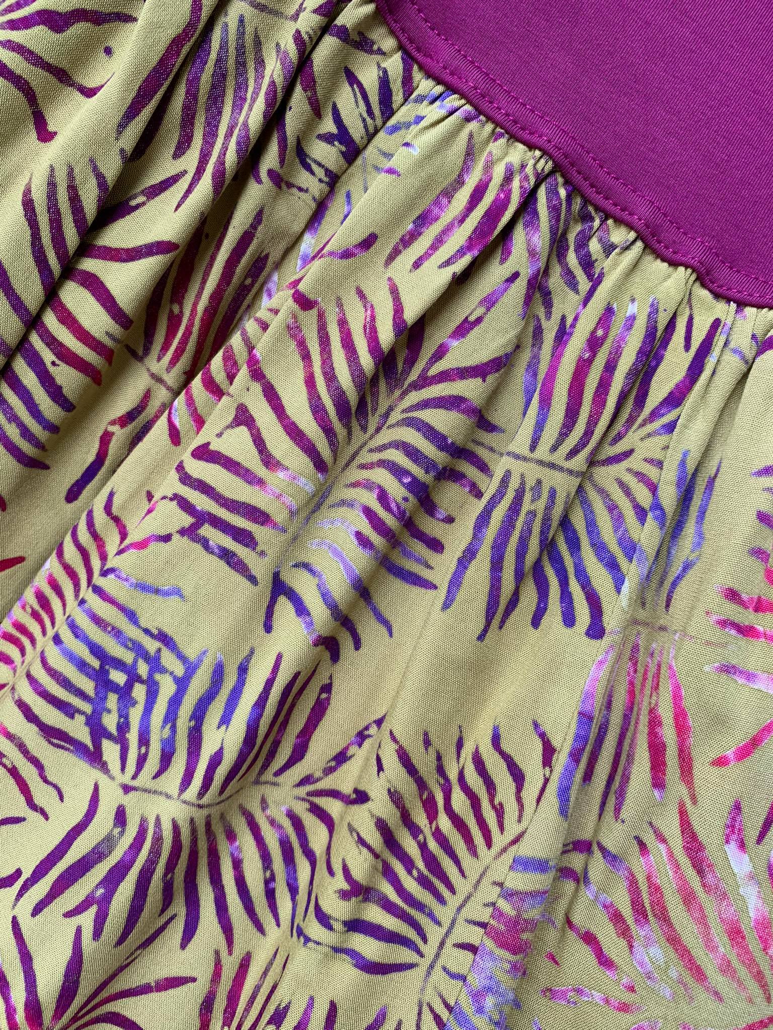 Krátká sukně s ručním potiskem voskové batiky. Pohodlný, pružný lem v pase si oblíbí především Vaše bříško, i to s miminkem uvnitř.