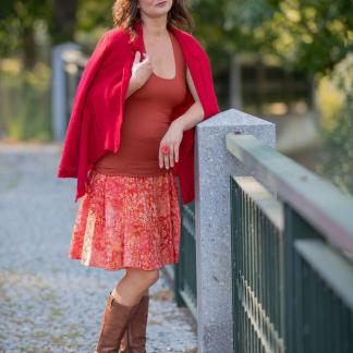 Barva sukně: oranžovozrzavý podklad se jemným vzorem v pastelově žlutých a pudrových tónech.