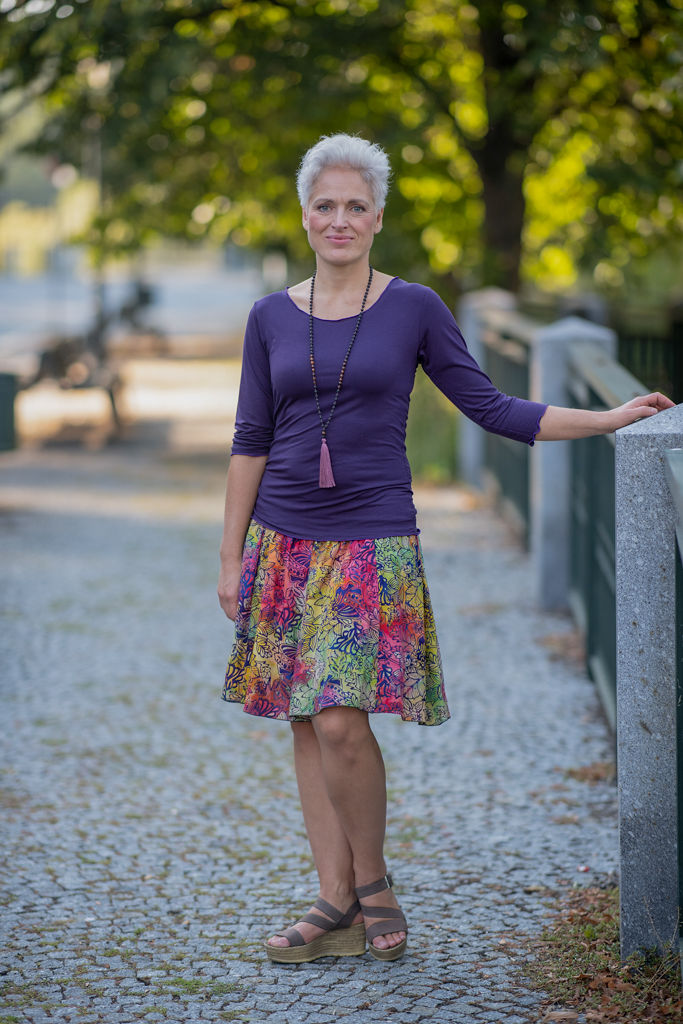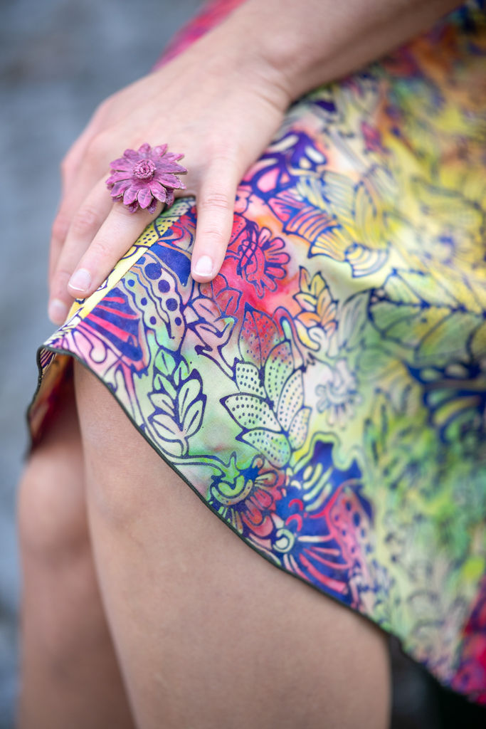 Připravte se na to, že touto úchvatnou, krátkou sukní přitáhnete pozornost! Sukně je ušitá z lehké viskózové látky a pyšní se nádherným batikovým vzorem.