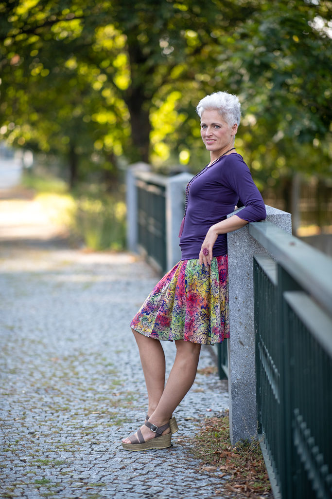 Barva sukně: pestrobarevná se vzorem v tmavě modré až fialové barvě