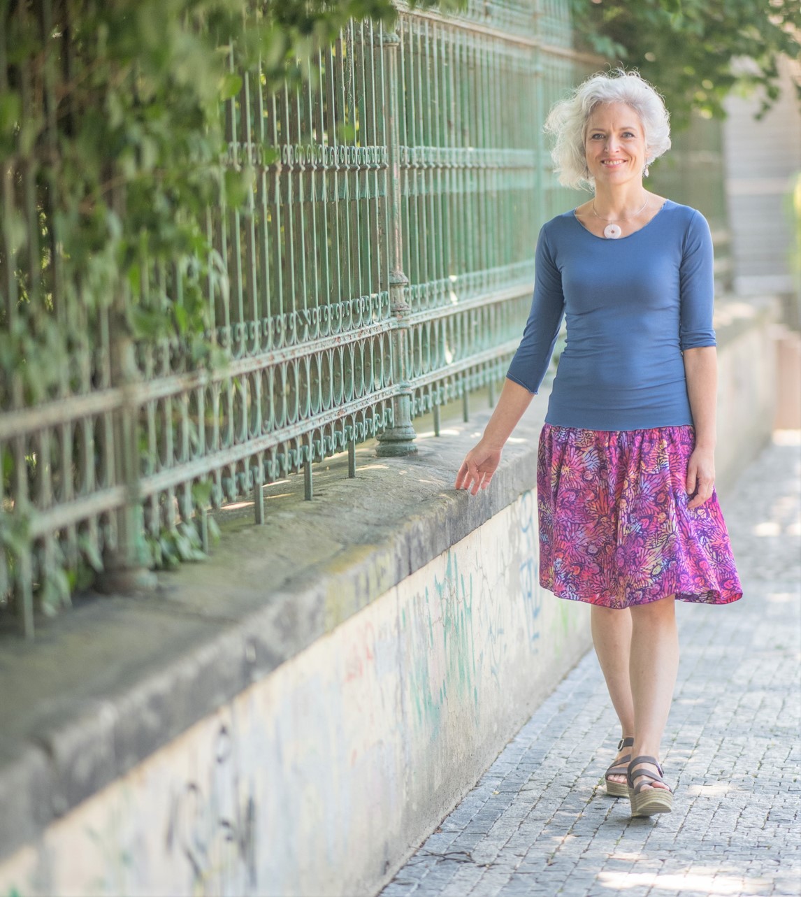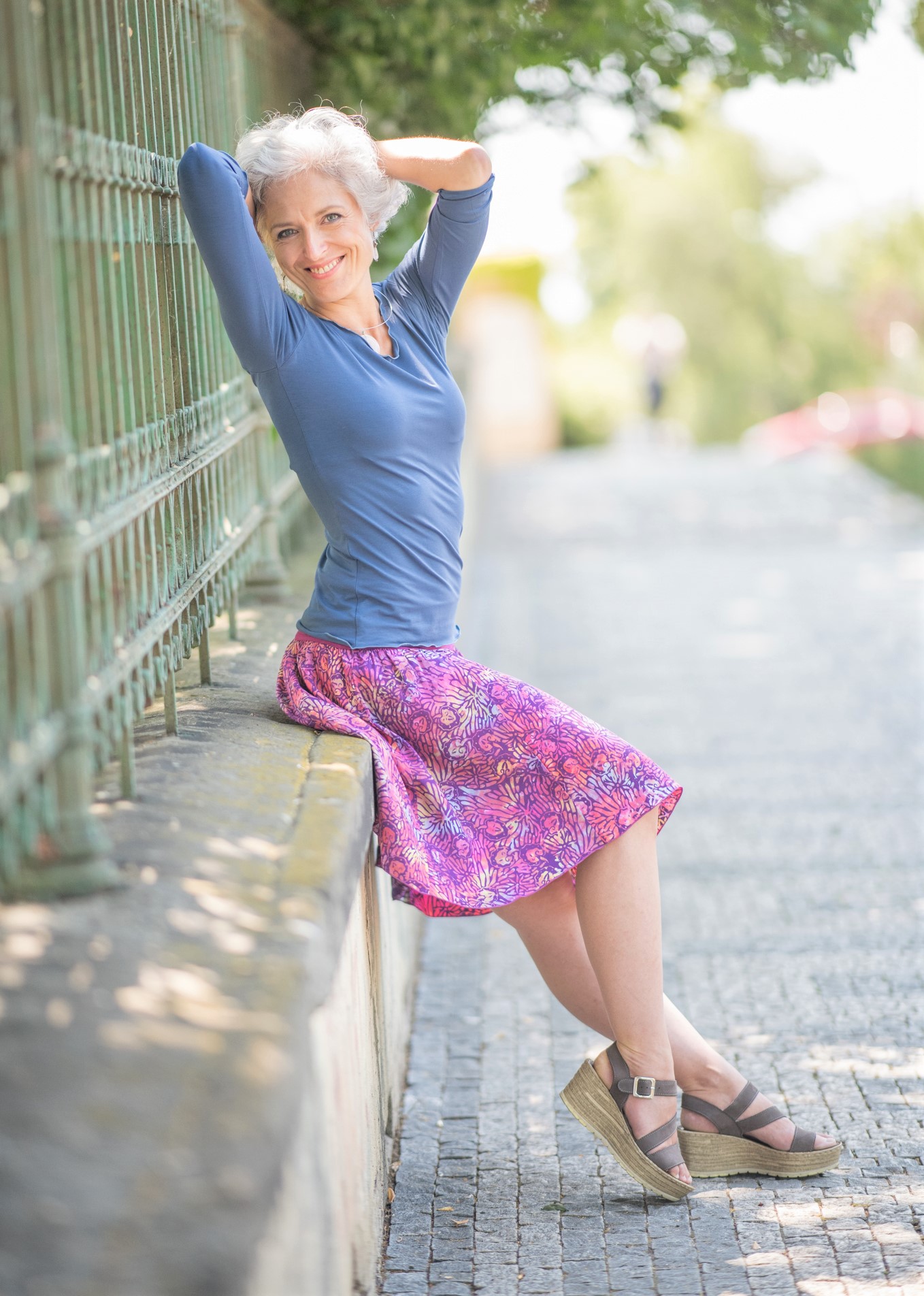 Elastický pas je nesmírně pohodlný na nošení. Sukně je vhodná i pro těhotné, pružný náplet v pase se krásně přizpůsobí bříšku a obejme ho po celém jeho obvodu. Ikonická Pacha sukně v délce ke kolenům se krásně vlní při chůzi, vytvářejíc ženskou siluetu, která je pohodlná a stylová zároveň.
