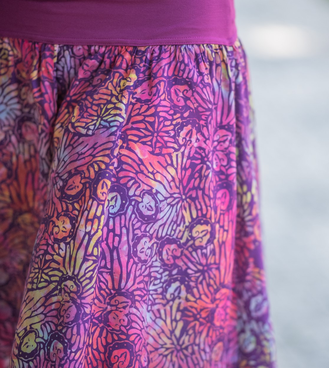 Barva sukně: fialový podklad s petrobarevnou batikou