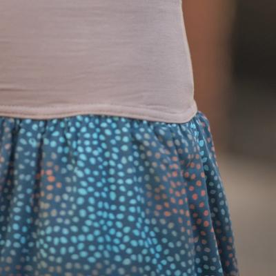 Materiál sukně: 100 % viskóza, vosková batika. Lem: 90 % viskóza + 10% spandex.