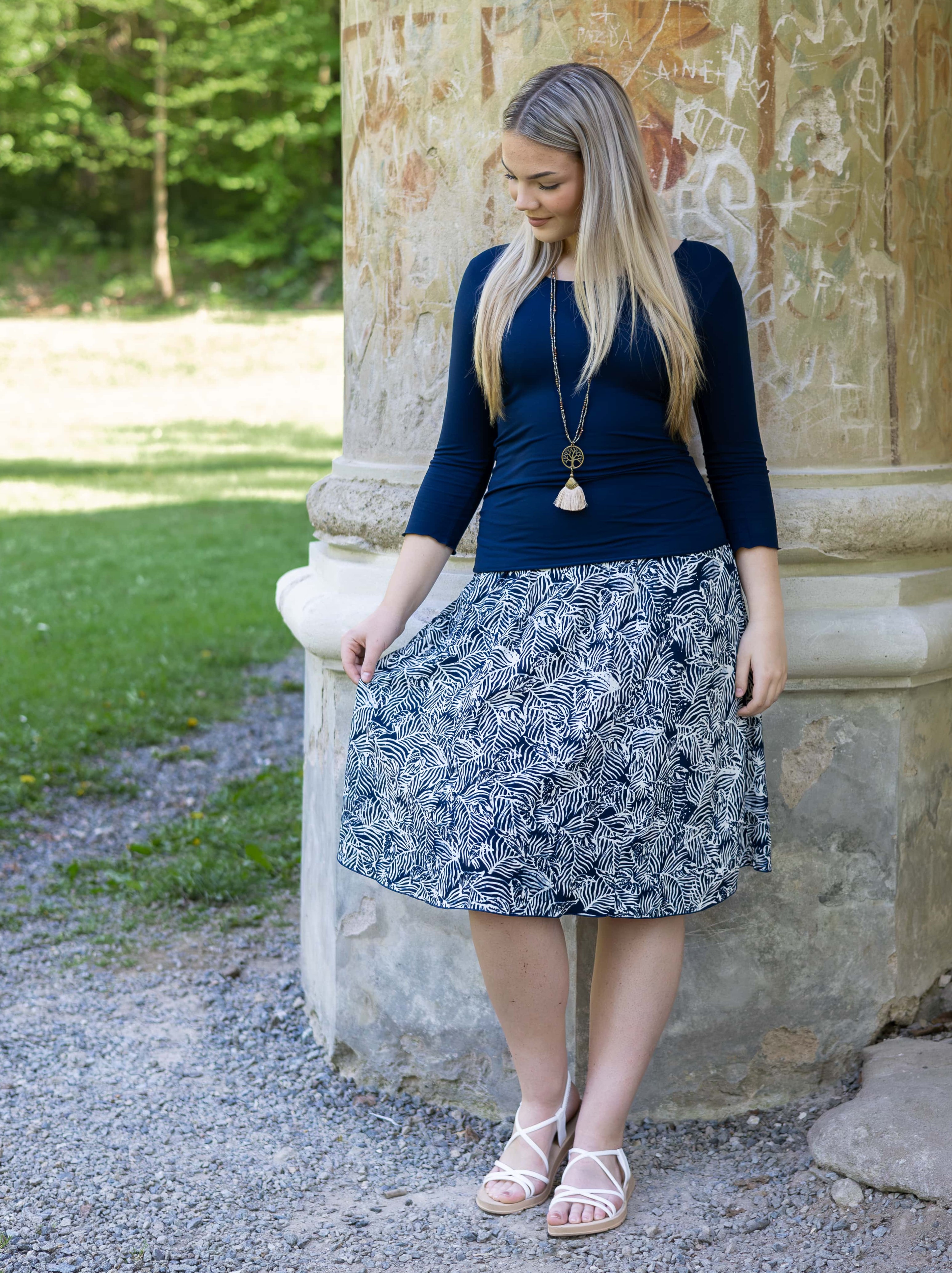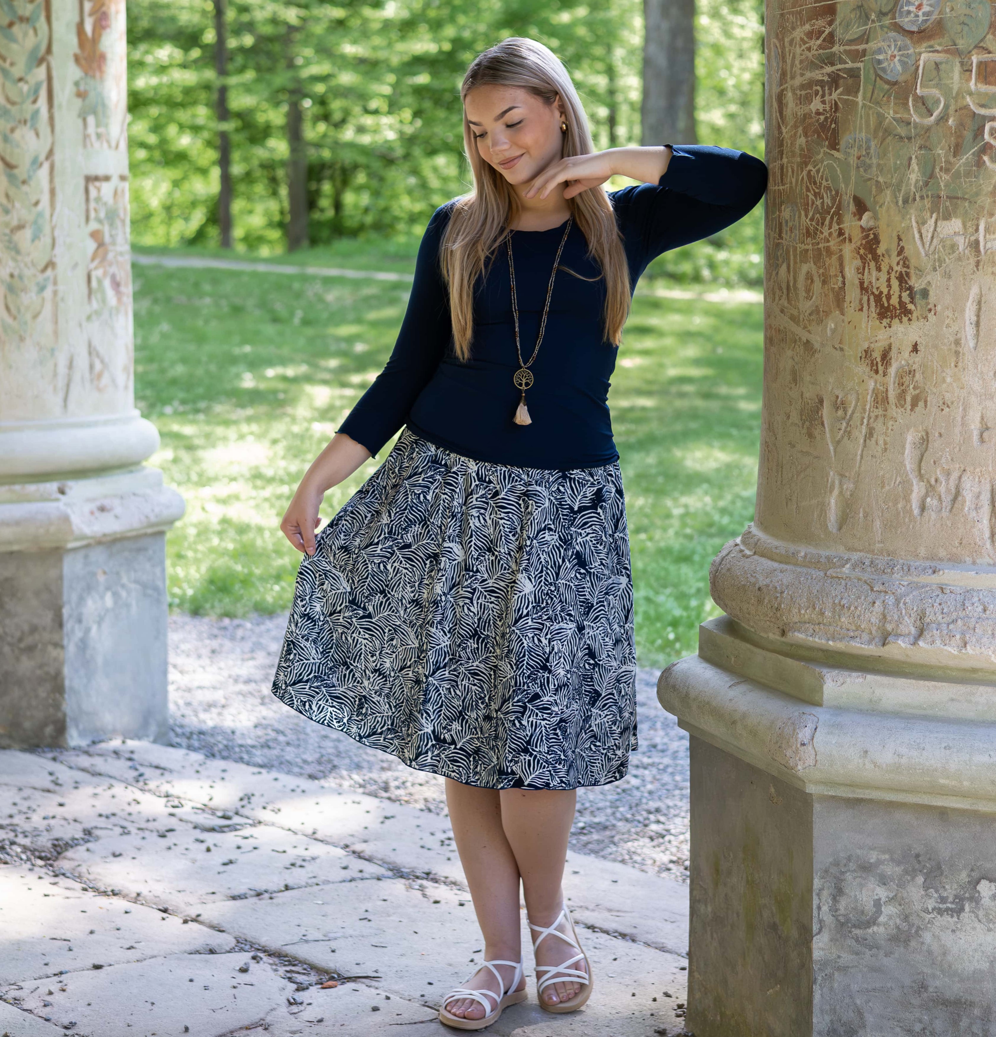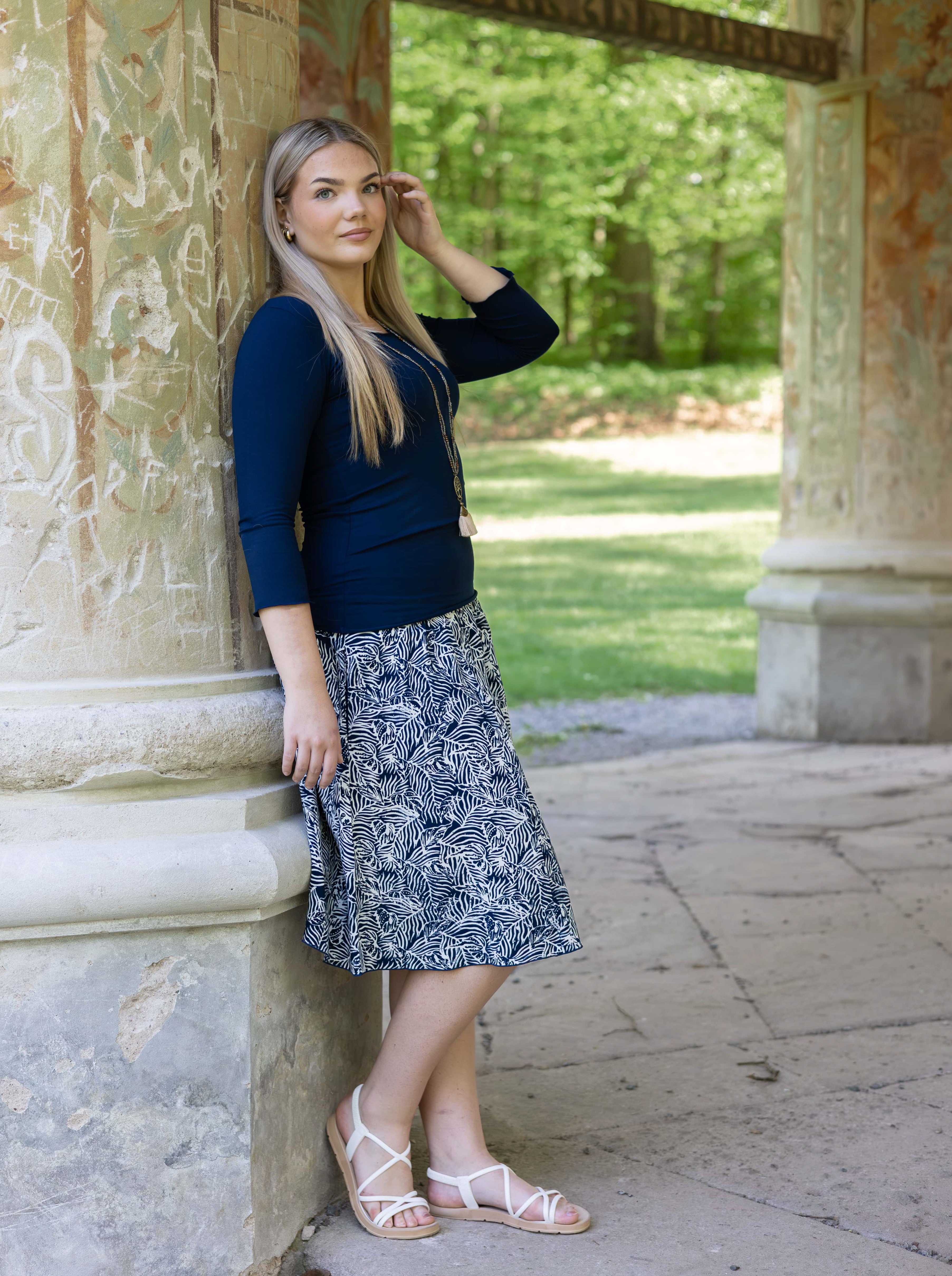 Vysoký elastický pas je nesmírně pohodlný na nošení. Sukně je vhodná i pro těhotné, pružný náplet v pase se krásně přizpůsobí bříšku a obejme ho po celém jeho obvodu. Ikonická Pacha sukně s délkou na dlaň pod kolena vytváří ženskou siluetu, je pohodlná a stylová zároveň.