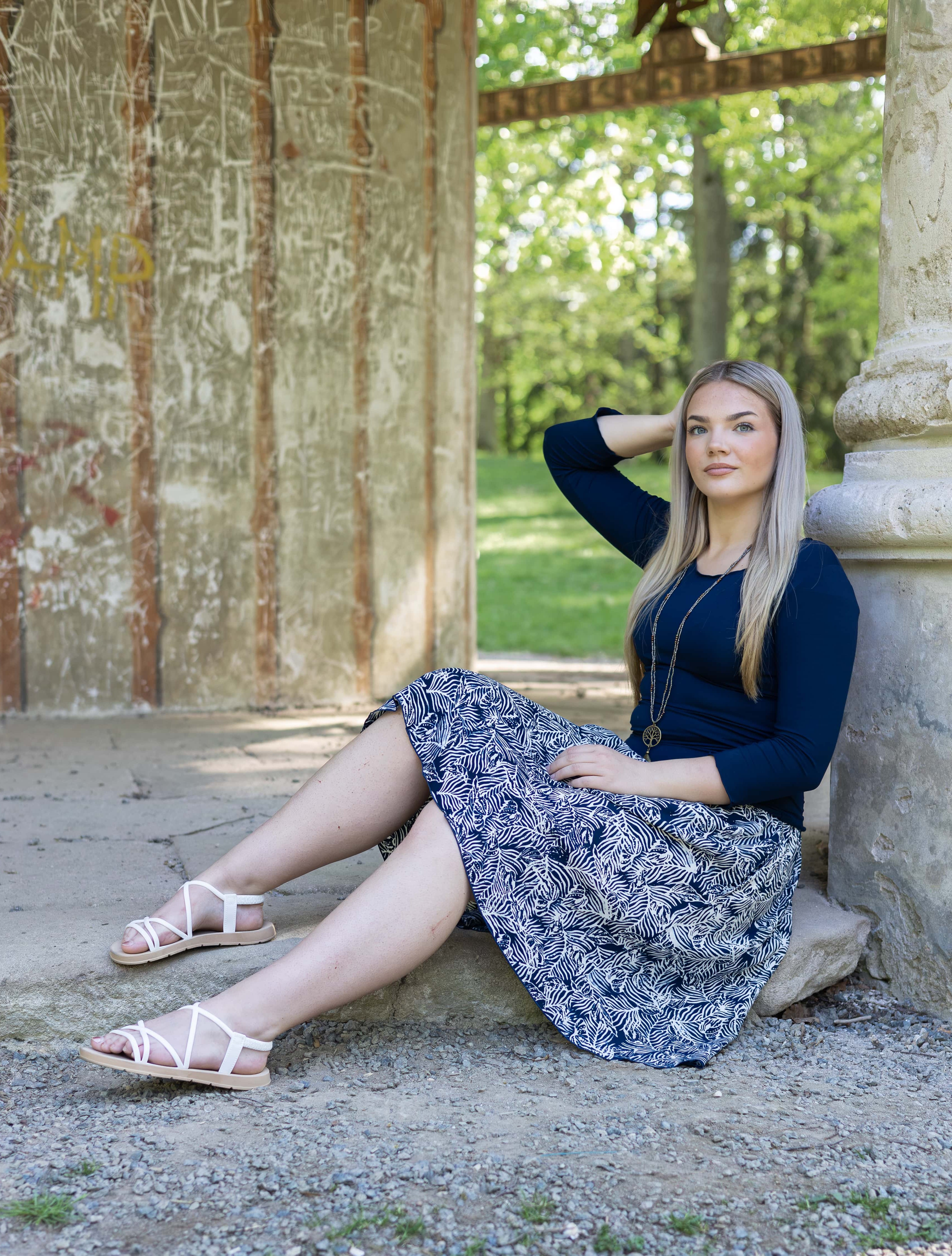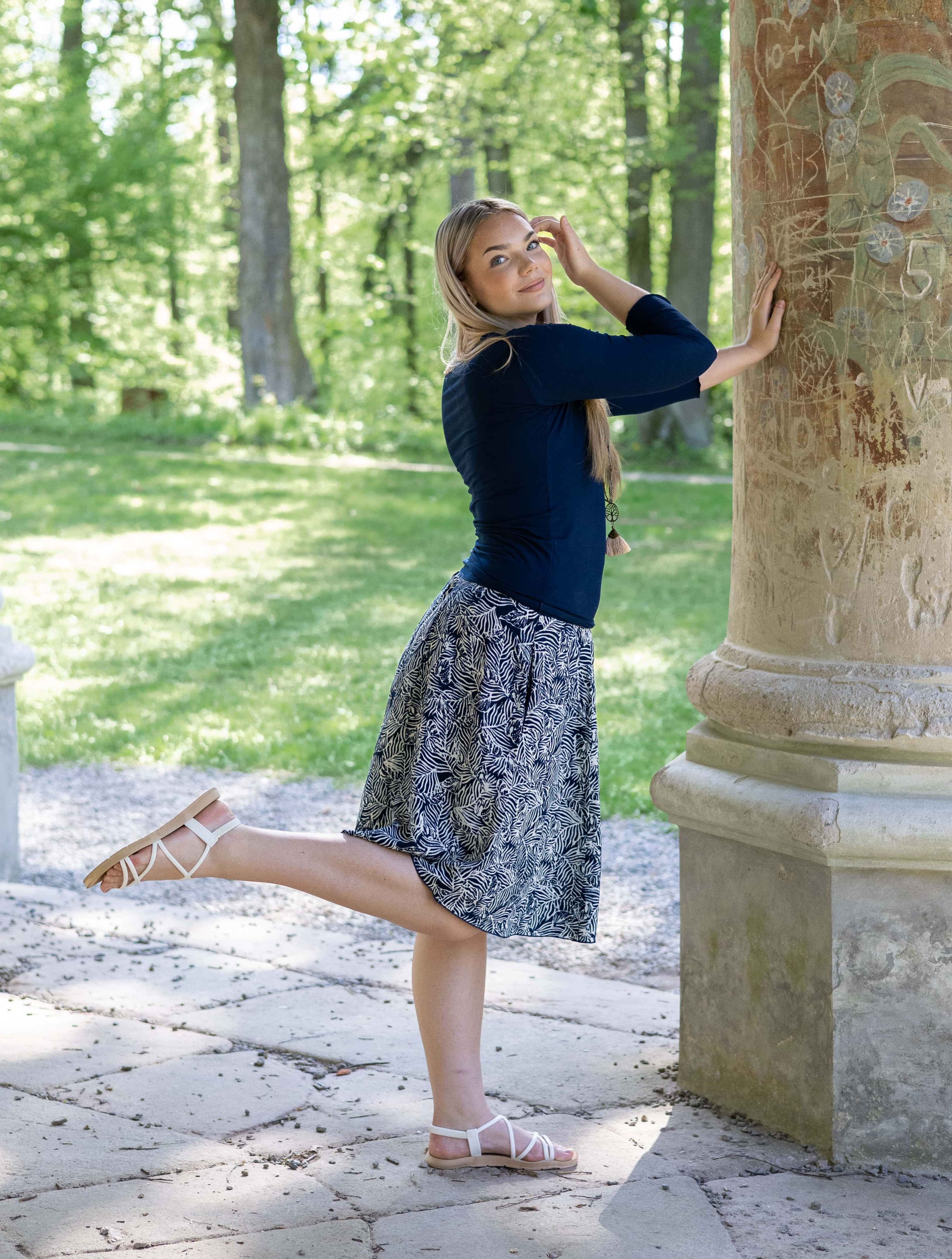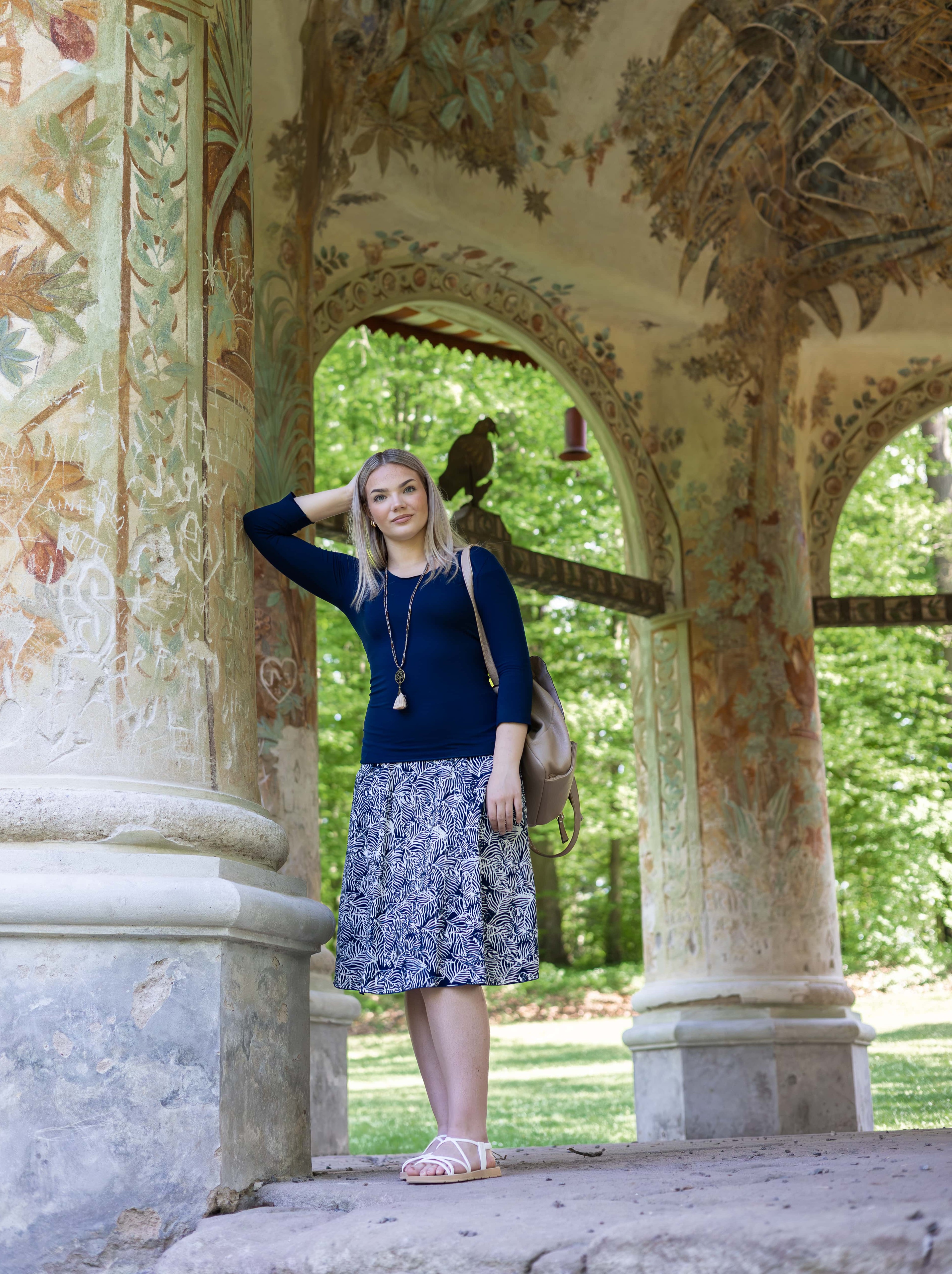 Vysoký elastický pas je nesmírně pohodlný na nošení. Sukně je vhodná i pro těhotné, pružný náplet v pase se krásně přizpůsobí bříšku a obejme ho po celém jeho obvodu. Ikonická Pacha sukně s délkou na dlaň pod kolena vytváří ženskou siluetu, je pohodlná a stylová zároveň.