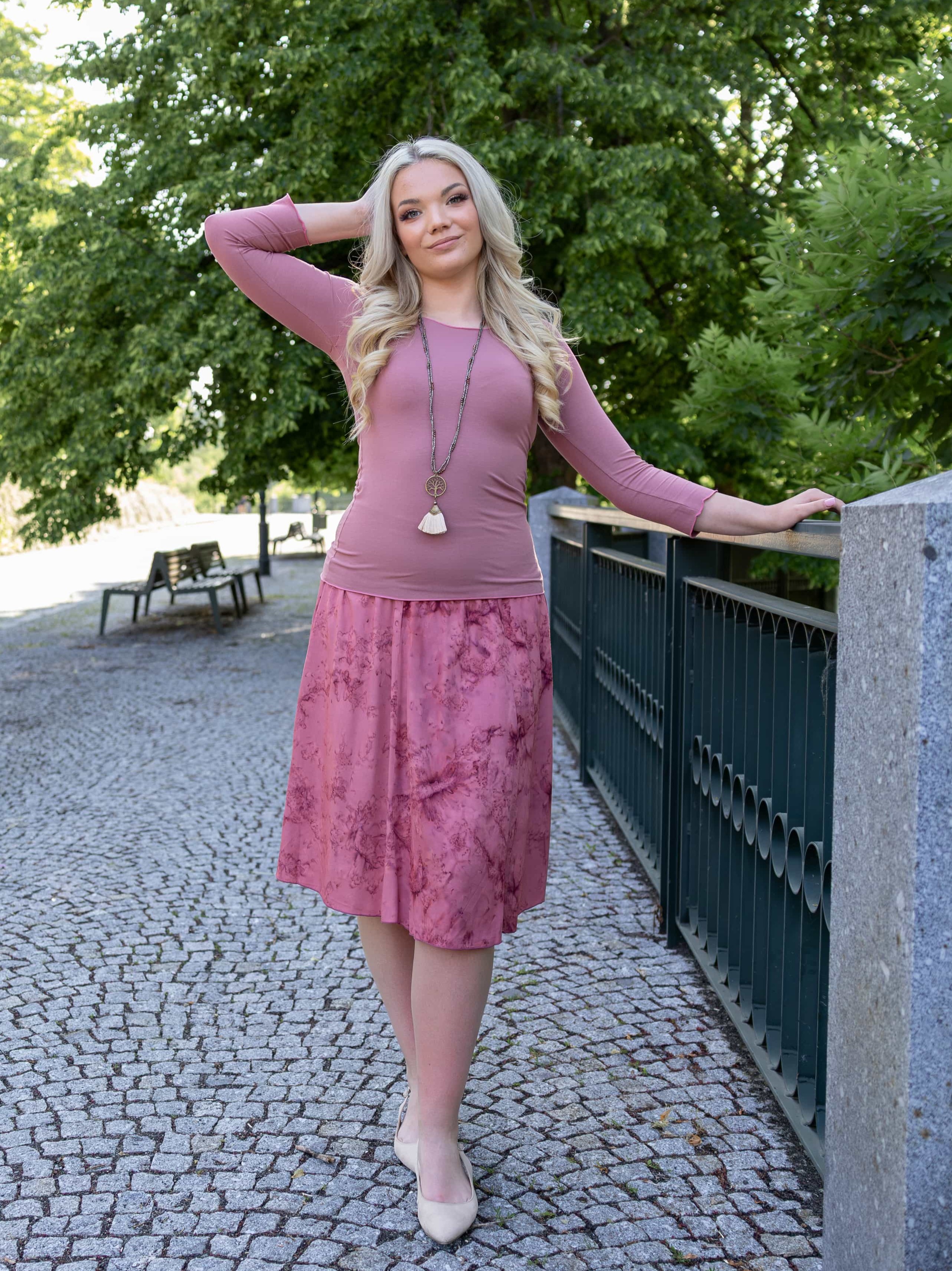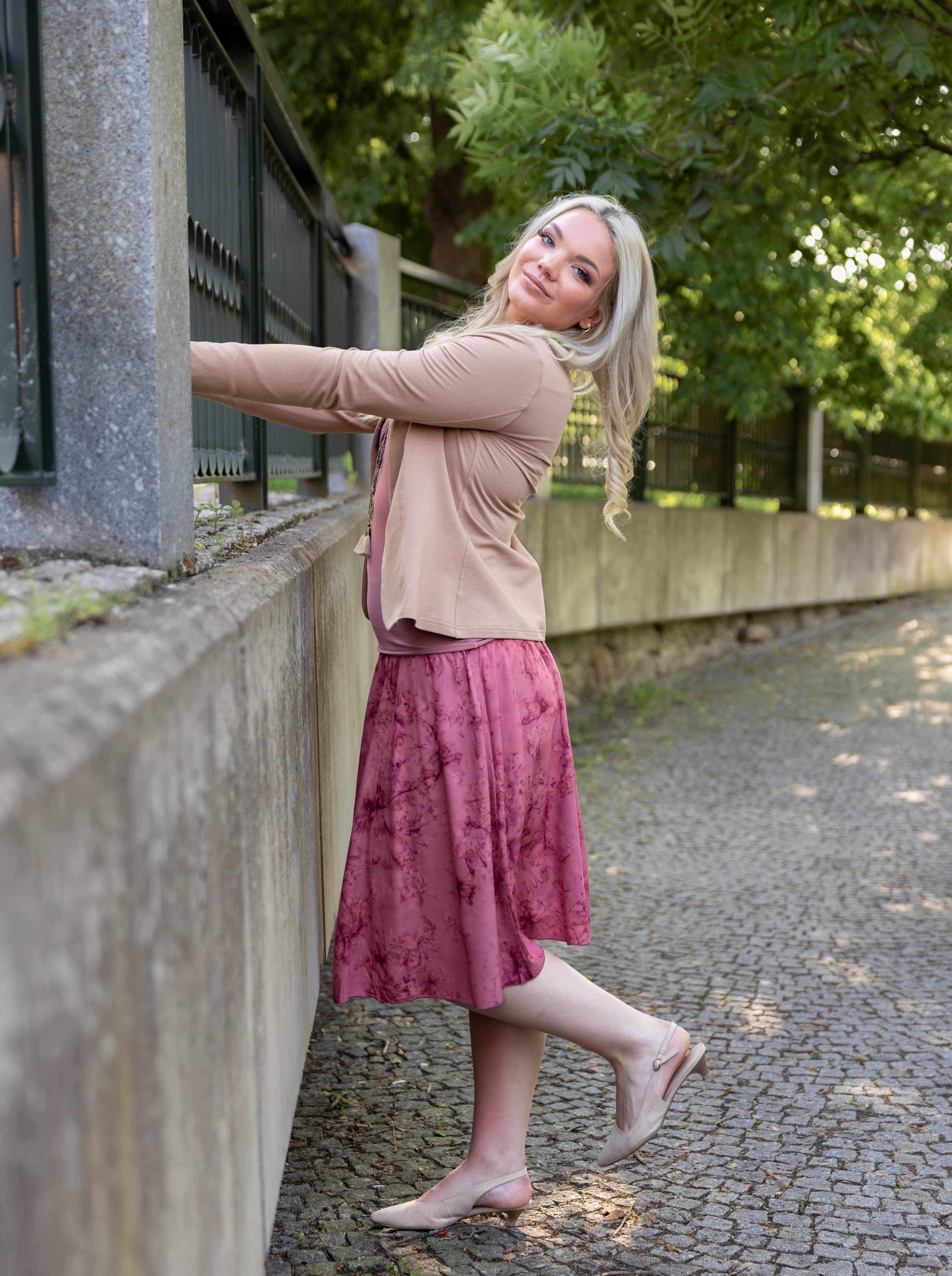 Vysoký elastický pas je nesmírně pohodlný na nošení. Sukně je vhodná i pro těhotné, pružný náplet v pase se krásně přizpůsobí bříšku a obejme ho po celém jeho obvodu. Ikonická Pacha sukně s délkou na dlaň pod kolena vytváří ženskou siluetu, je pohodlná a stylová zároveň.