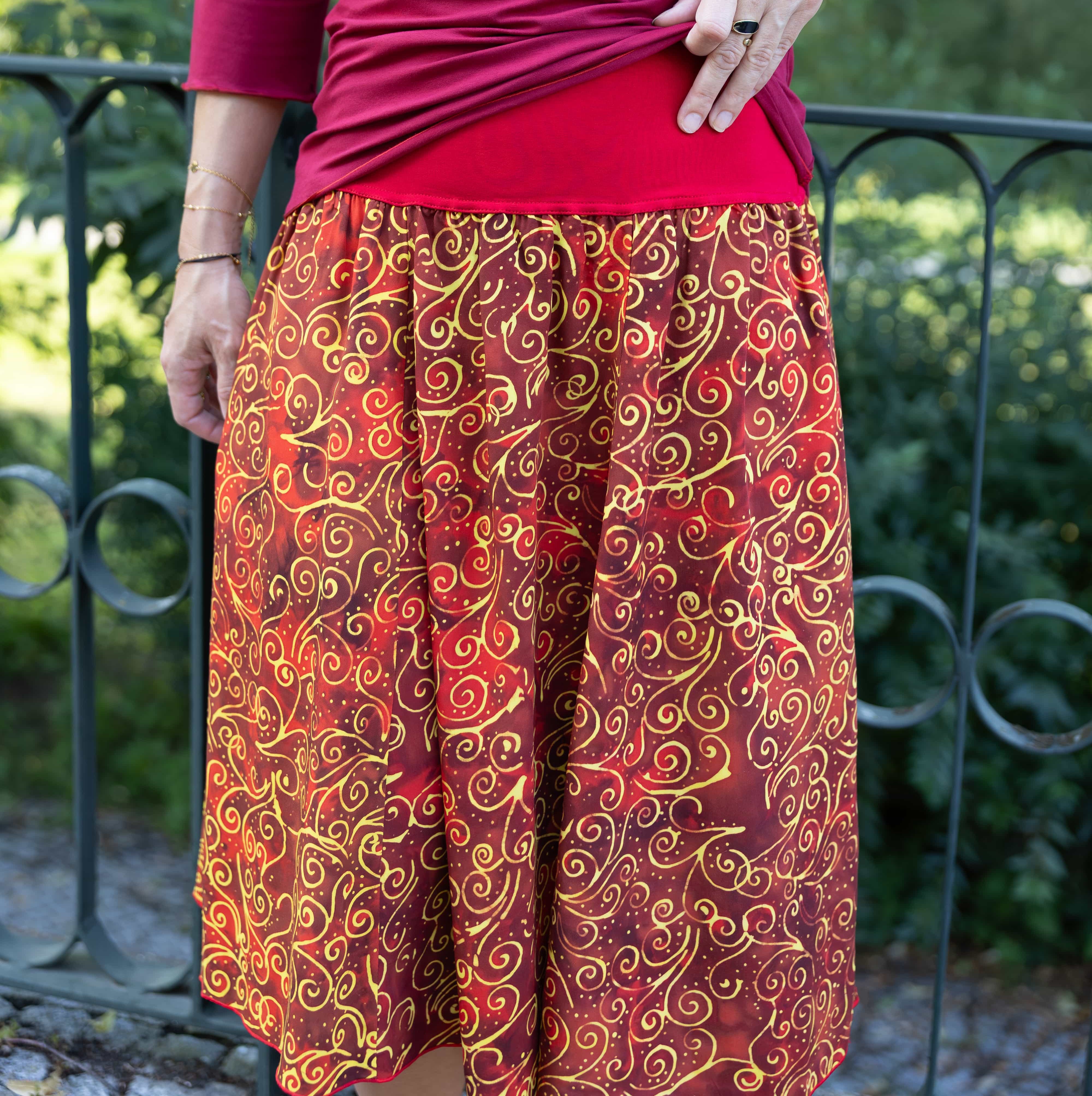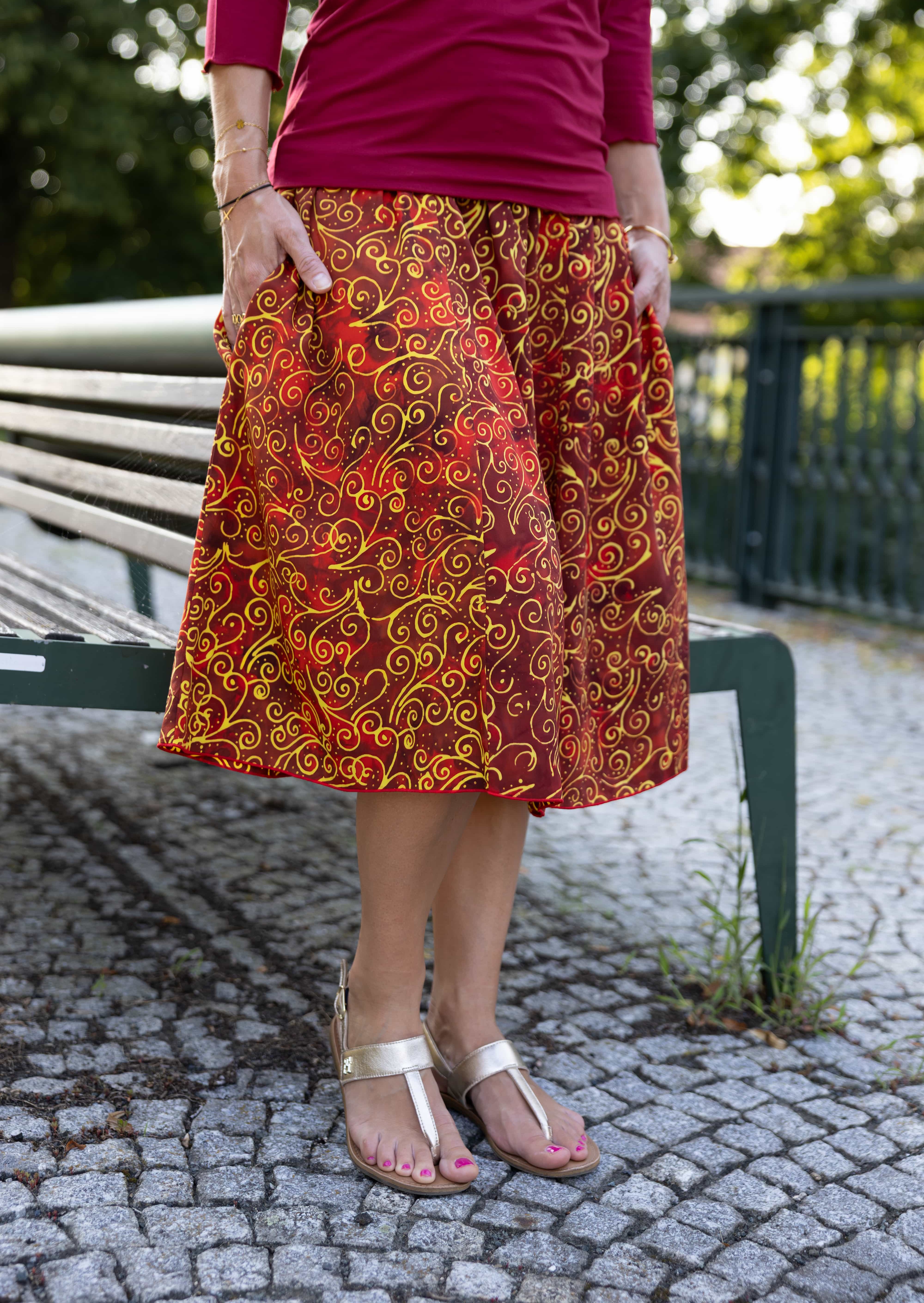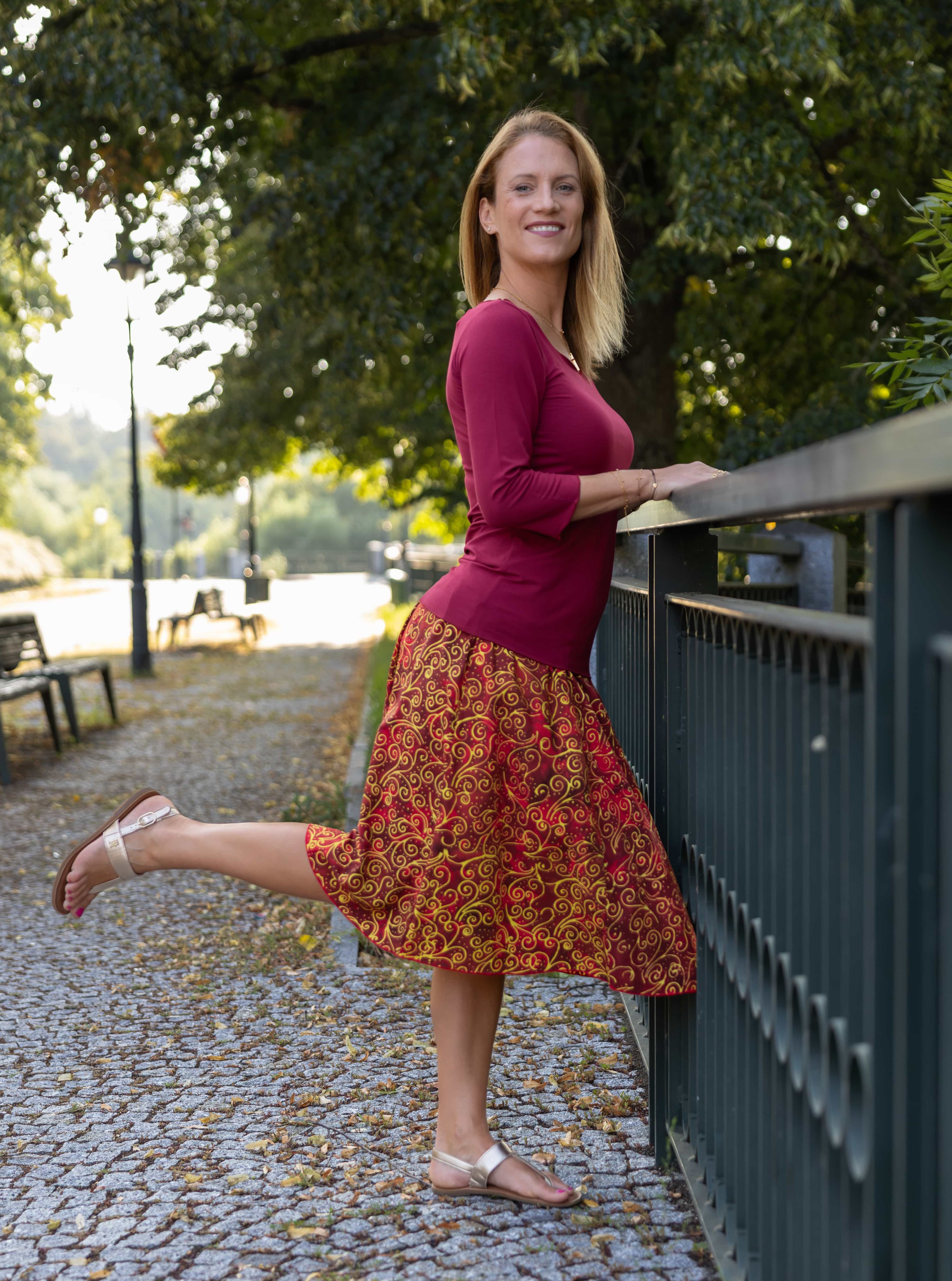 Barva sukně: červená, vínová, žlutý vzor spirál