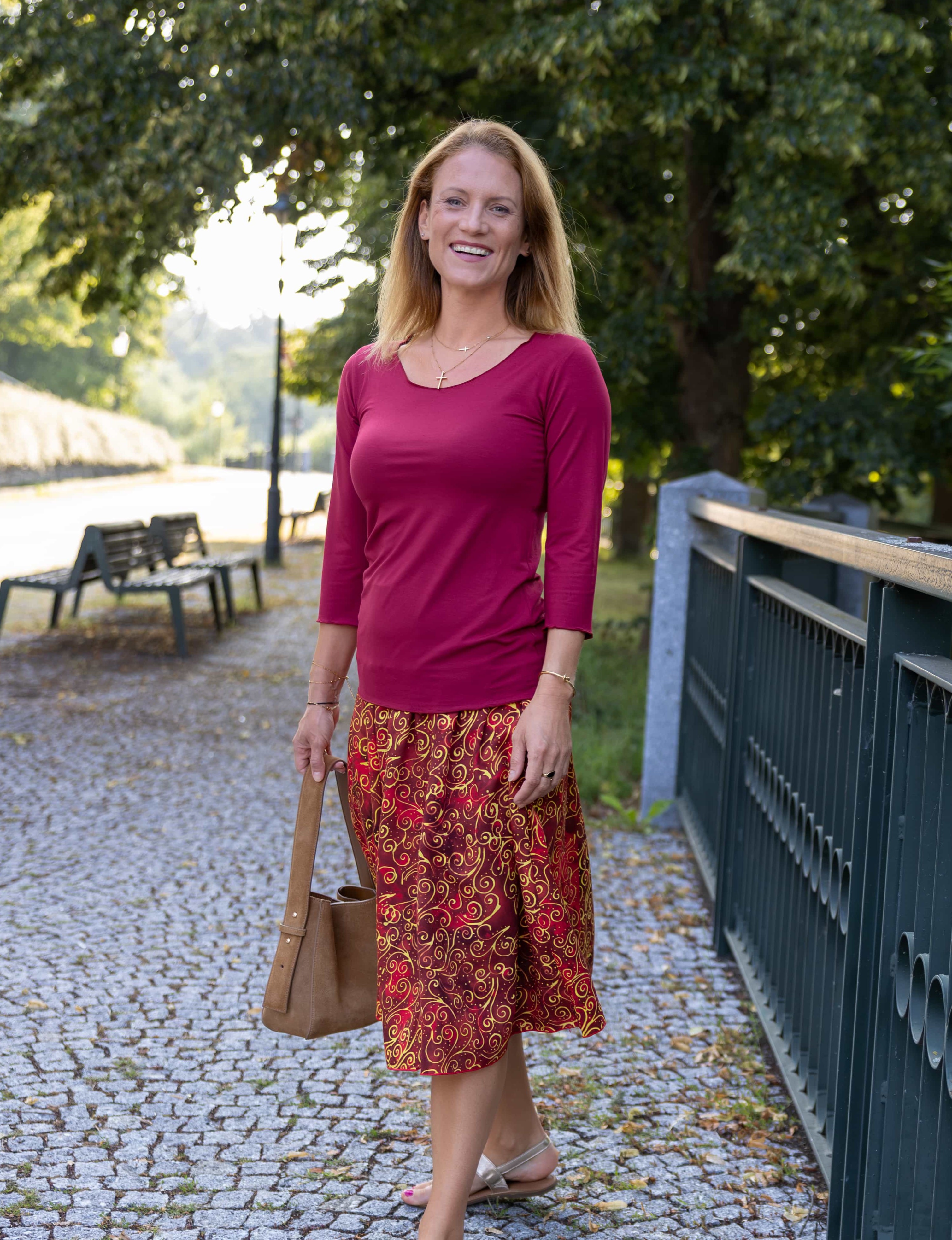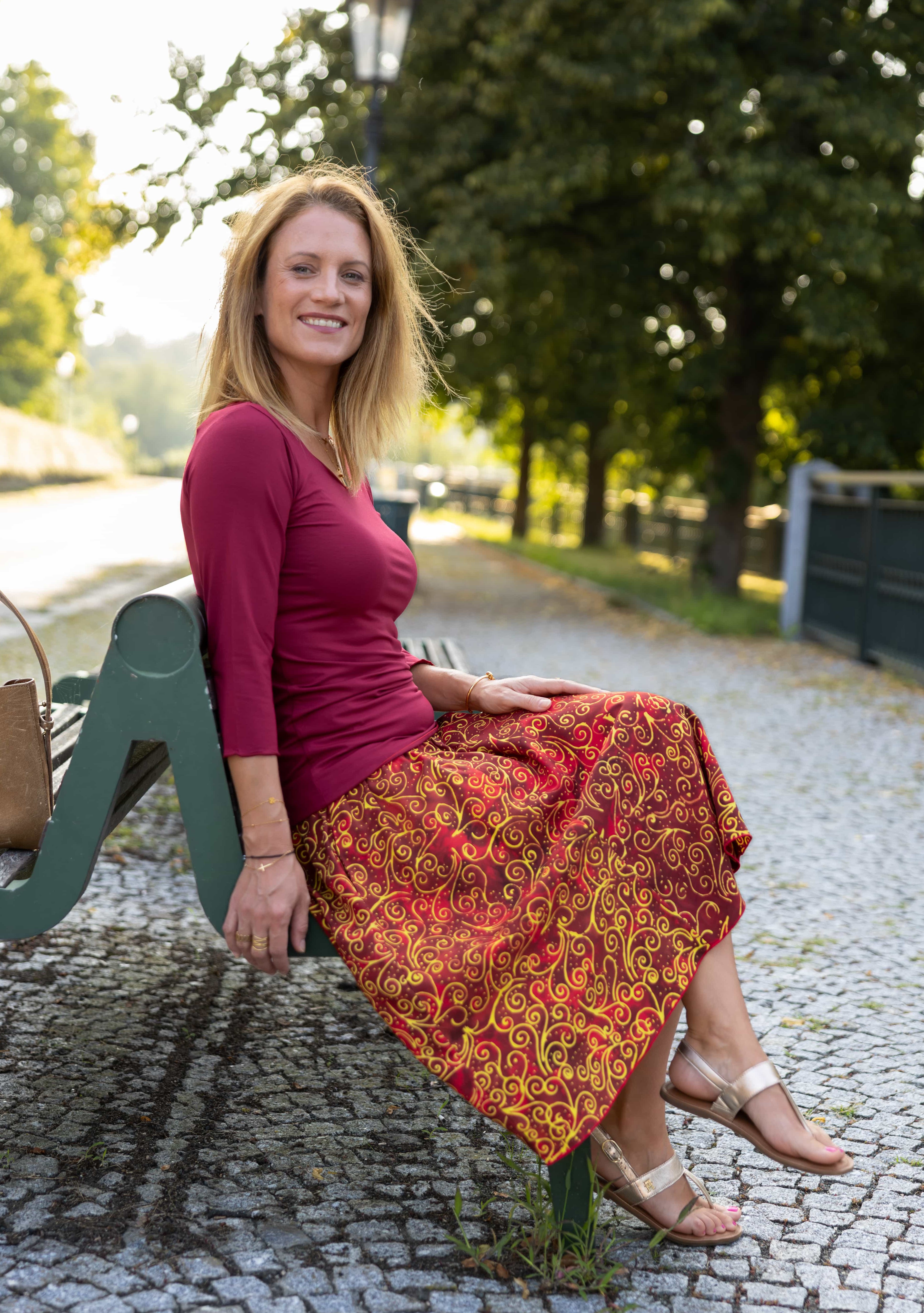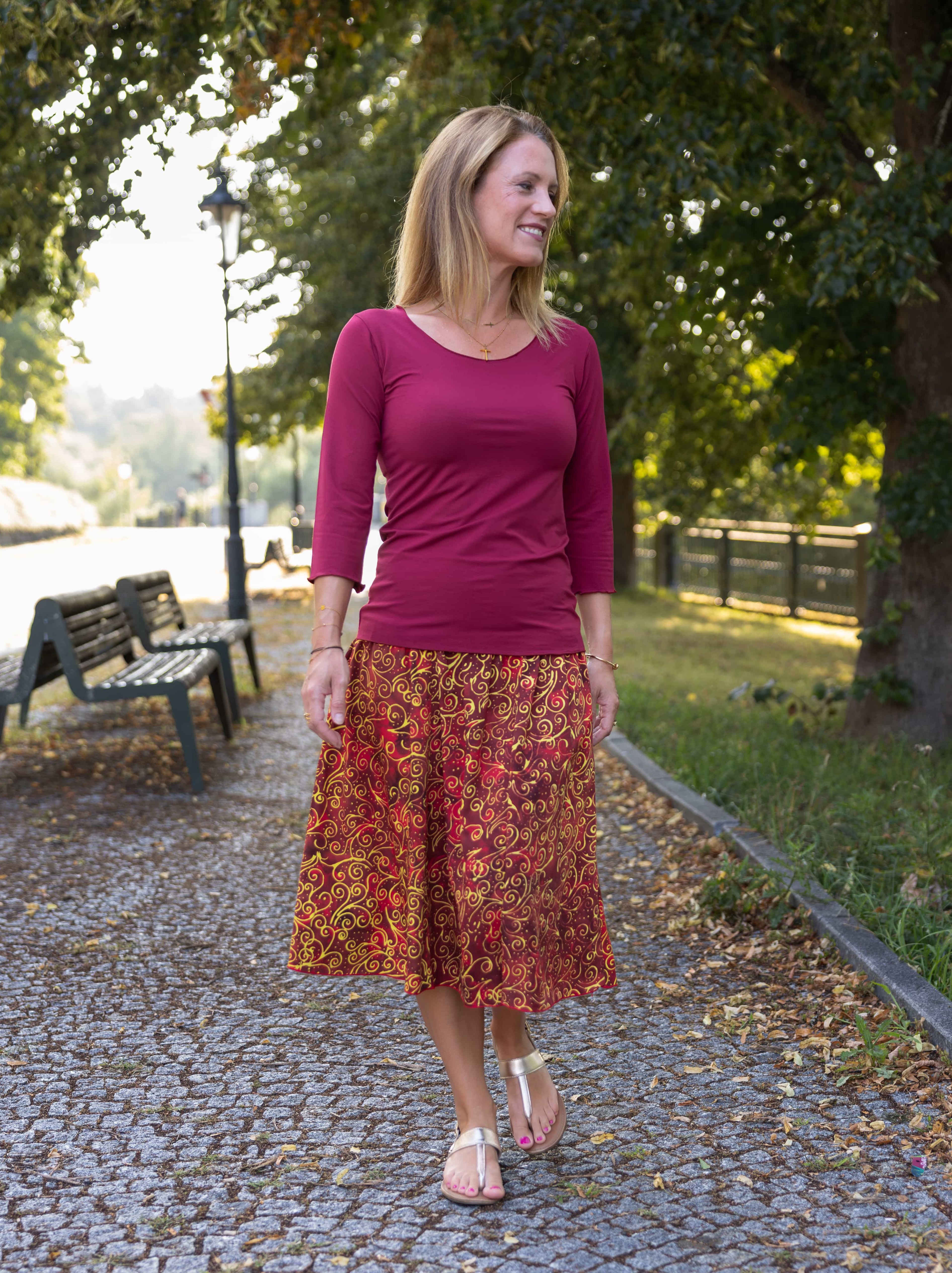 Barva sukně: červená, vínová, žlutý vzor spirál
