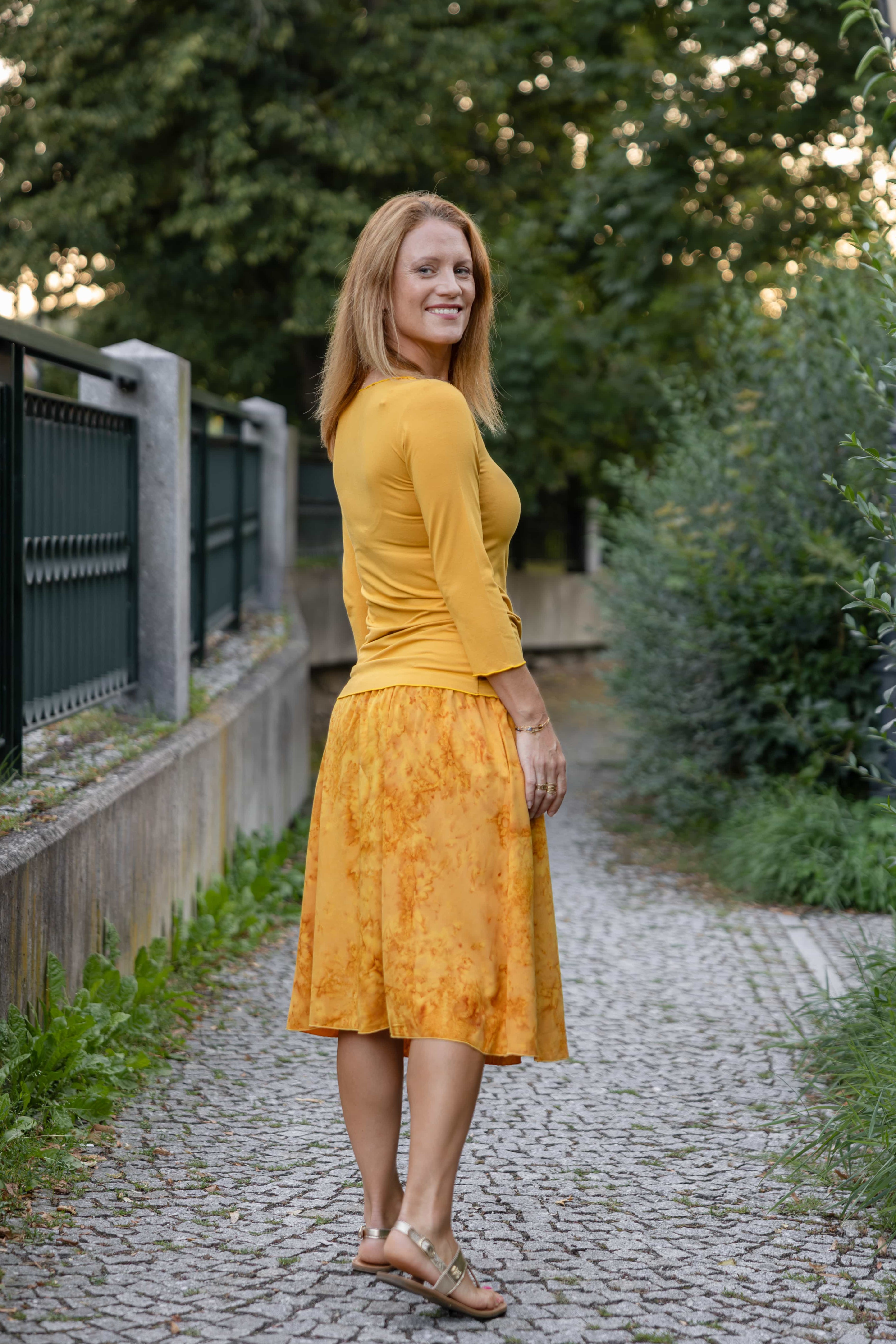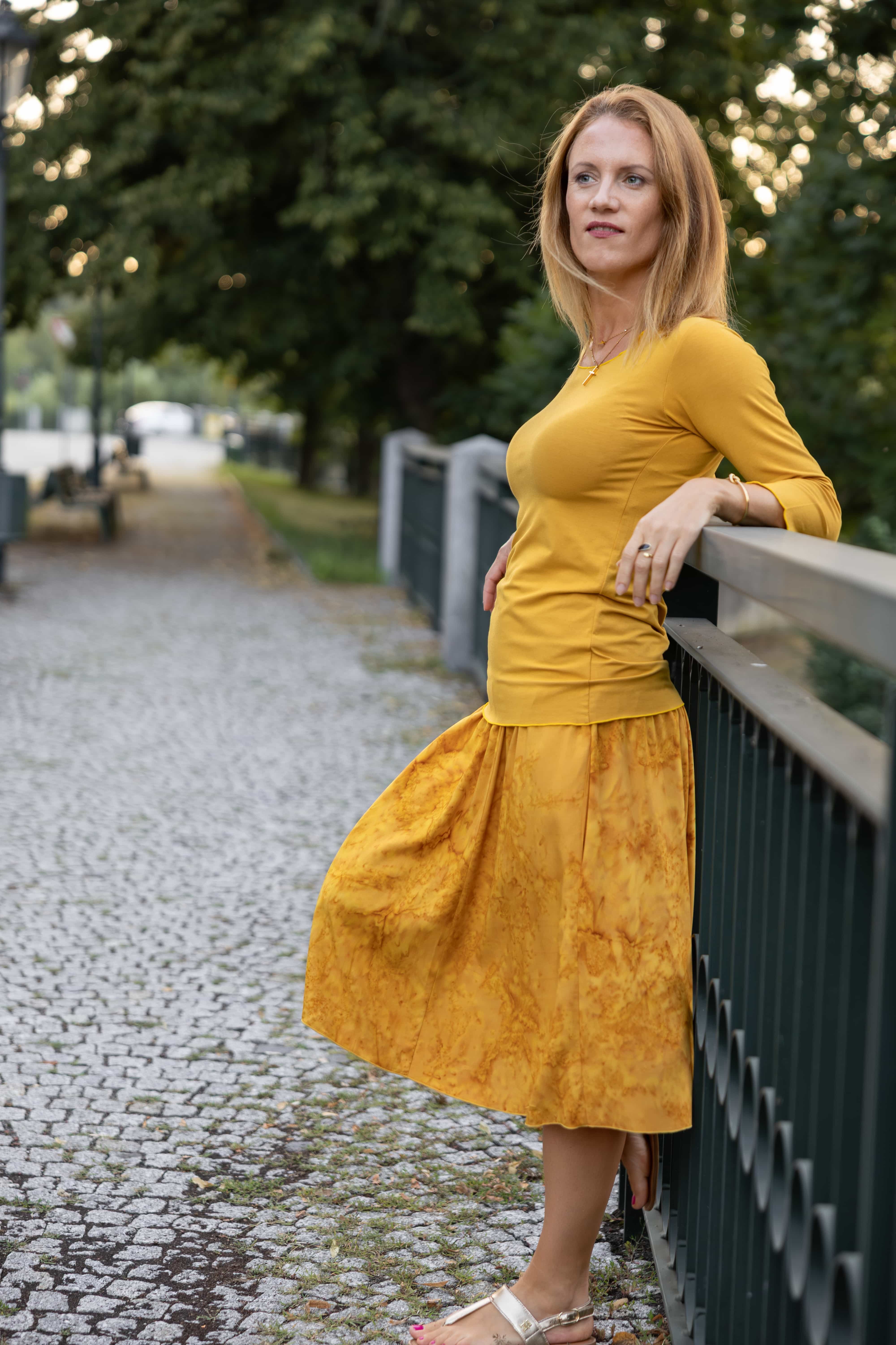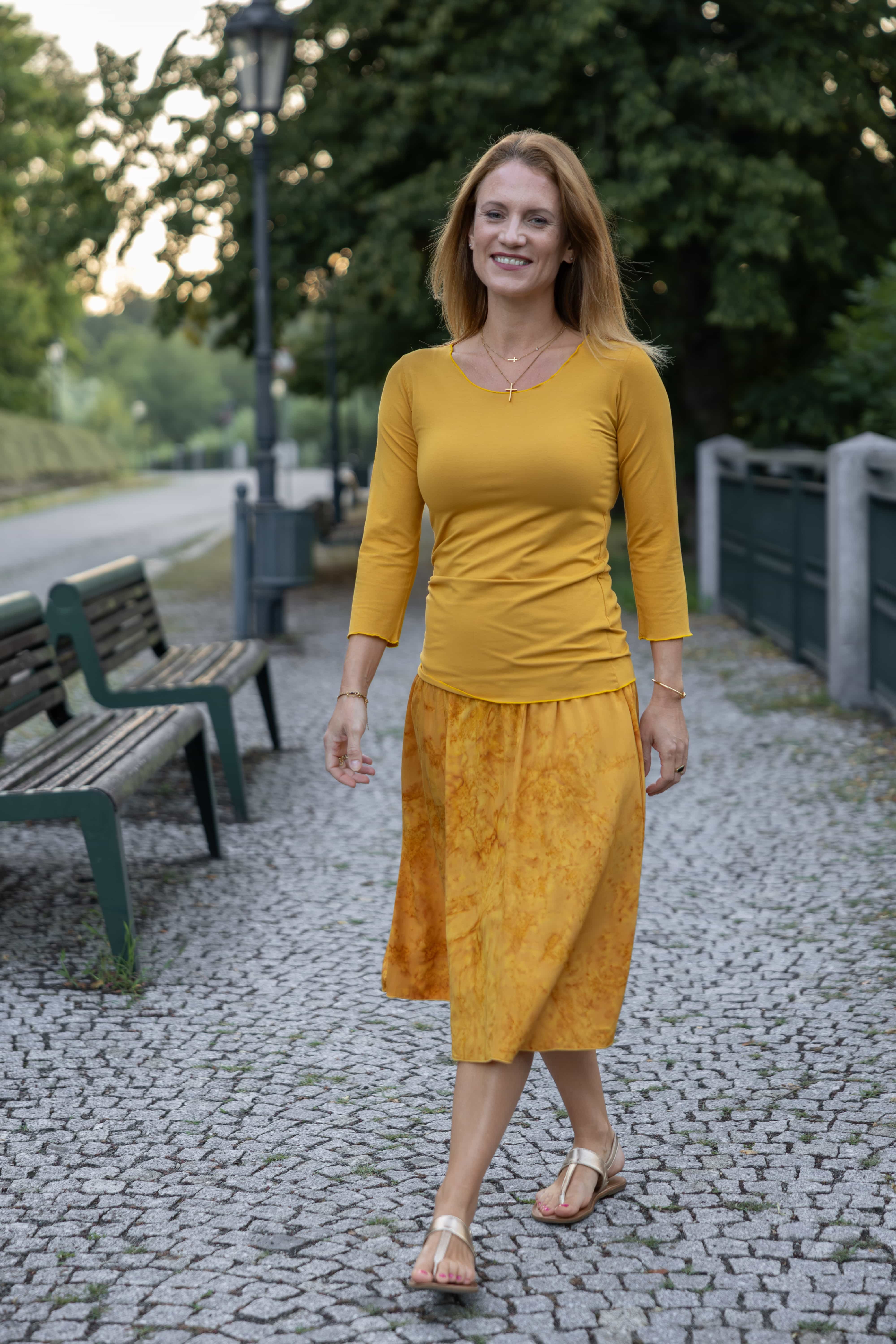 Vysoký elastický pas je nesmírně pohodlný na nošení. Sukně je vhodná i pro těhotné, pružný náplet v pase se krásně přizpůsobí bříšku a obejme ho po celém jeho obvodu. Ikonická Pacha sukně s délkou na dlaň pod kolena vytváří ženskou siluetu, je pohodlná a stylová zároveň.