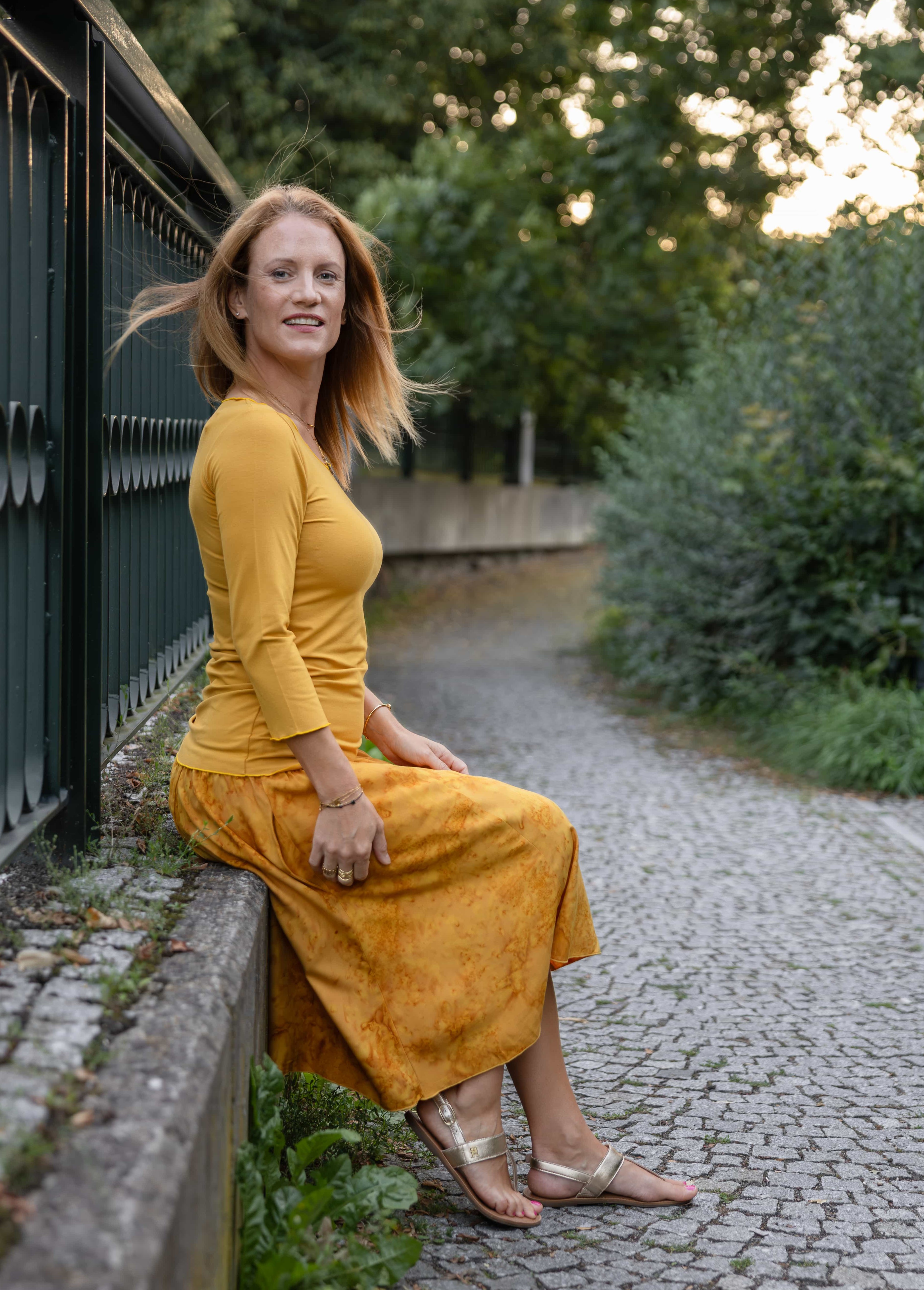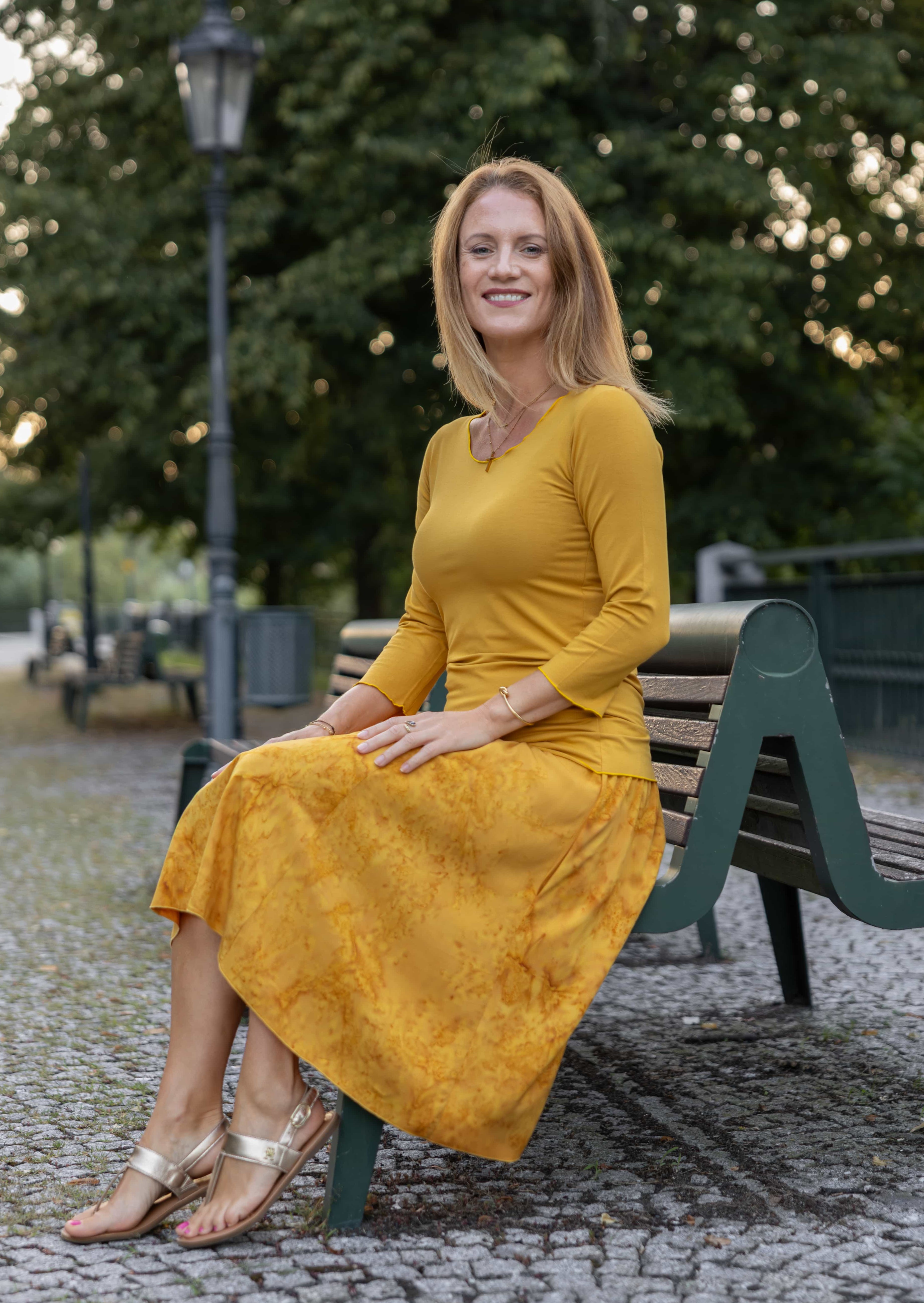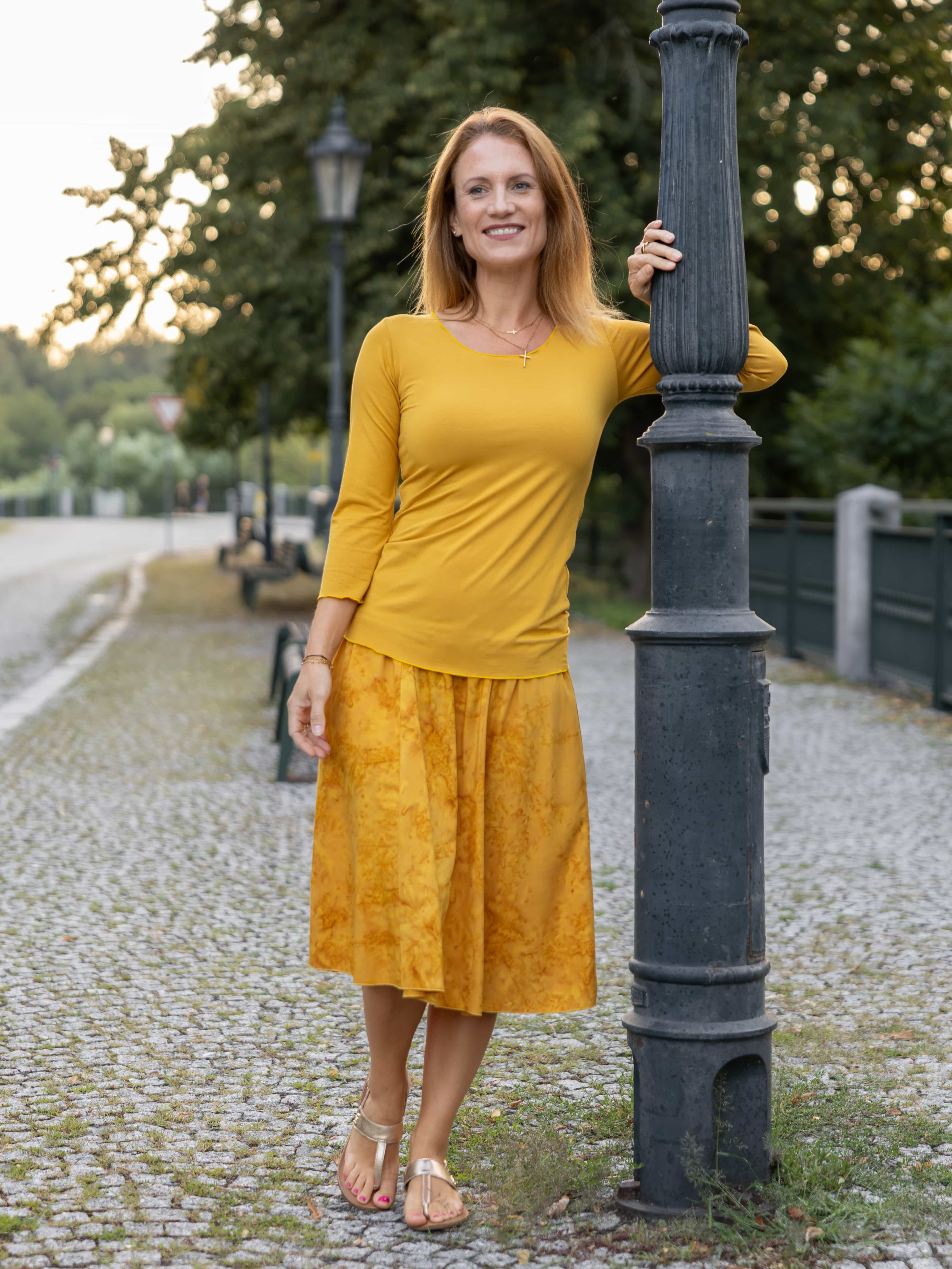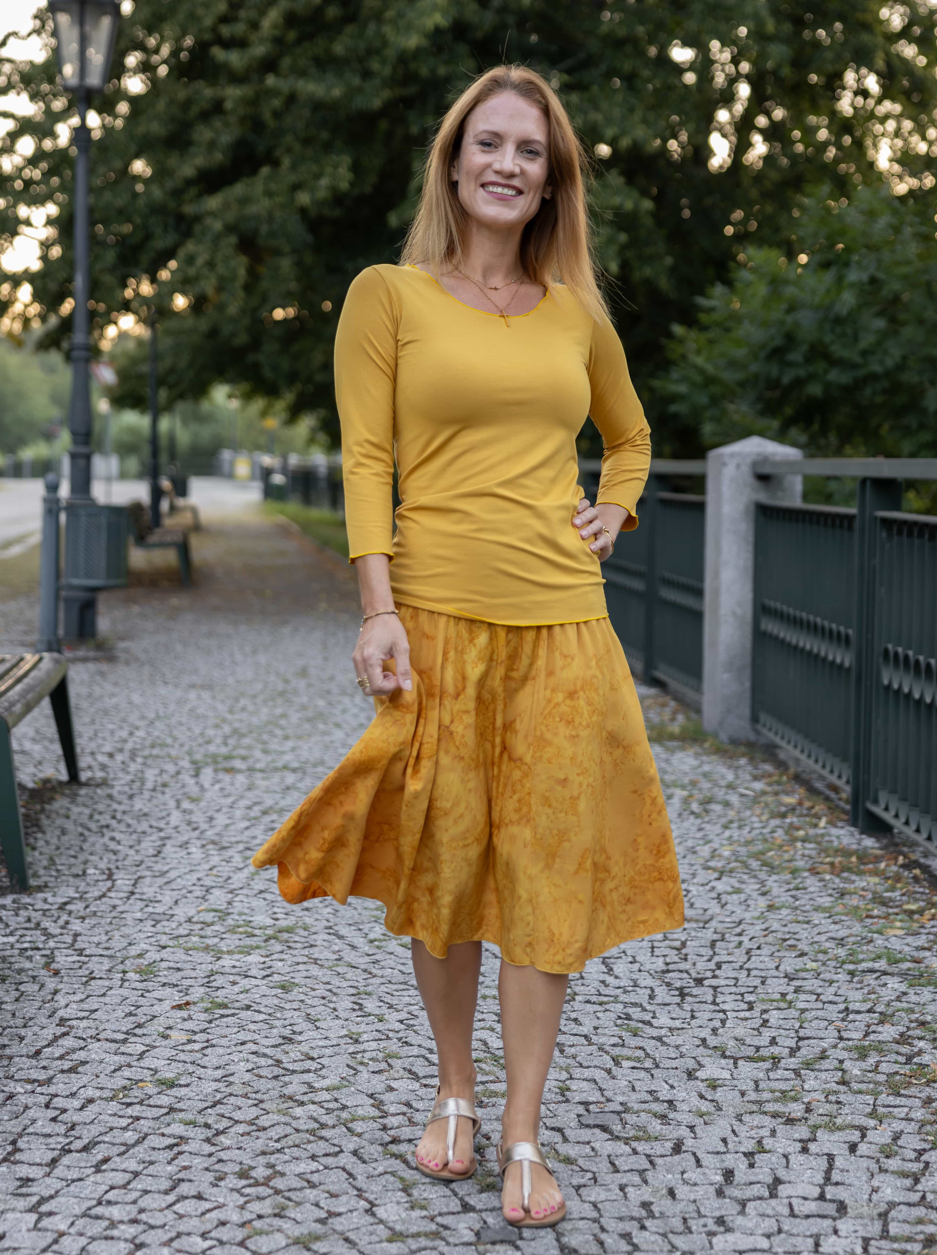 Vysoký elastický pas je nesmírně pohodlný na nošení. Sukně je vhodná i pro těhotné, pružný náplet v pase se krásně přizpůsobí bříšku a obejme ho po celém jeho obvodu. Ikonická Pacha sukně s délkou na dlaň pod kolena vytváří ženskou siluetu, je pohodlná a stylová zároveň.