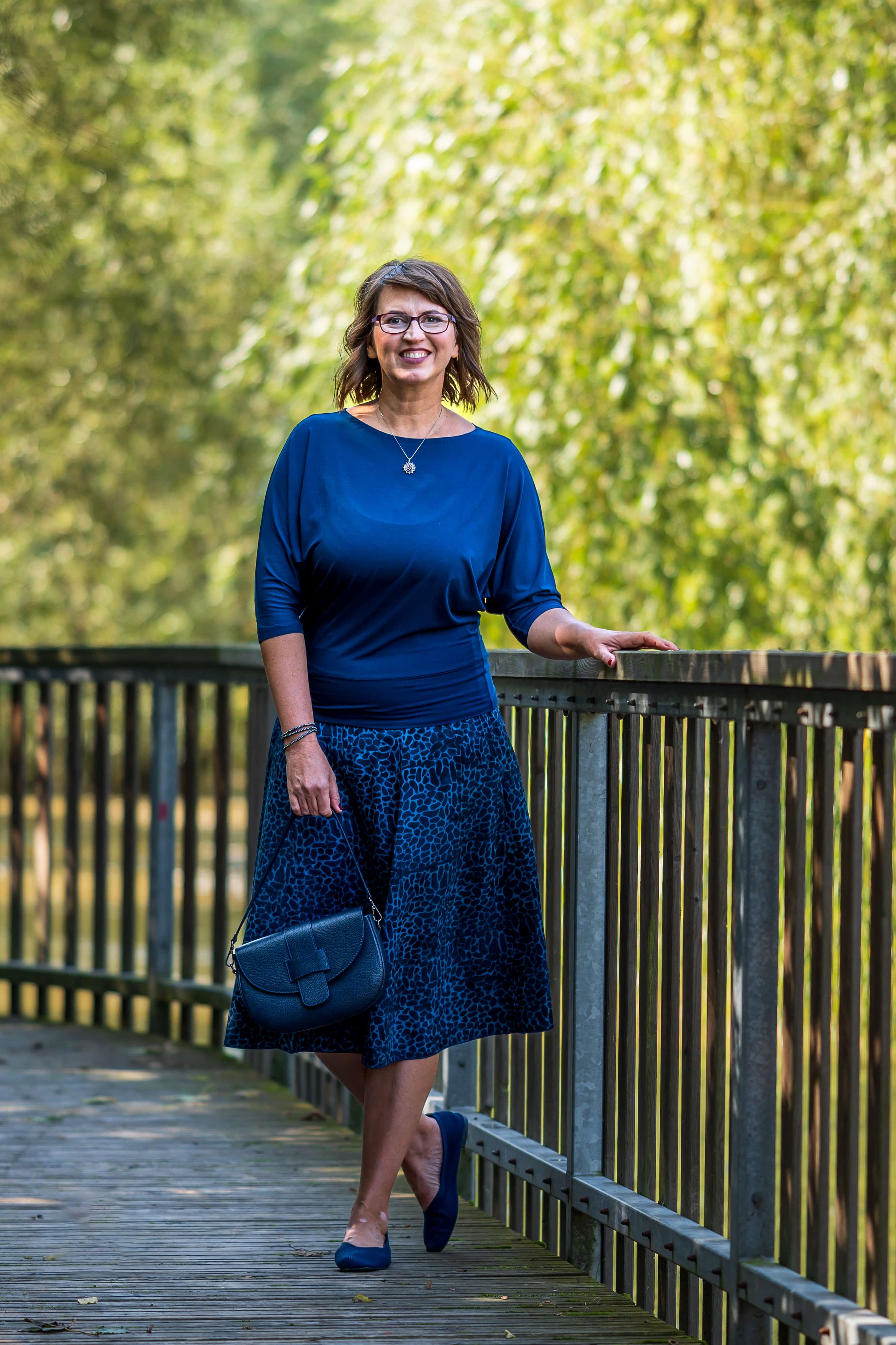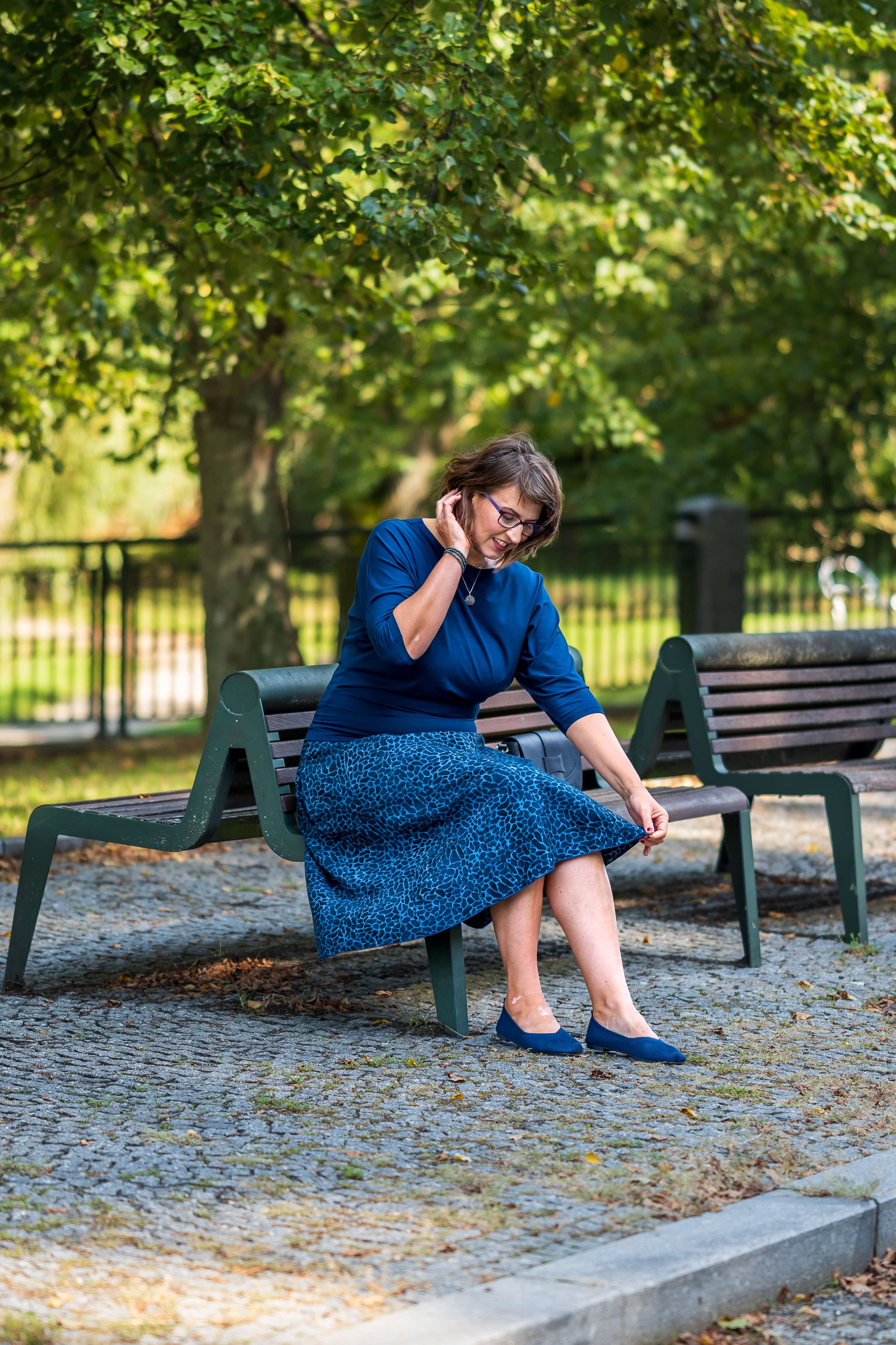 Barva sukně: tmavě modrá a ve vzoru modrošedá