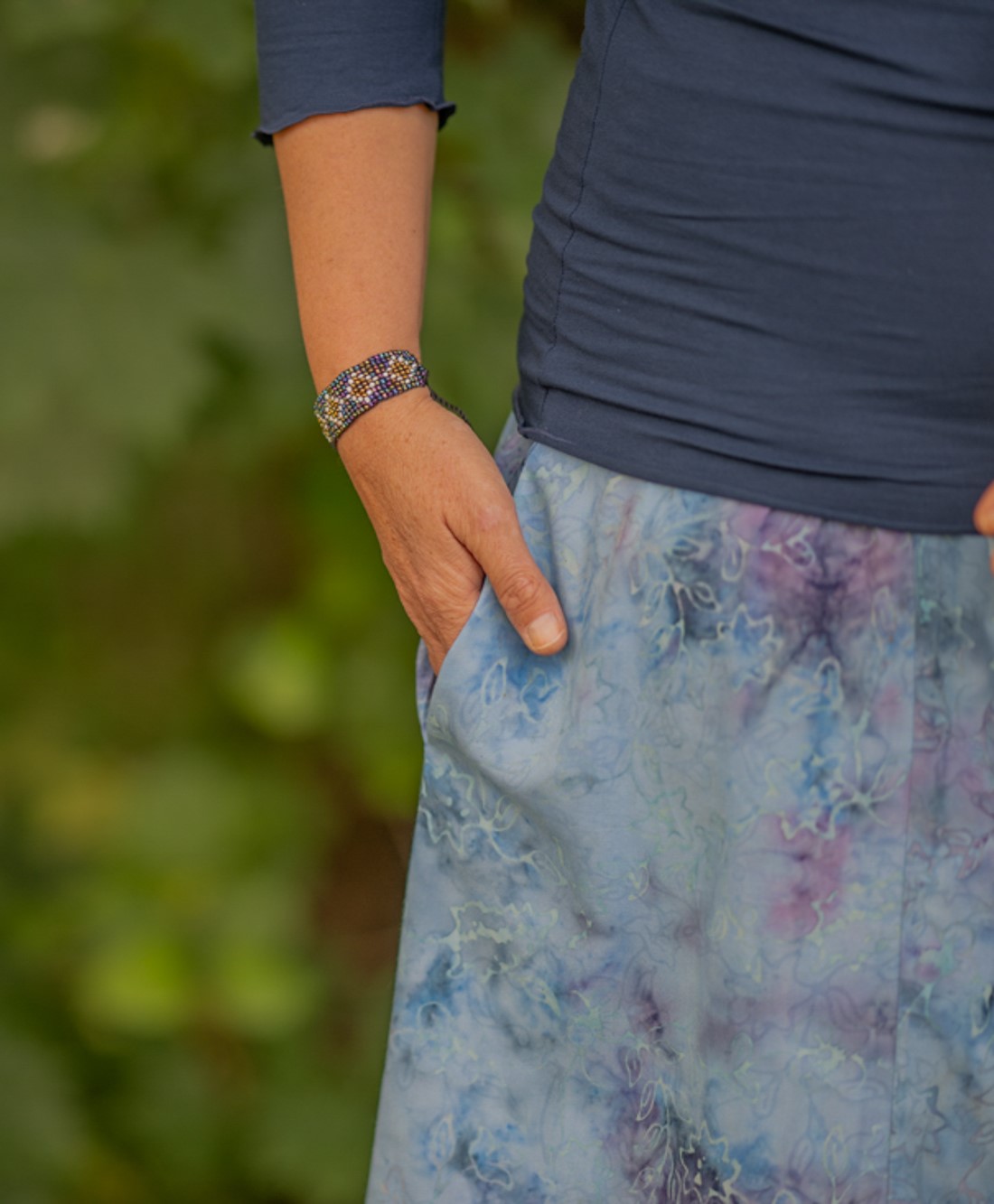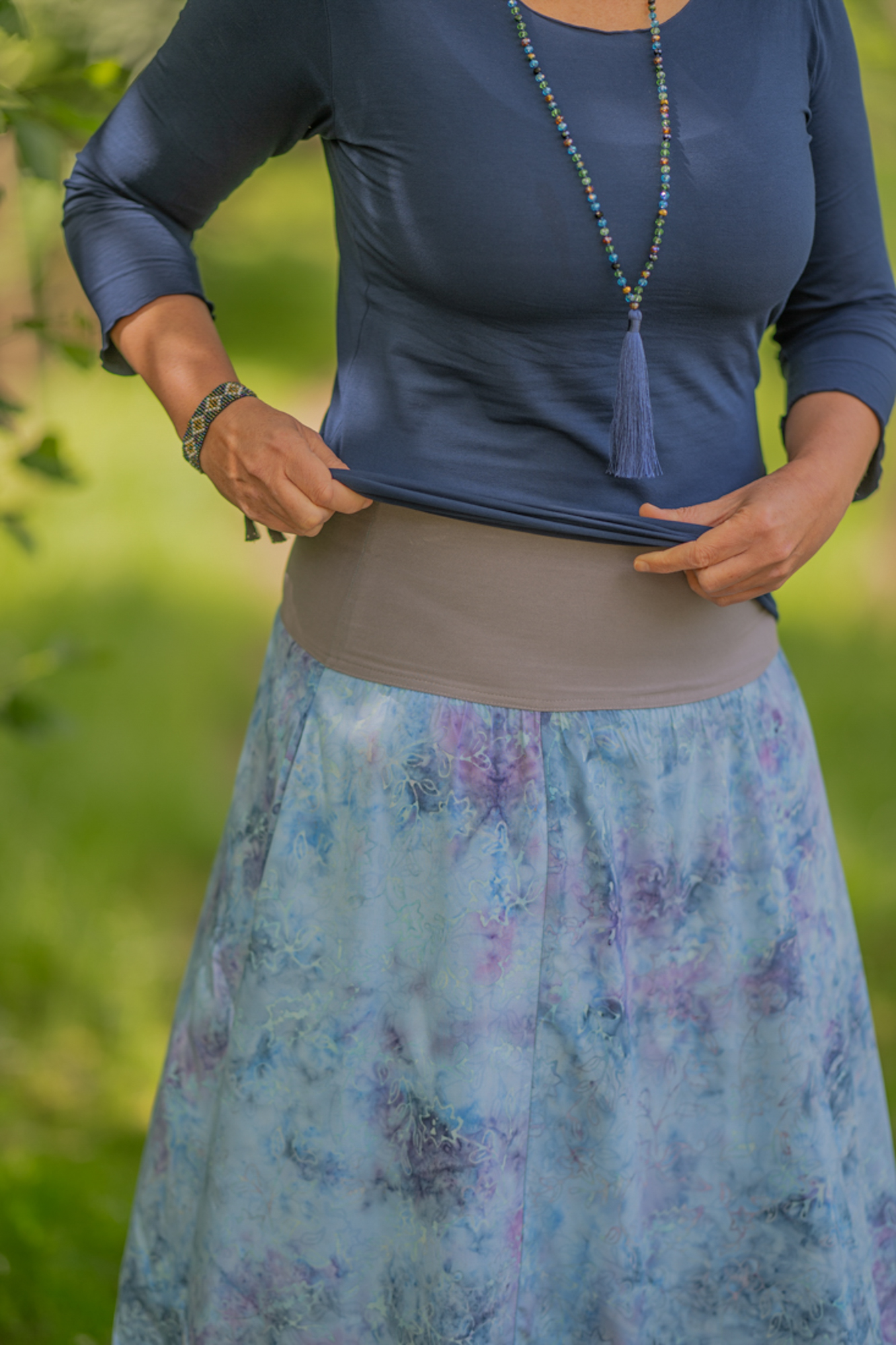 Vysoký elastický pas je nesmírně pohodlný na nošení. Sukně je vhodná i pro těhotné, pružný náplet v pase se krásně přizpůsobí bříšku a obejme ho po celém jeho obvodu. Ikonická Pacha sukně s délkou na dlaň pod kolena vytváří ženskou siluetu, je pohodlná a stylová zároveň.