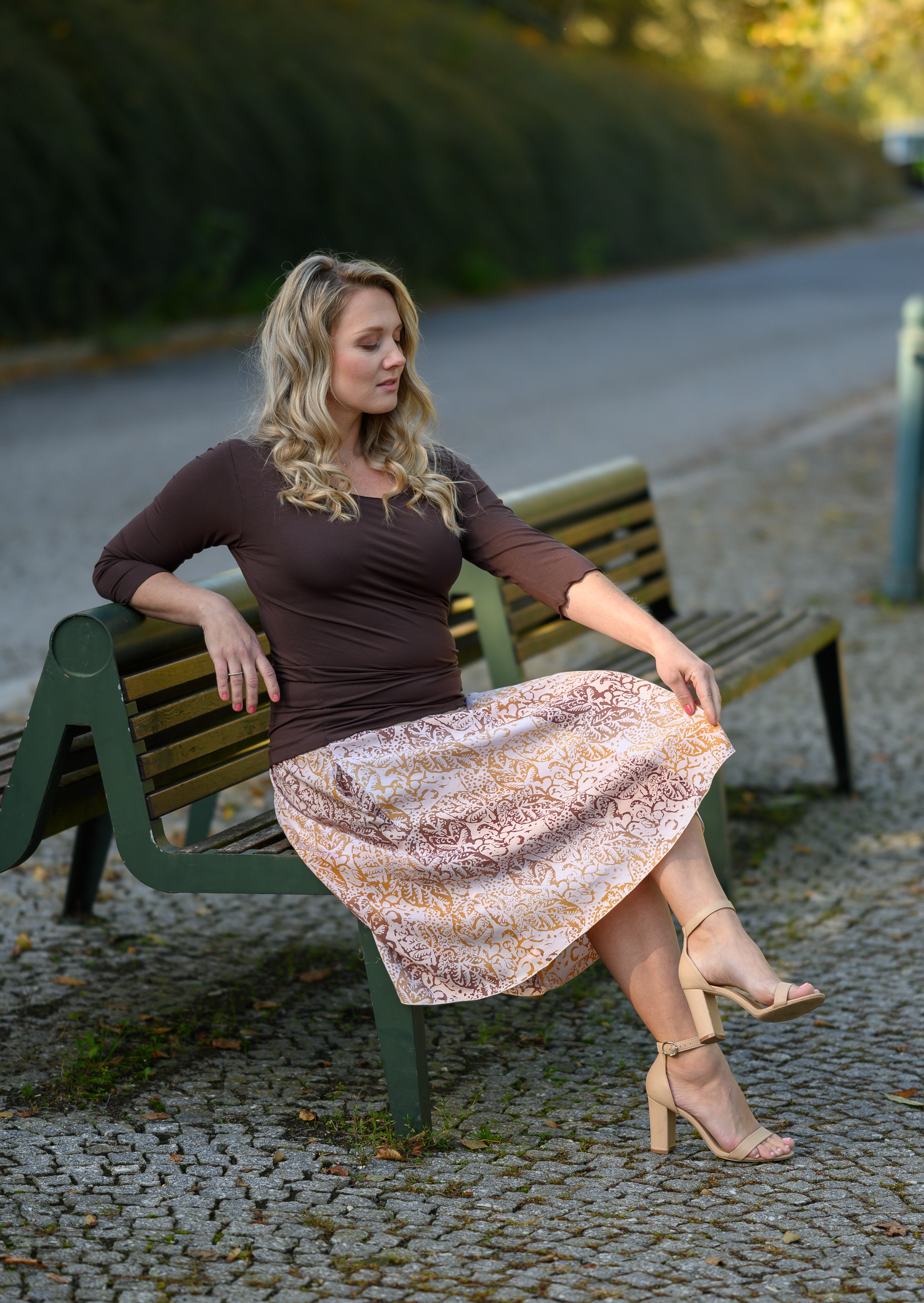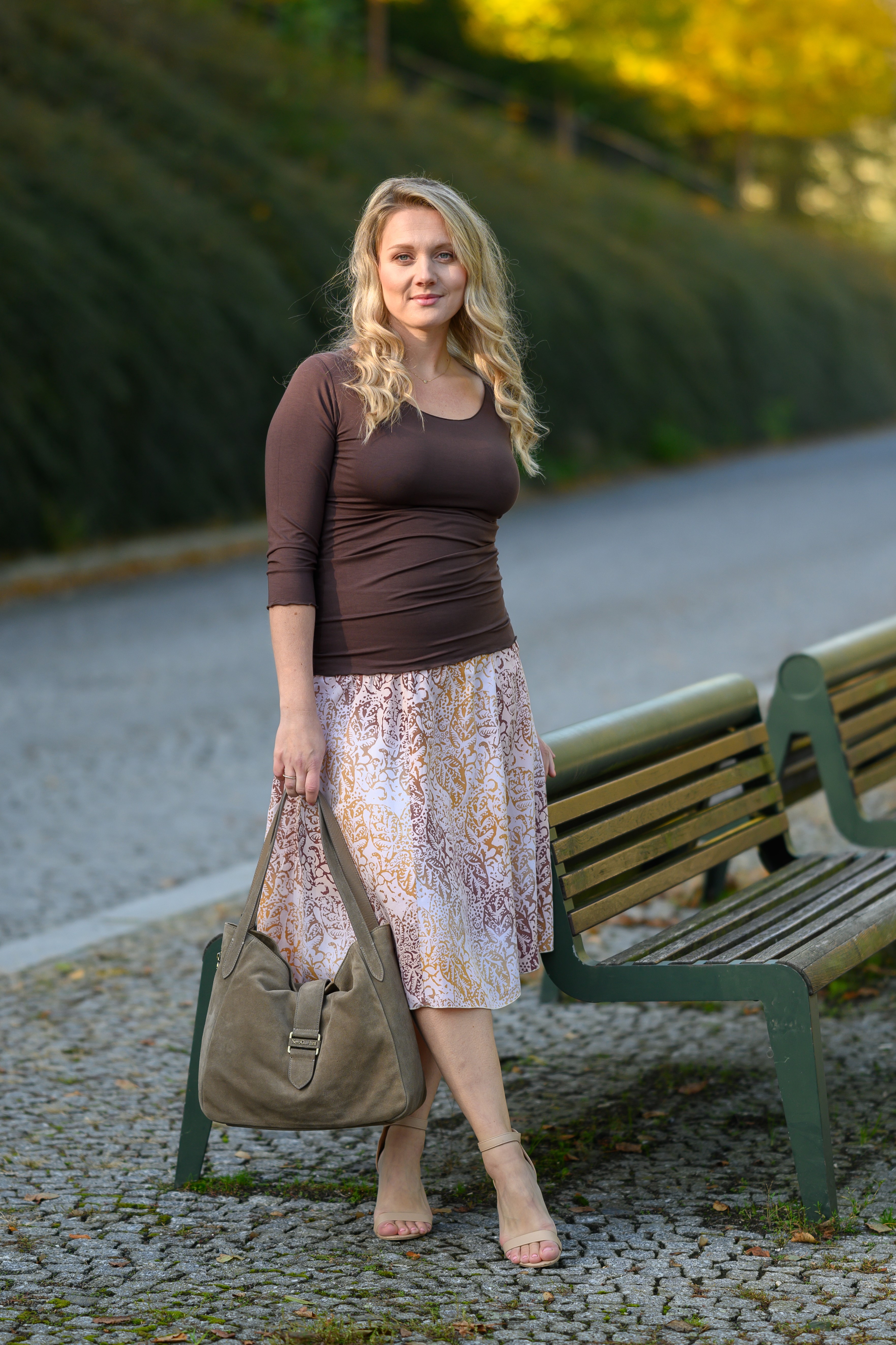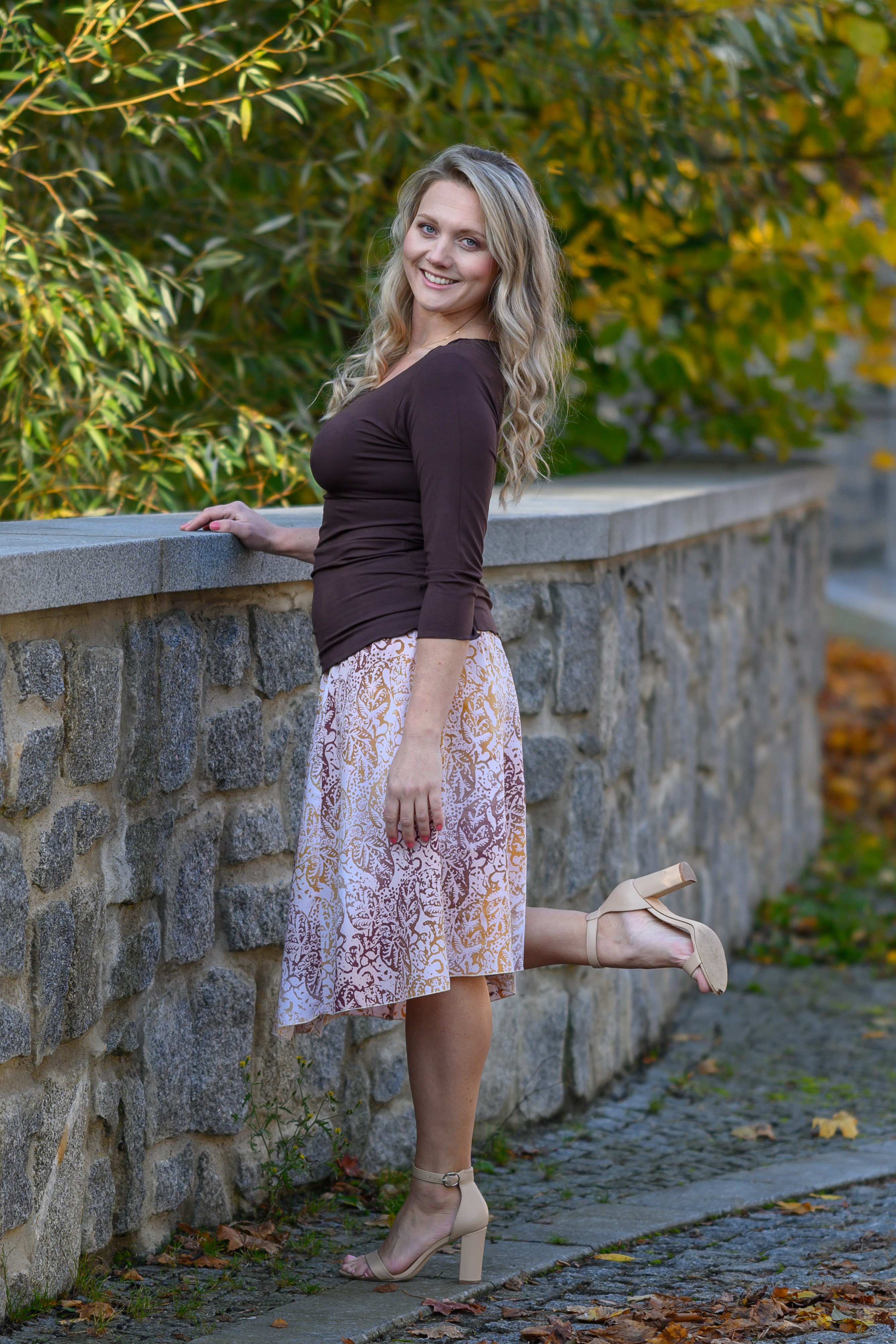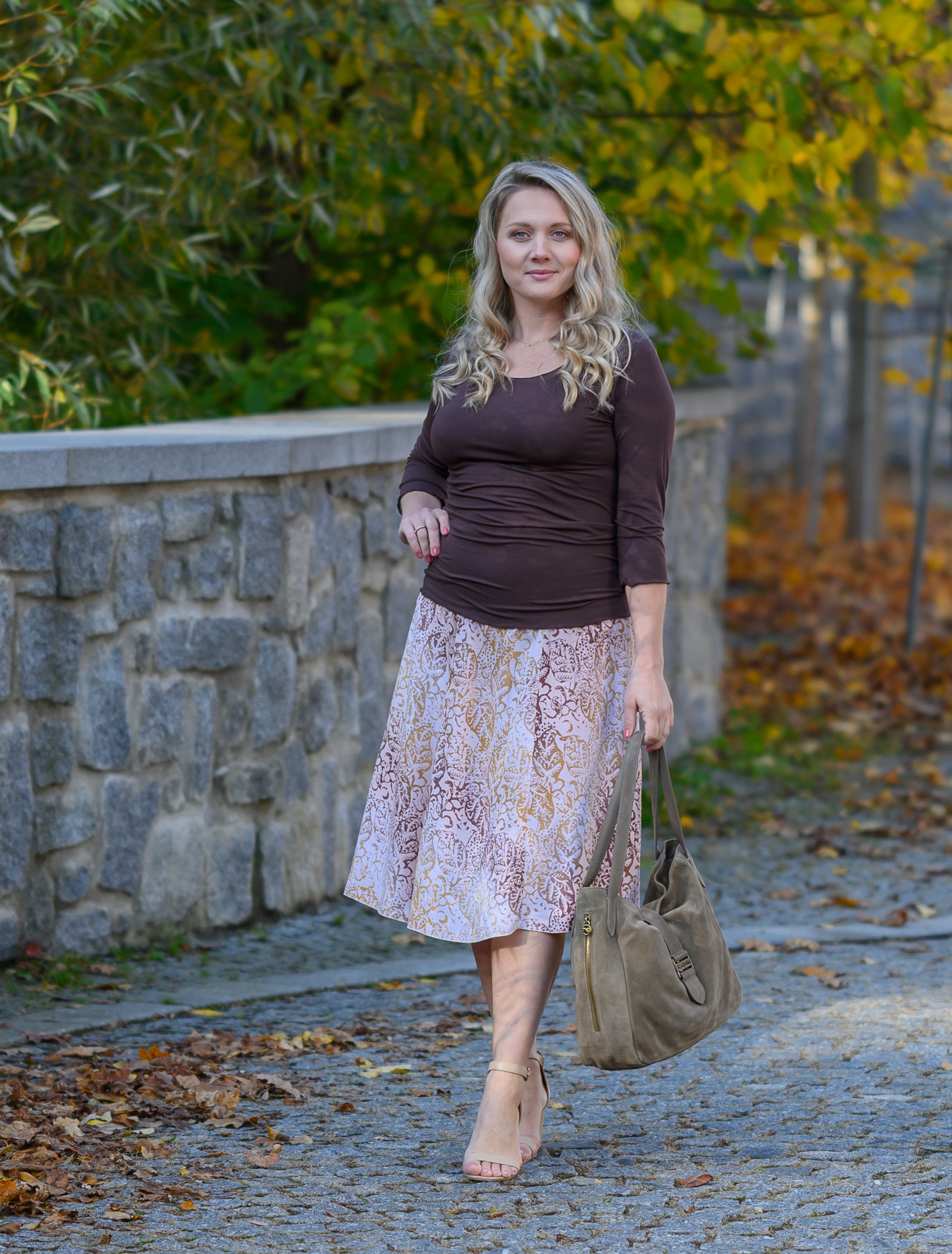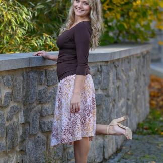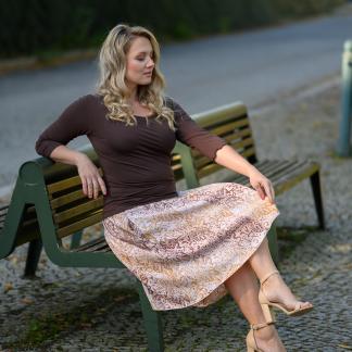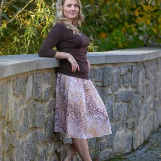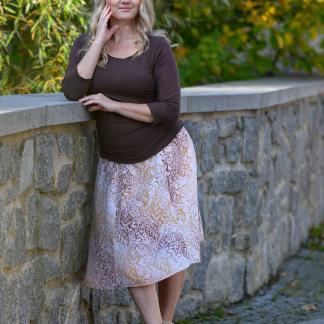 Barva sukně: barva smetanového latté se vzorem listů ve zlaté, okrově žluté až světle hnědé