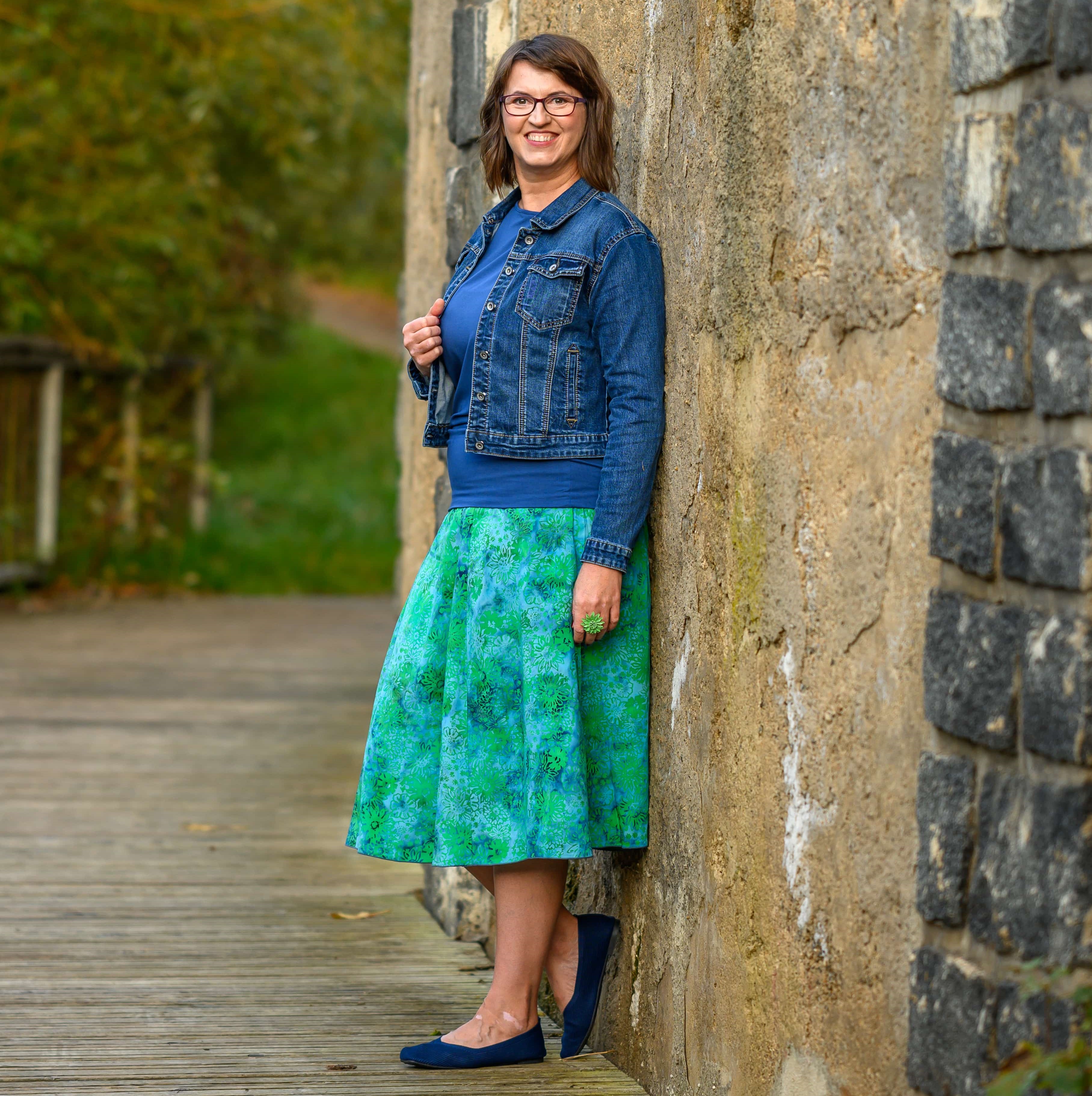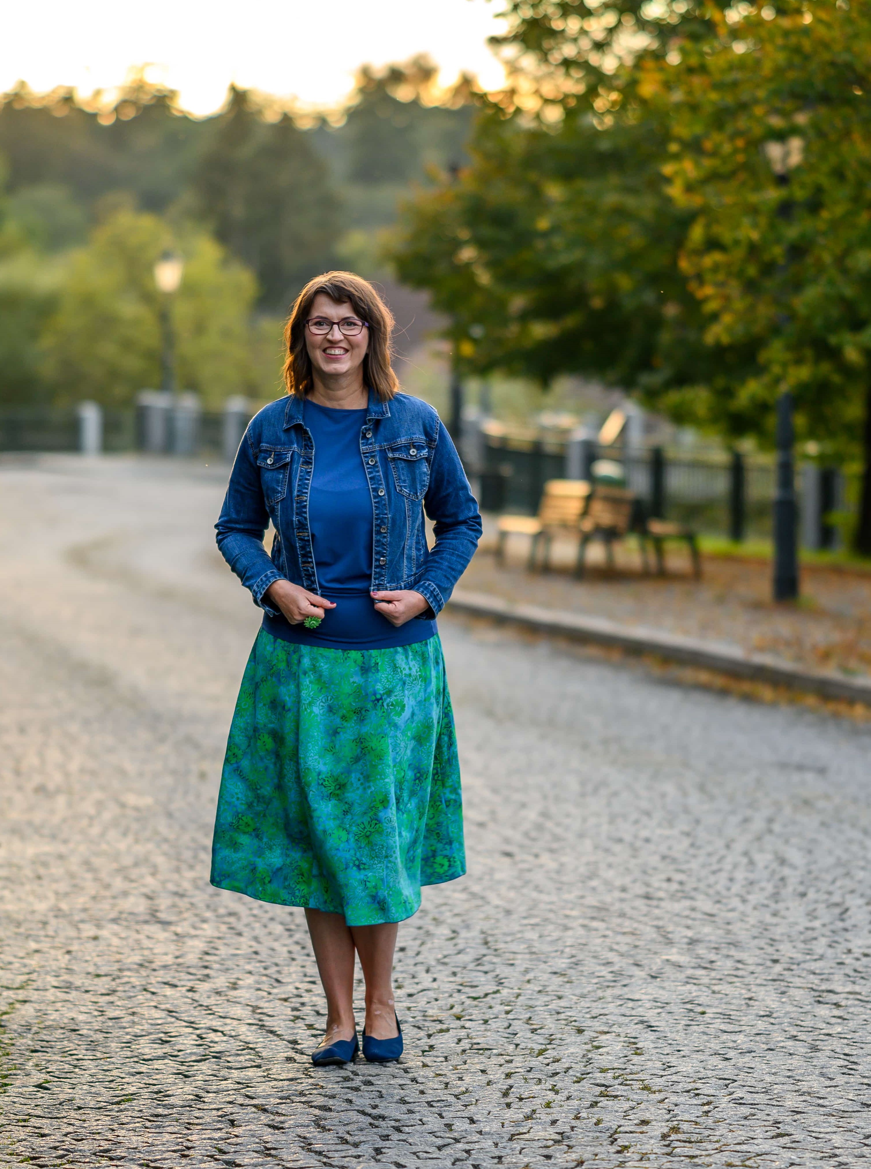 Barva sukně: paleta modrých odstínů, s květinovým vzorem světle zelené barvy