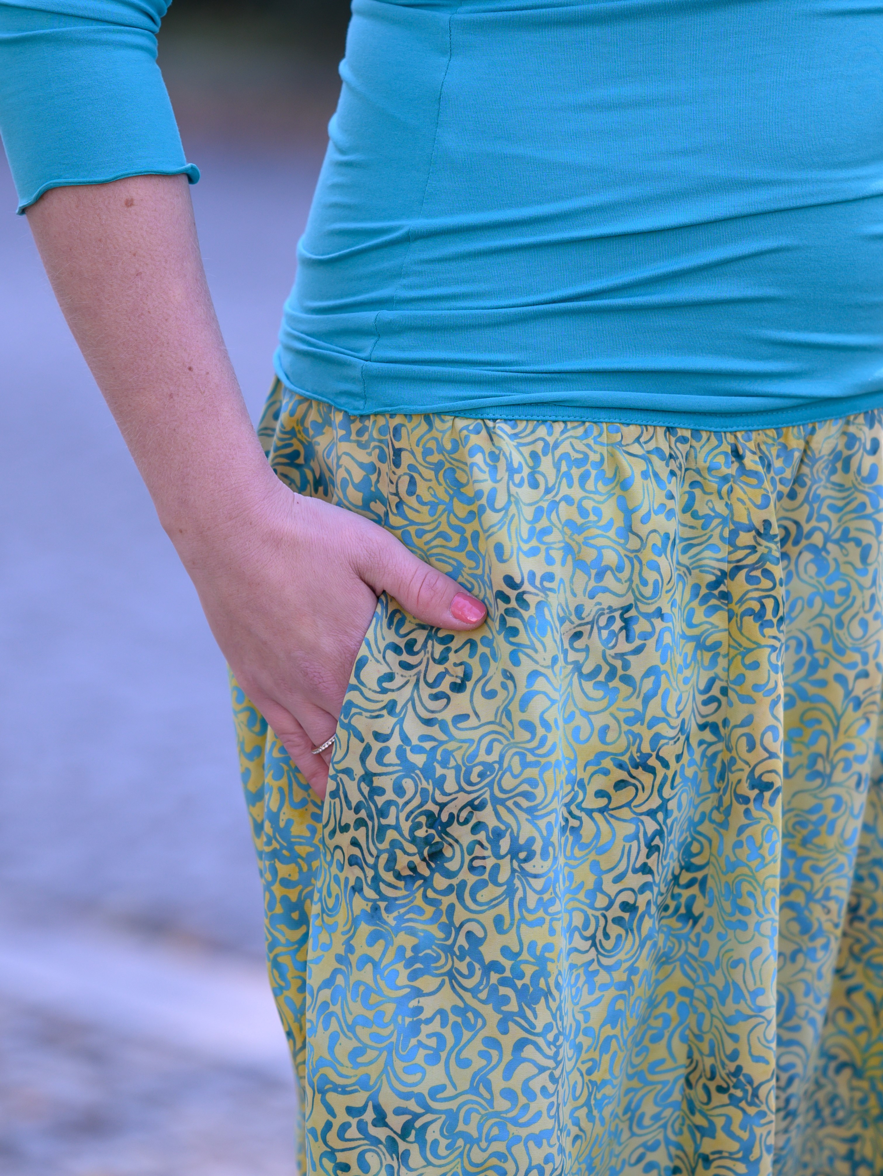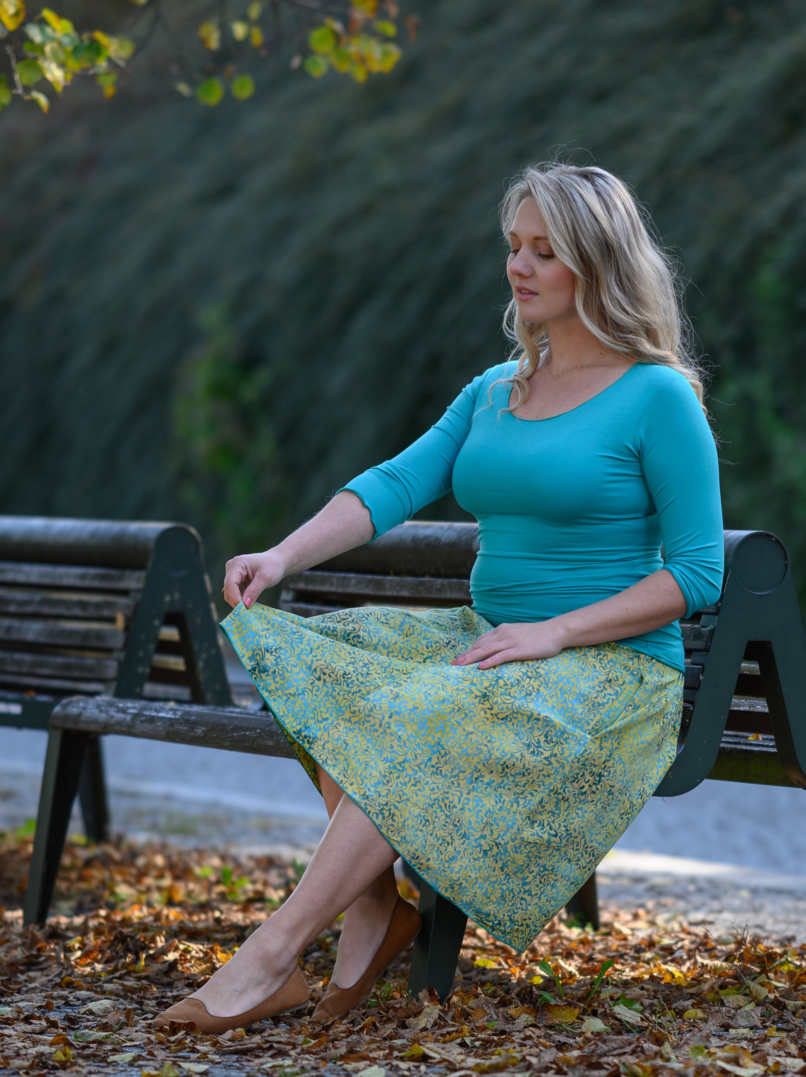 Vysoký elastický pas je nesmírně pohodlný na nošení. Sukně je vhodná i pro těhotné, pružný náplet v pase se krásně přizpůsobí bříšku a obejme ho po celém jeho obvodu. Ikonická Pacha sukně s délkou na dlaň pod kolena vytváří ženskou siluetu, je pohodlná a stylová zároveň.