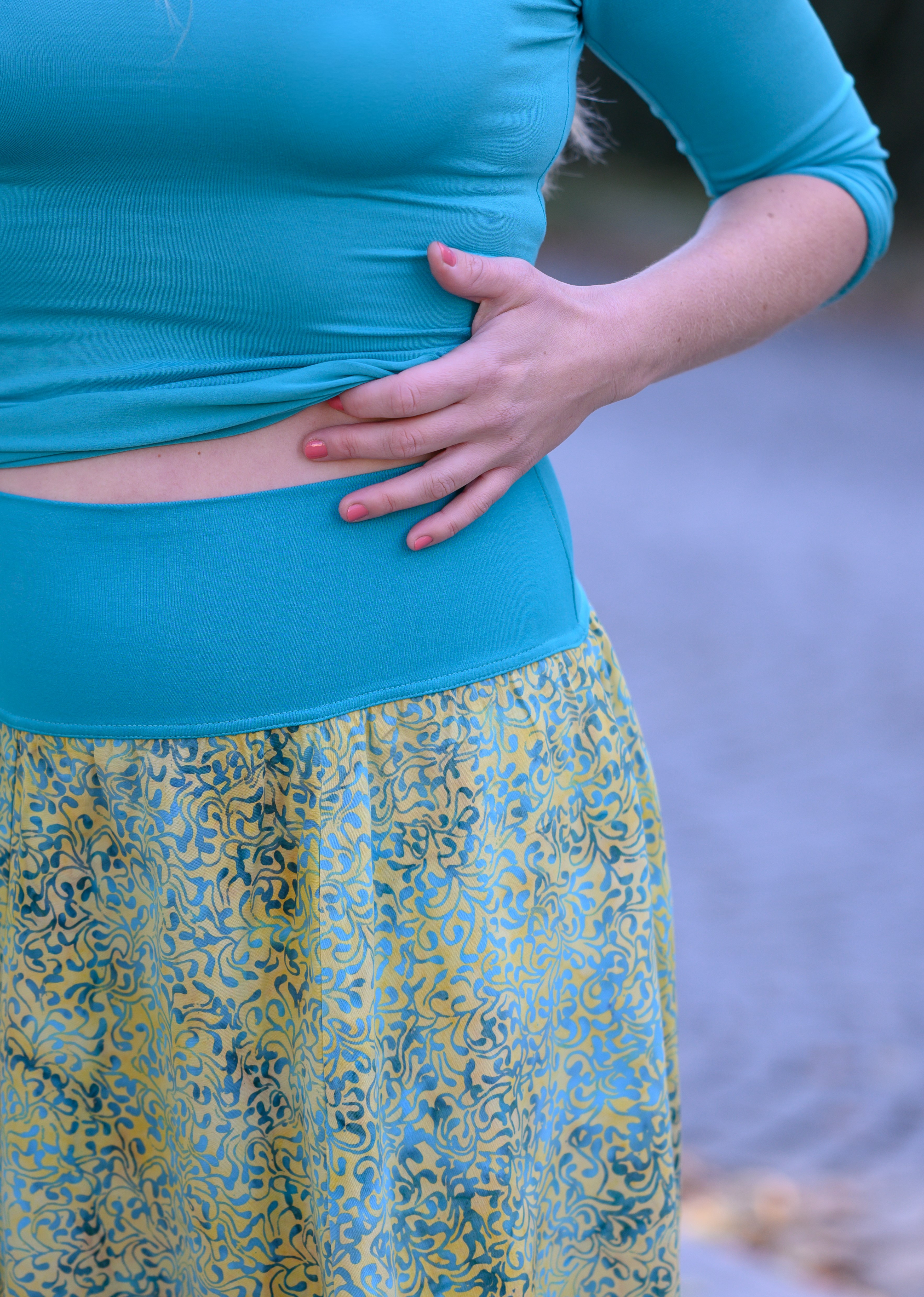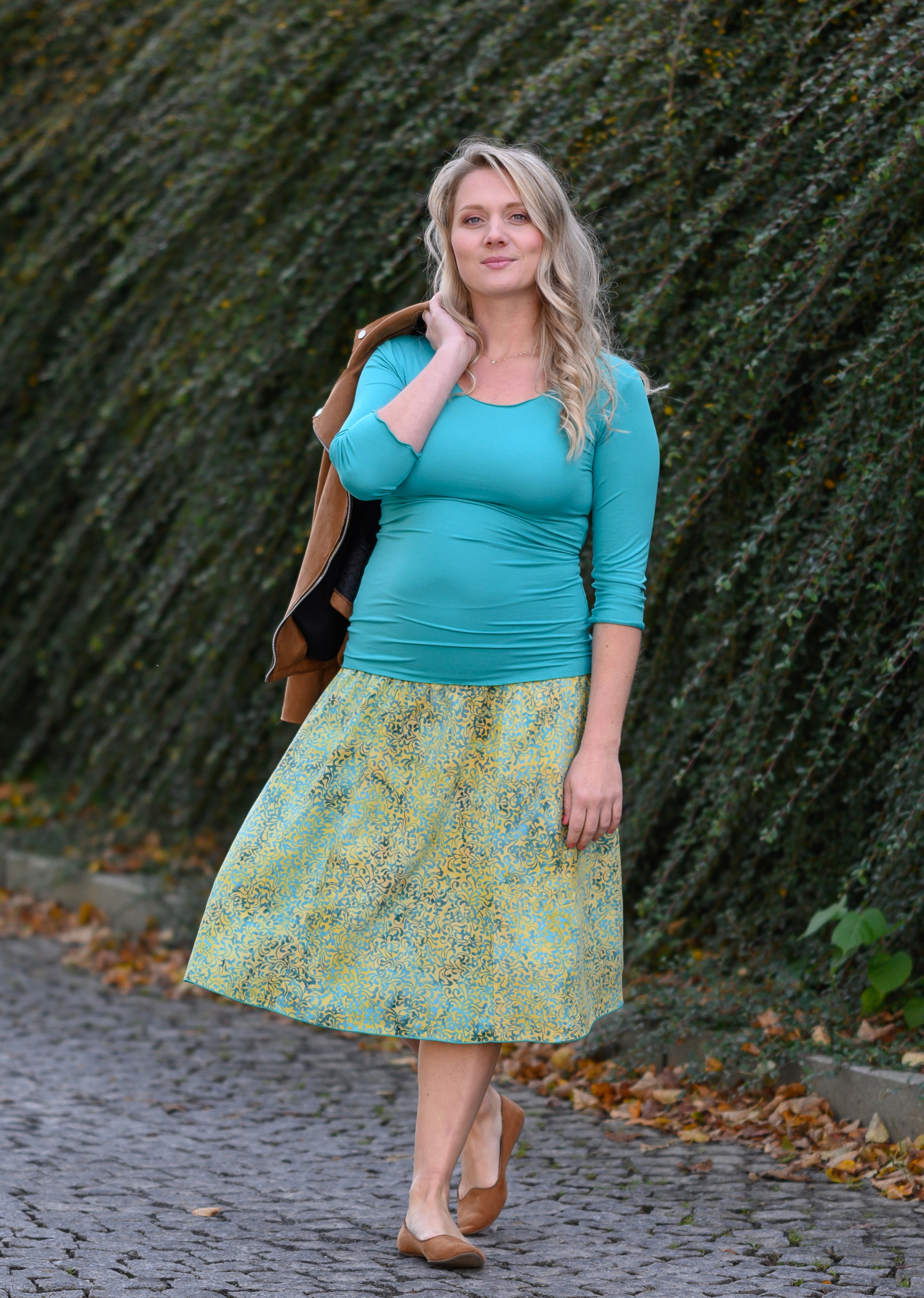 Barva sukně: světle limetková s jemným vzorem v tyrkysové