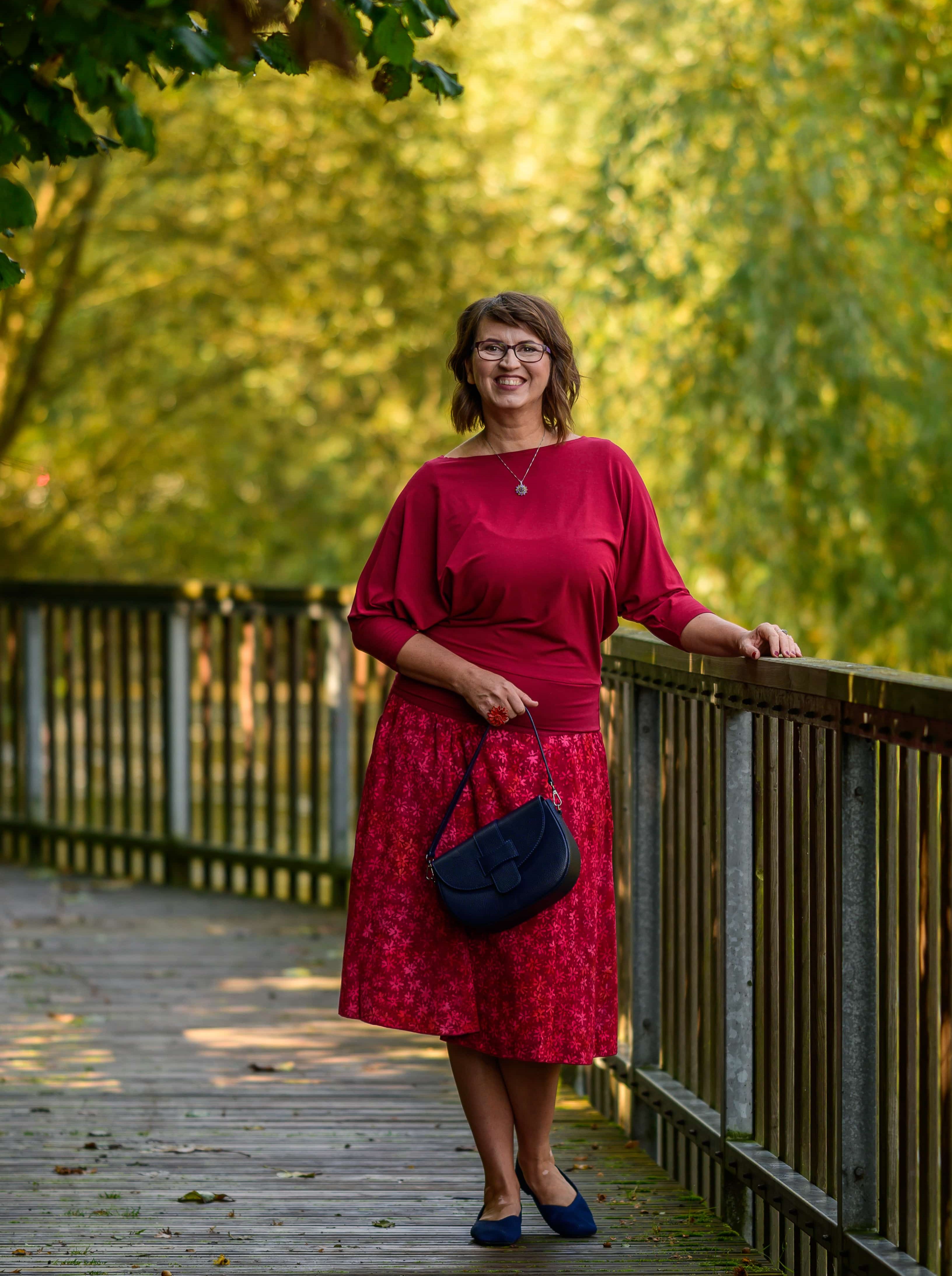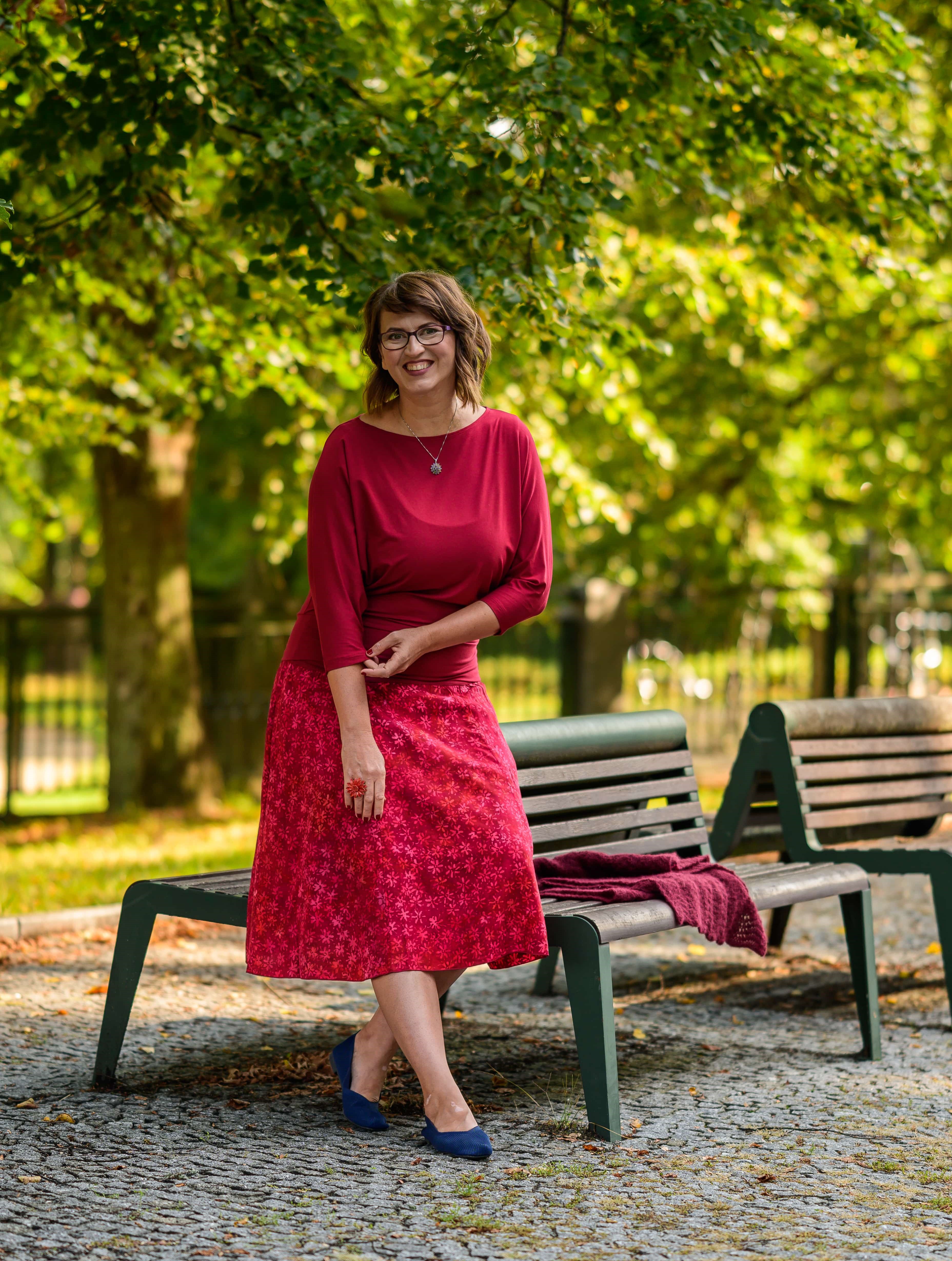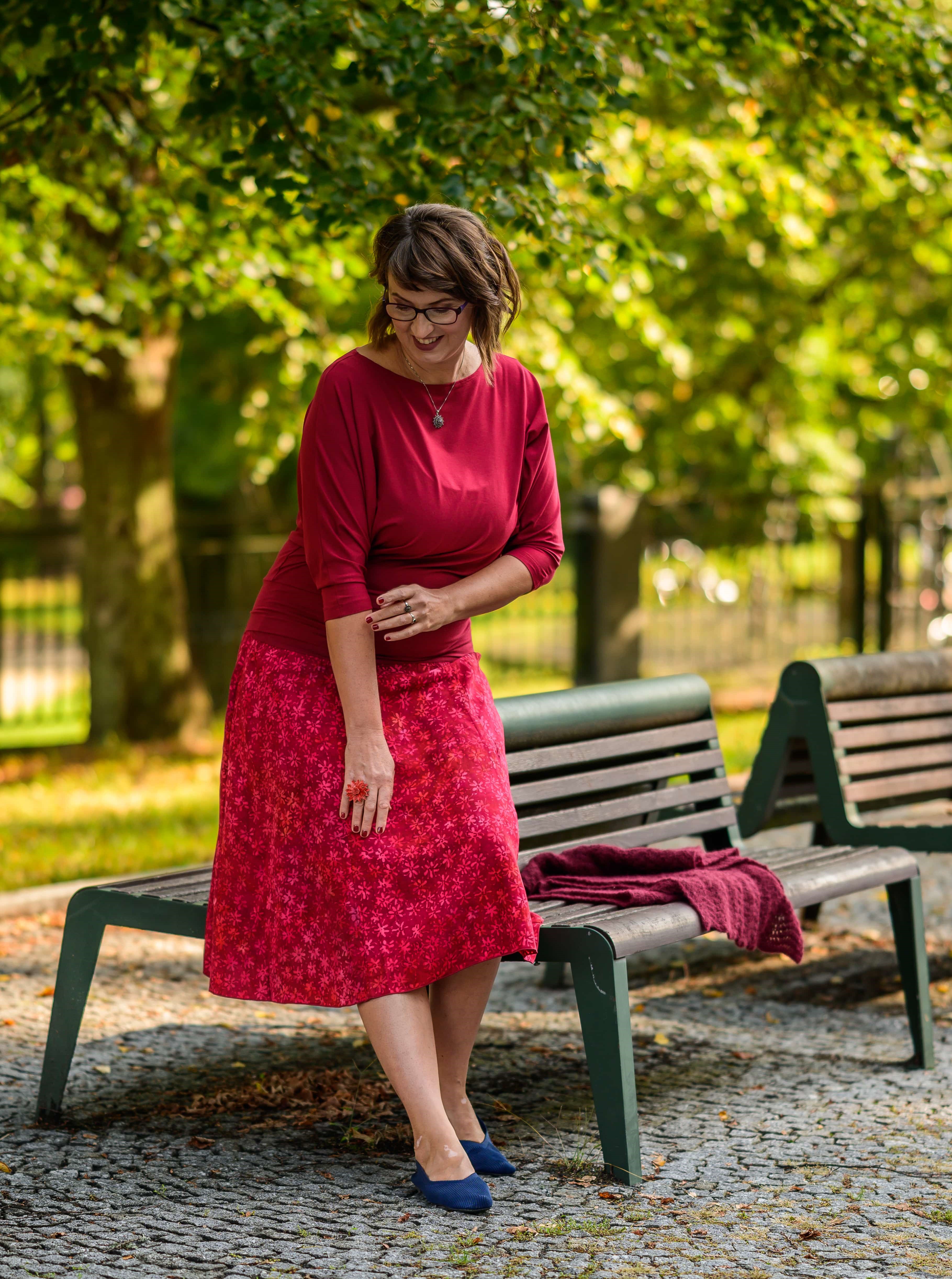 Barva sukně: vínově červená a ve vzoru světle červená, lososová